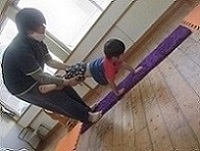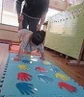 手押し車では、いろいろな障害物を置いたり、バーを越えたり、手形に合わせて進んだりすることにも挑戦中です。がんばれ~!!