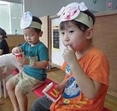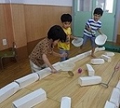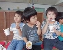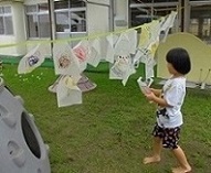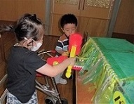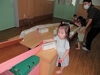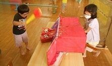 この他にも、バランスボールを使ったボーリングや、お面、手作り出店コーナー等がありました。いつもはできない遊びに子ども達も楽しんでいました。来年は、もっと楽しい夏のお楽しみ会ができるといいなぁと思っています。