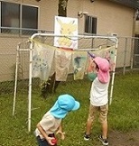 園庭には、たくさんの的がい~っぱい。水鉄砲等の道具を使って、敵をやっつけます!的に近づいてよ~くねらってね!!的が倒れたり、やぶれたりしたら、みんなの勝ち!(^^)!
