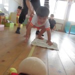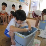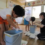 乾拭きぞうきんや濡れ雑巾で挑戦です。雑巾を両手で絞るのはちょっぴり難しいけど、ギュッと力を入れて絞ります。雑巾がけは、腰を上げて膝を付かずにできるかな?