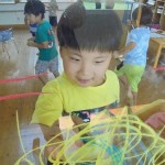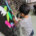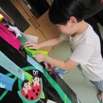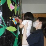 願い事を書いた短冊を笹の葉の壁面にペタン。どこに貼ろうかな、ここにしよう!と自分で貼ったり、先生に抱っこされて貼ったりしました。みんなの願い事が叶いますように・・・。