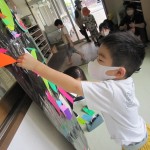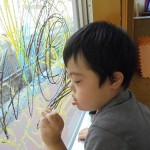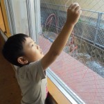 紙に描くお絵描きとは違う楽しさがあります。お絵描き後は、みんなで窓を拭いて、きれいにお掃除をします。