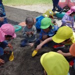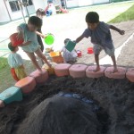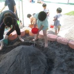 砂場では、山を作ったら周りに溝を掘って、水を流してみよう!! もっと水を入れなくちゃ!と水道と砂場を何往復もしている子ども達です