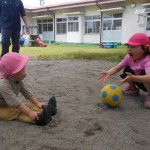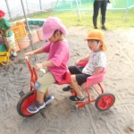 一緒に遊ぼう!と三輪車に乗ったり、ボールで遊んだり。クラスが違うお友だちとも遊ぶ姿が多く見られます。
