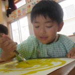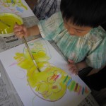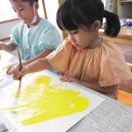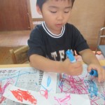 画用紙いっぱいに色を塗り重ねます。分厚い画用紙なので、子ども達が力いっぱい塗っても破れません!!