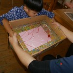 箱を動かすとビー玉が動いて模様がつく様子をじっと見ています。ビー玉コロコロ面白いね。