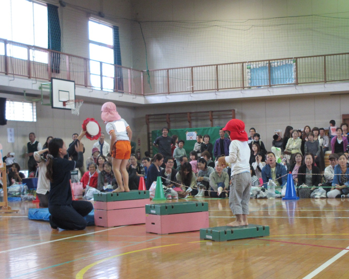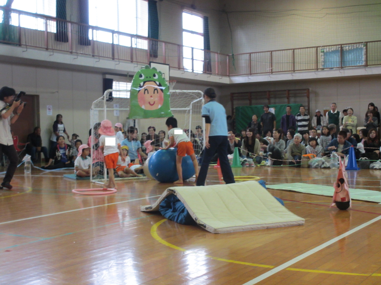 続いては、「クラス団技」の様子を紹介します。 障害物を乗り越えながらボールを運んだり、跳び箱をのぼってジャンプをしてタンバリンを元気よく叩いたり、「ソーラン節」を踊ったクラスもありました。この他にも、アンパンマンの顔を作ったクラスや忍者に変身したクラス、トトロに果物を届けたクラス等、いろいろな子ども達の姿が見られました。
