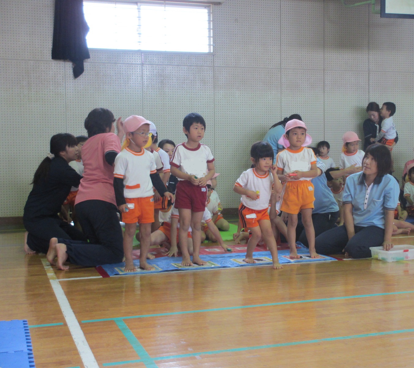 まずは、「かけっこ」です。ドキドキした表情を見せながらも、名前を呼ばれると大きな声で「はーい」と返事をしてくれたり、ちょっぴり緊張して先生やお友達の後ろにかくれんぼする子も・・・。スタート後は、ゴール目指してがんばって走りましたよ(*^_^*)