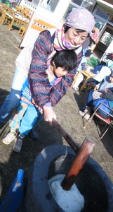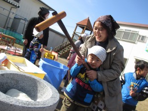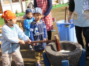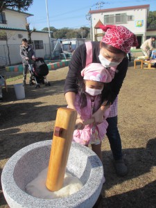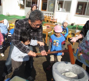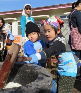 まだまだ出来上がらないときは、力持ちのお父さんの出番です!!大きな杵を使って、ぺったんぺったん・・・。お父さんたちのパワーに、子ども達も近くまで走って行き、見つめていました。