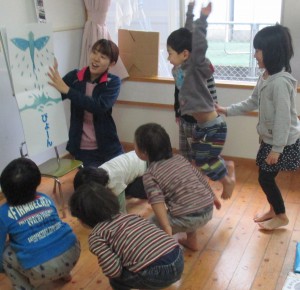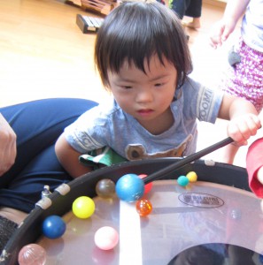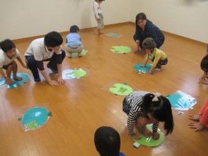 音楽あそびでは、カエルになってジャンプ、太鼓の上のボールを弾ませたり・・・・