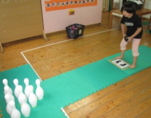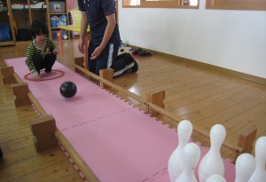 下の写真は、ボーリングあそびの様子です ボールが横にそれないようにガードを付けたり、立つ場所に足形や輪を置いたりすることで、子ども達ができるだけ一人で挑戦できるようにしています