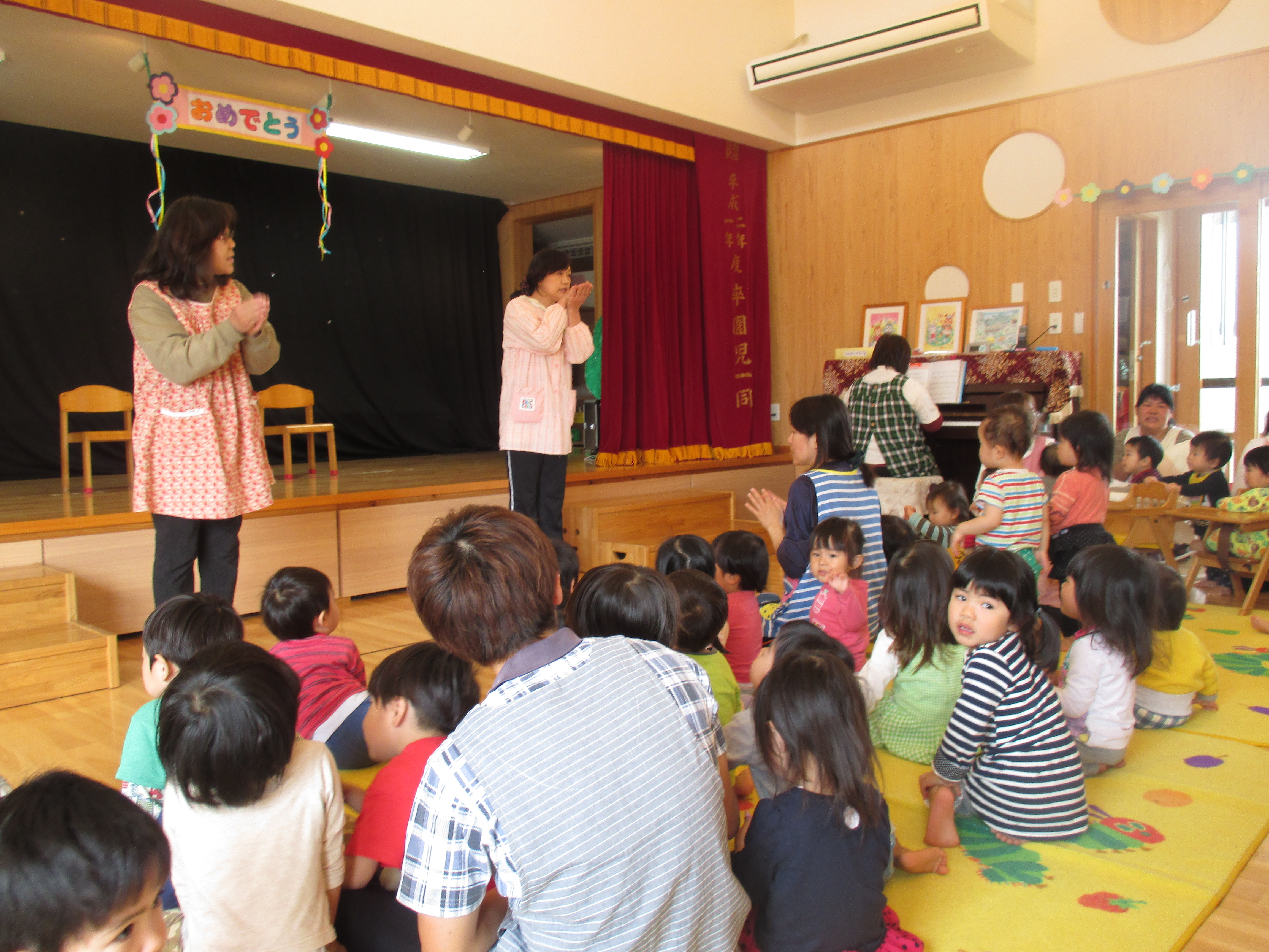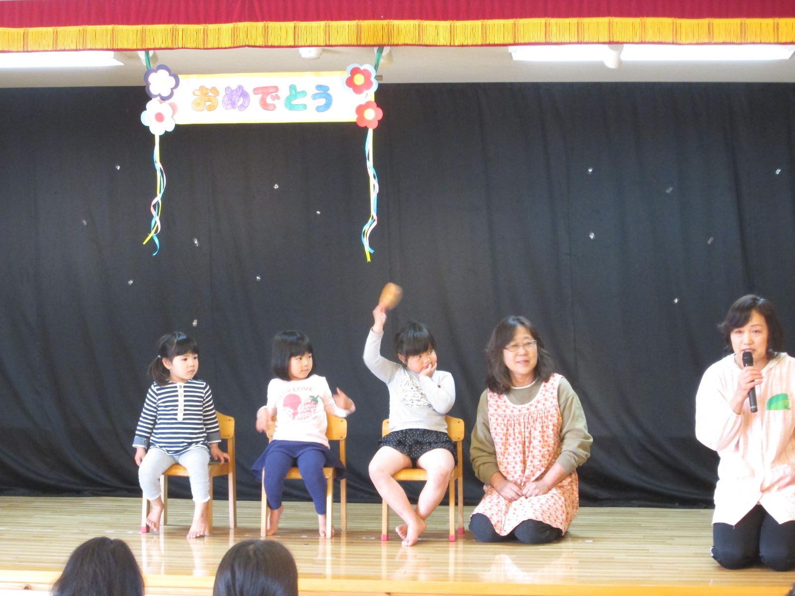 4月誕生会 4月20日(水) 誕生会に参加しました。春の歌を歌ったり,、保育士による人形劇を見て楽しみました。 お友達から「お誕生日おめでとう。」と声をかけられ、「ありがとう。」と大きな声で返事ができました。皆から拍手をしてもらい笑顔あふれる楽しいひと時でした。 誕生会ランチのハヤシライス、とても美味しそうに食べていました。
