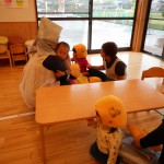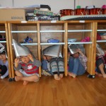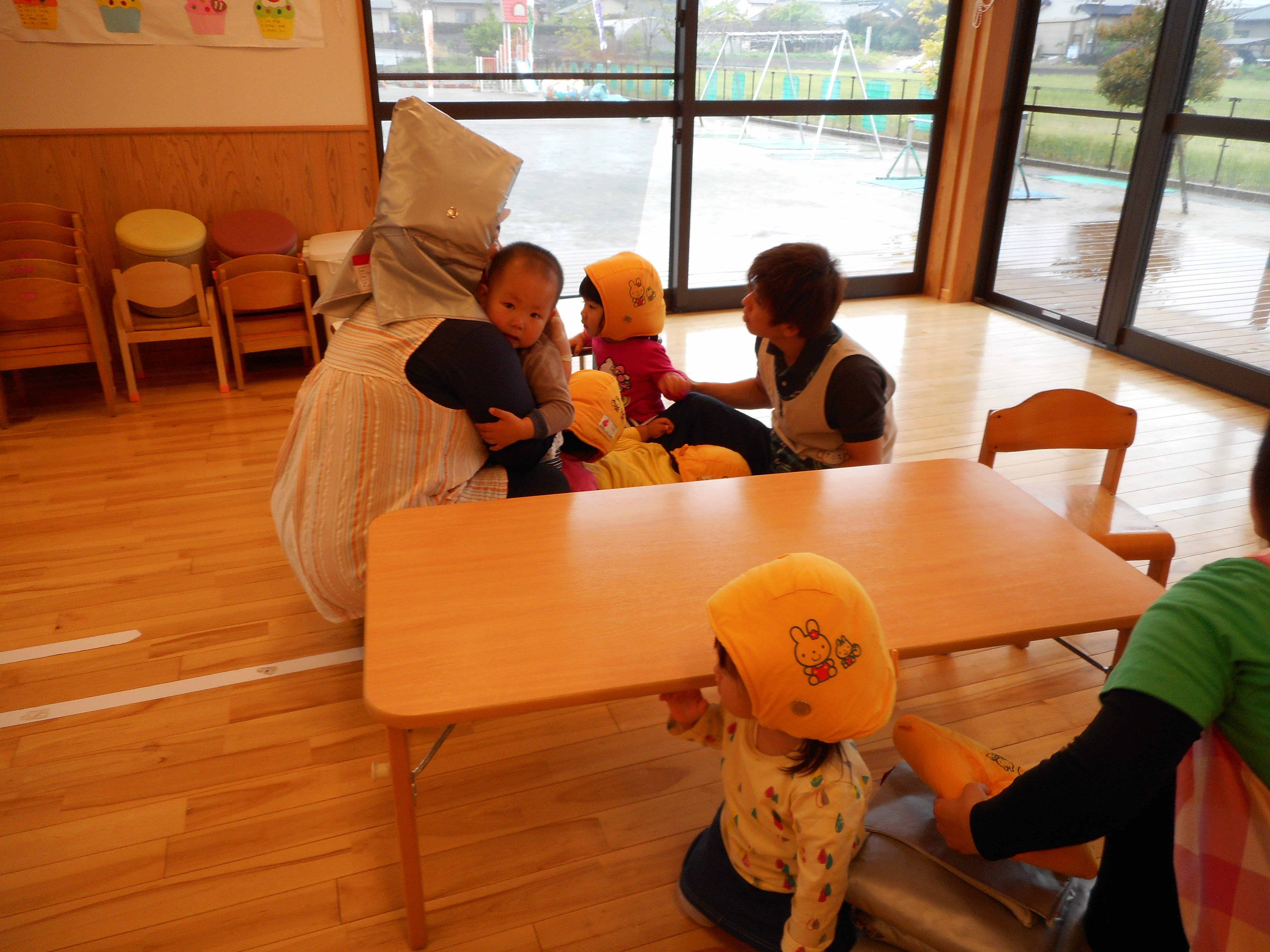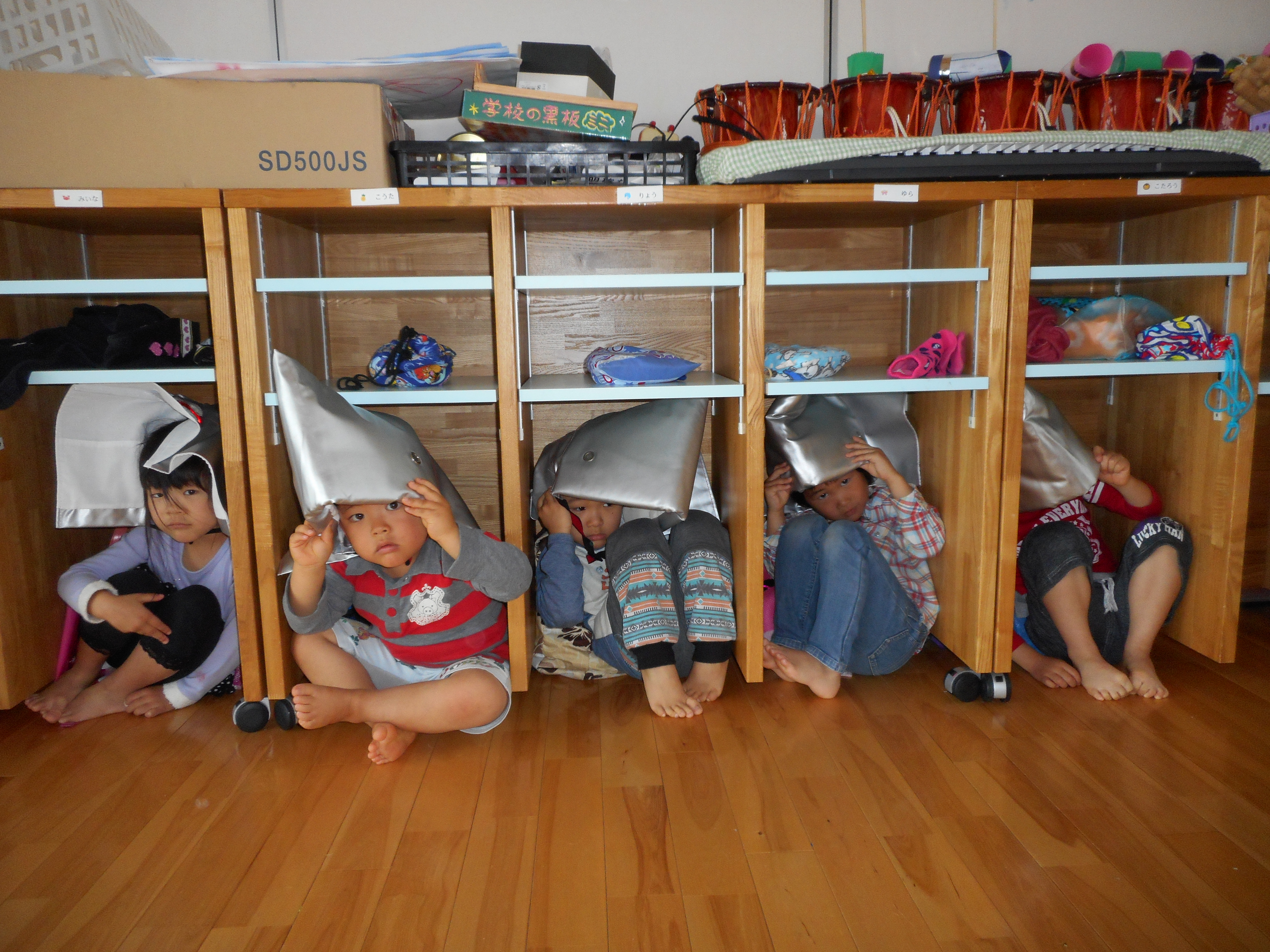 4月避難訓練 4月21日(木) 震度3~4程度 津波なしの地震が発生したとの想定で訓練を行いました。 地震発生の放送が入ると、未満児クラスの子どもたちは保育士にしがみつき、以上児クラスのこどもたちは、素早く頭巾を被ってロッカーの中に避難しました。 新年度になってから初めての避難訓練。新しい保育室での訓練でしたが、スムーズに避難することができました。