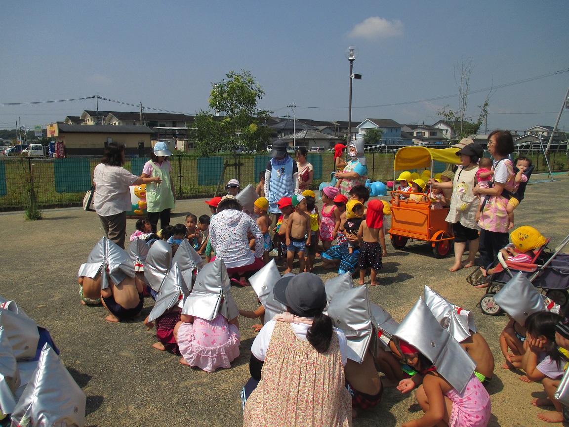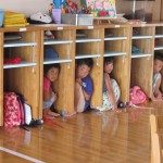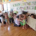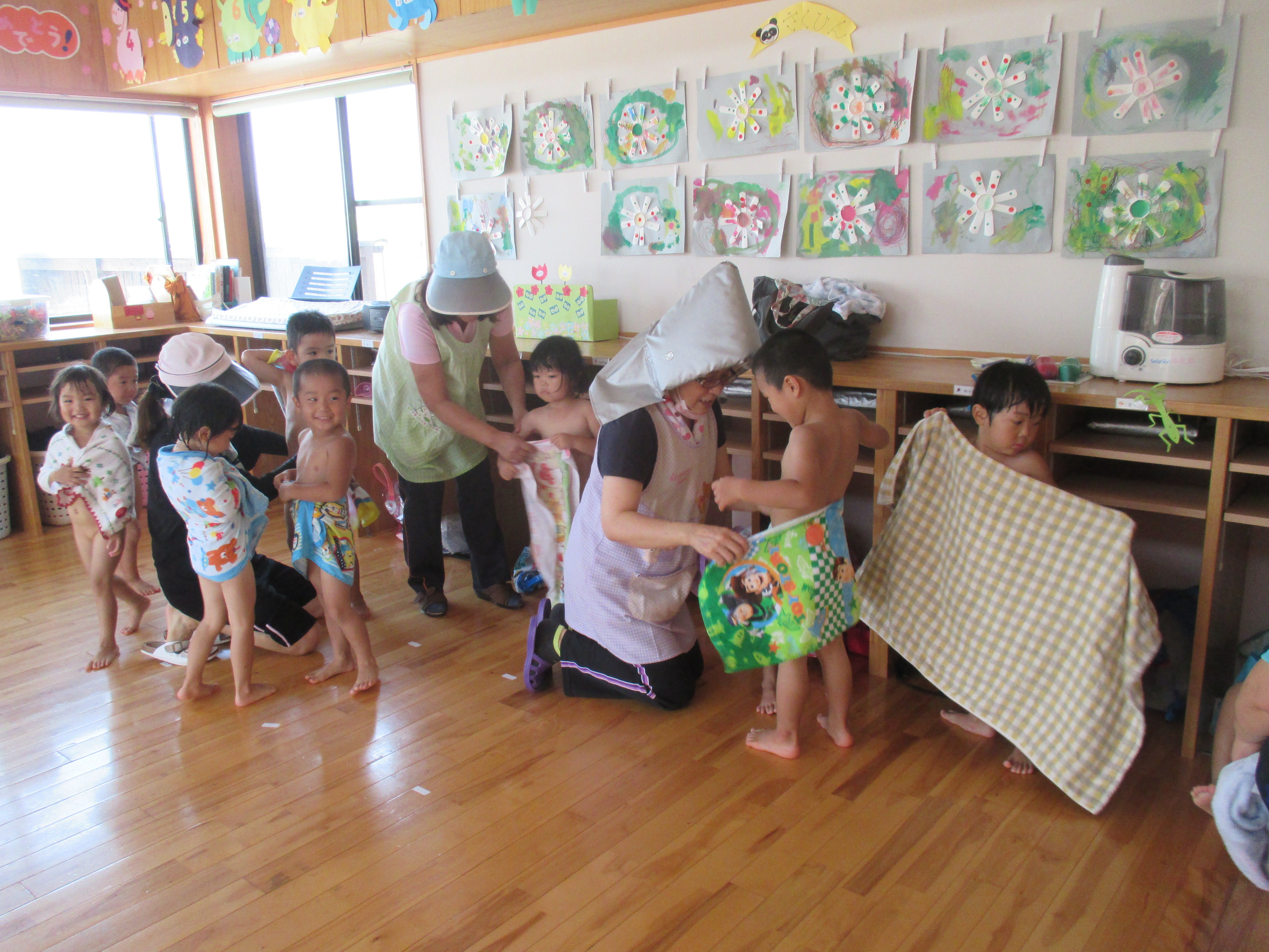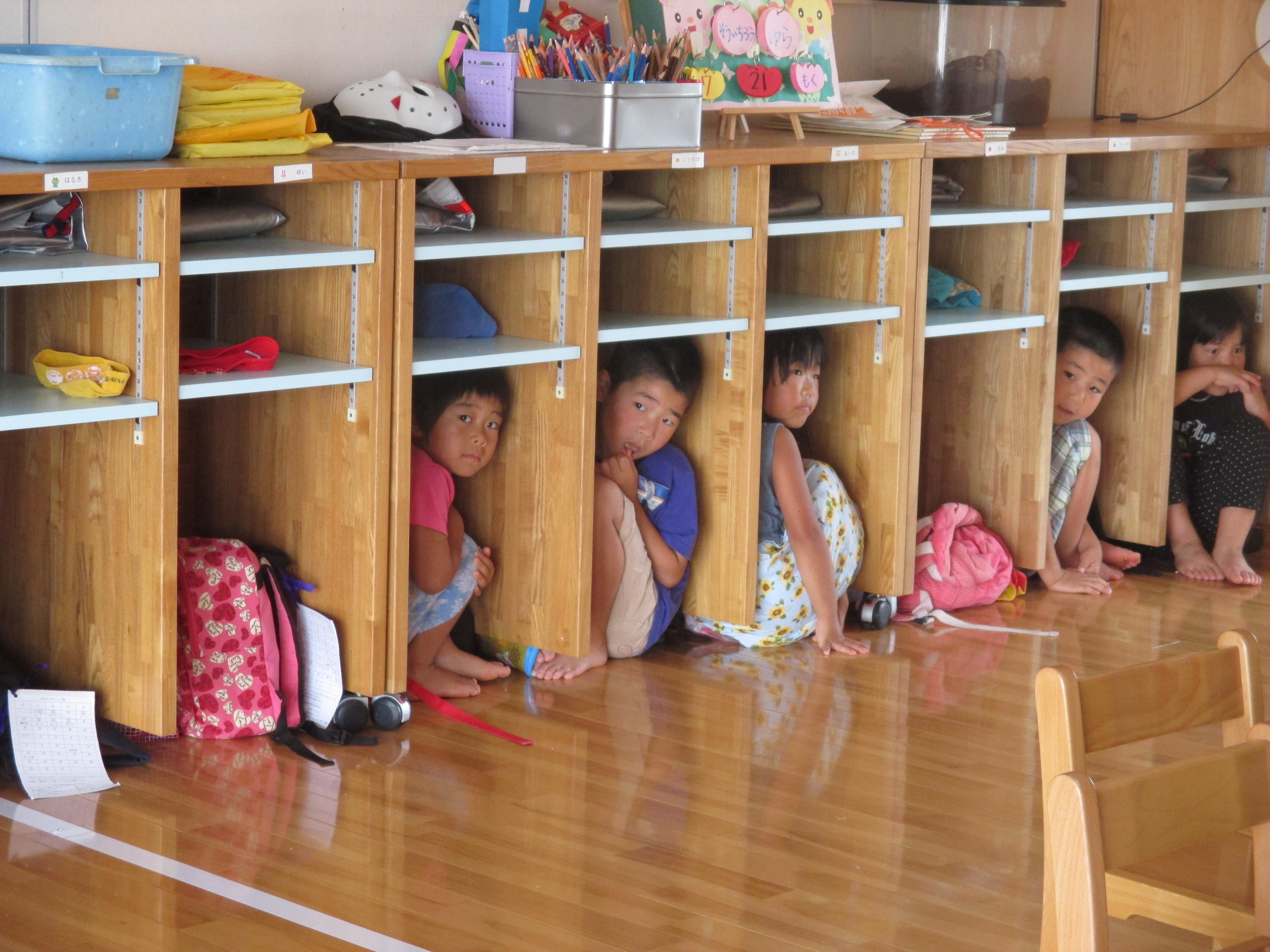 7月避難訓練 7月21日(木) 震度5~6程度 津波(1m程度)のおそれがある地震が発生したとの想定で訓練を行いました。 地震を知らせる放送が入ると、テーブルの下や棚の中に素早く避難することができました。 プール上がりで着替えをしているクラスもありましたが、担任以外の保育士が素早く駆けつけ協力してスムーズに避難することができました。