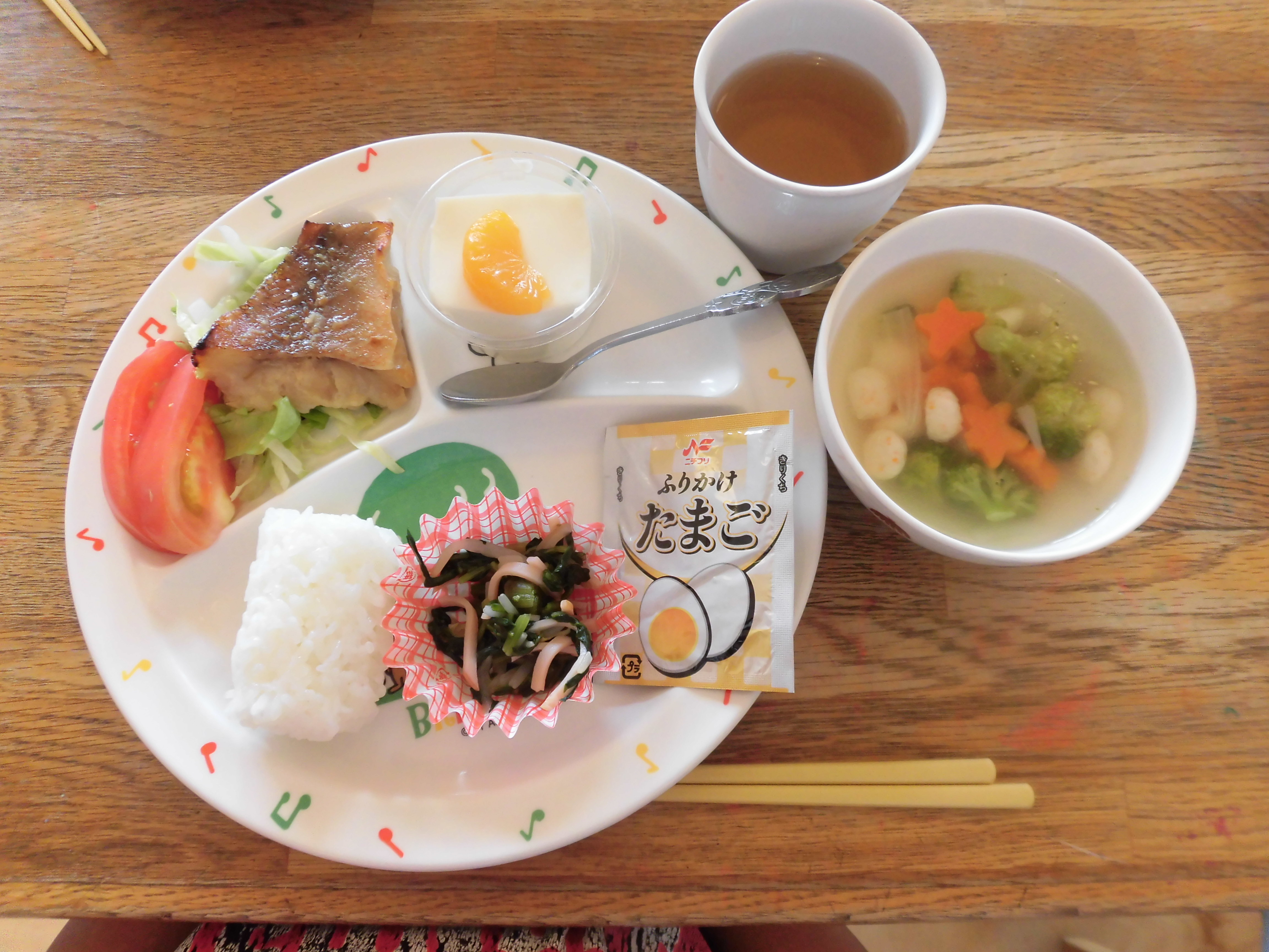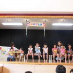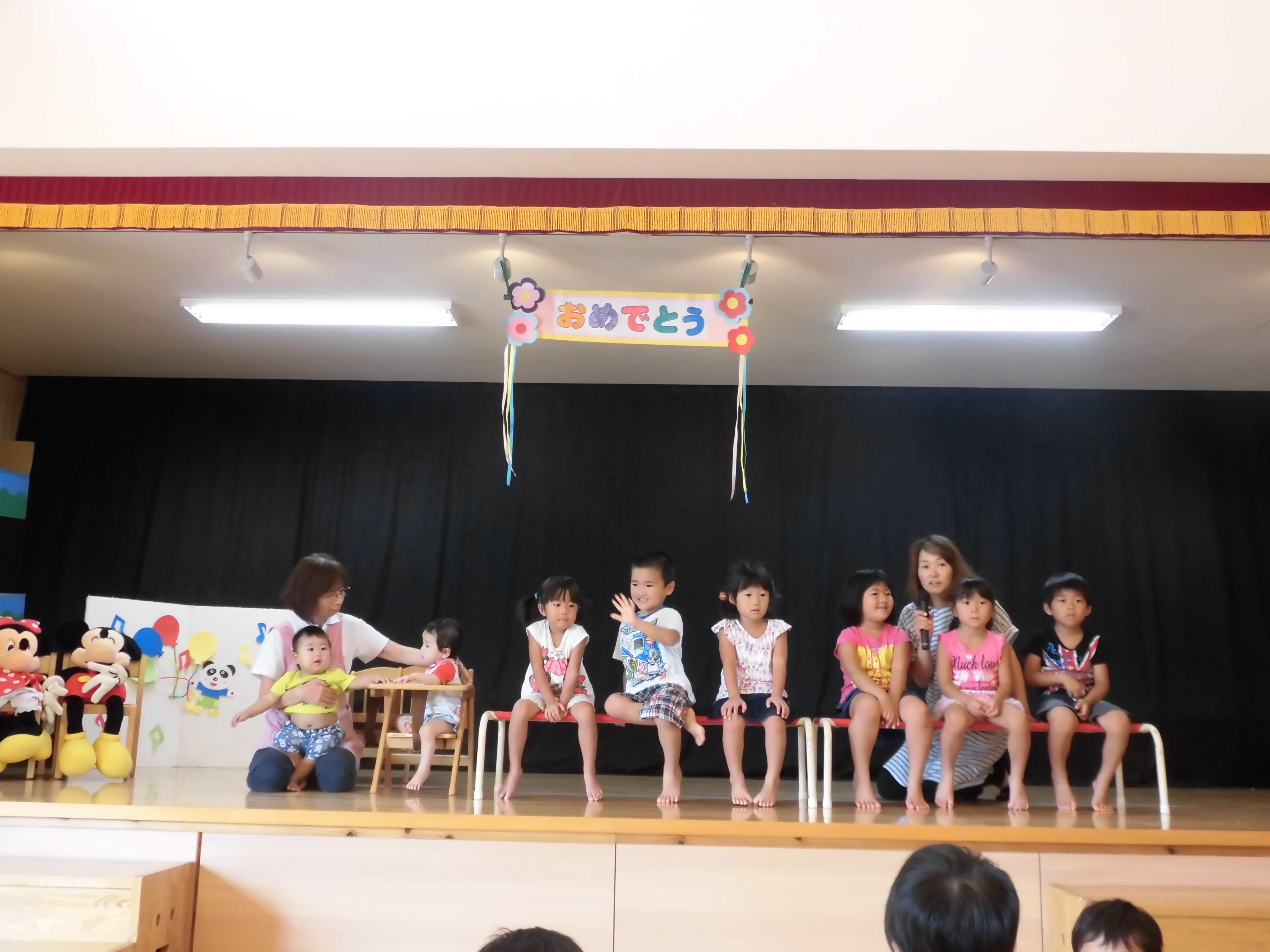 9月誕生会 9月21日(水) 誕生会で季節の歌を歌って、お祝いしました。 誕生児の子どもたちにお友達がインタビューをする場面になると少し緊張していたようでした。 最後に、保育士によるオリンピックを題材にした劇を見ました。金メダルをつけた保育士の水着姿に目を丸くし、興味?をもって集中して見ていました。「先生、頑張って!」と応援してくれ盛り上がりました。