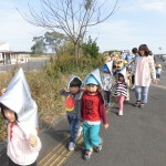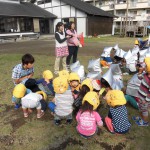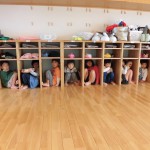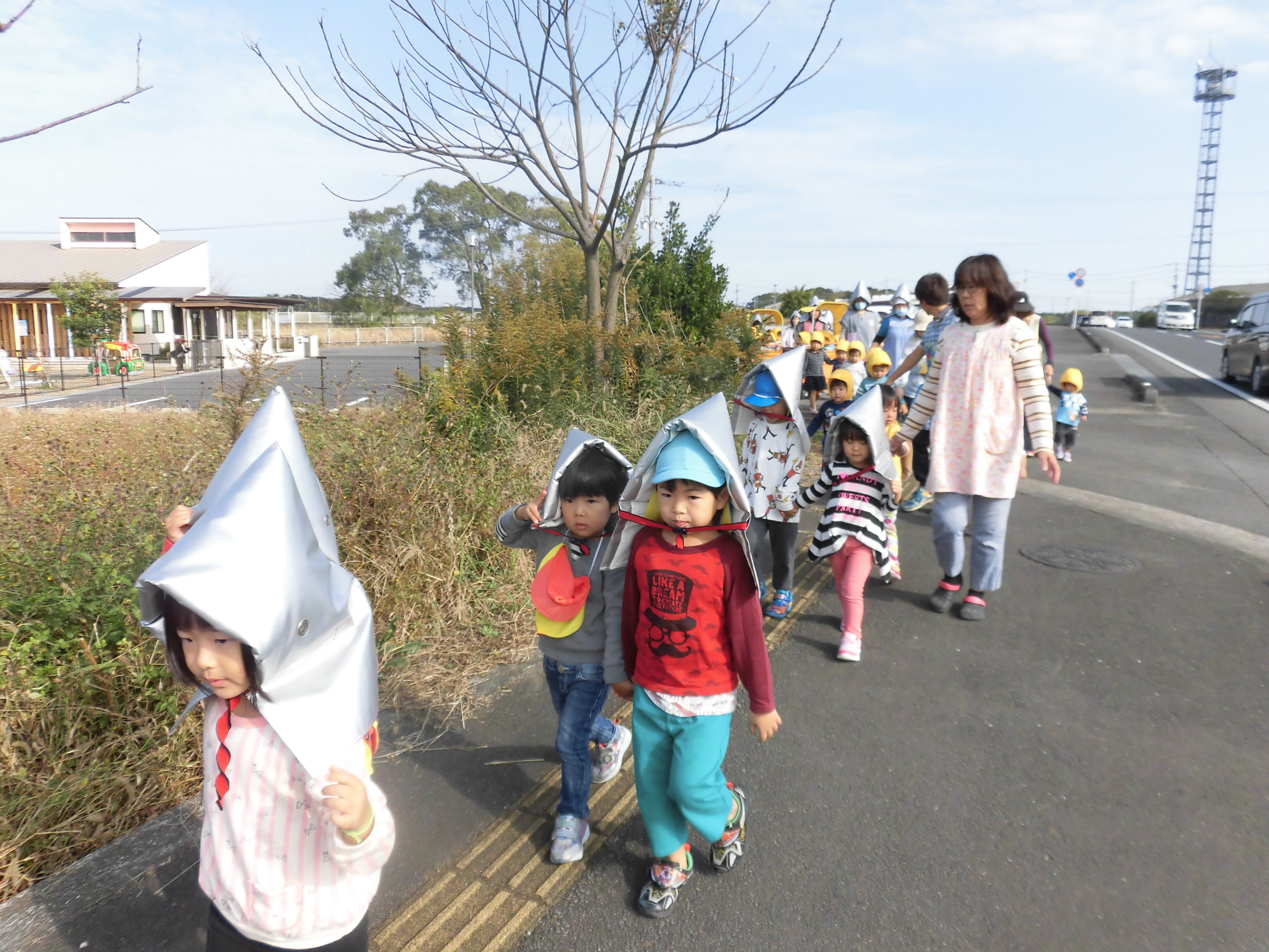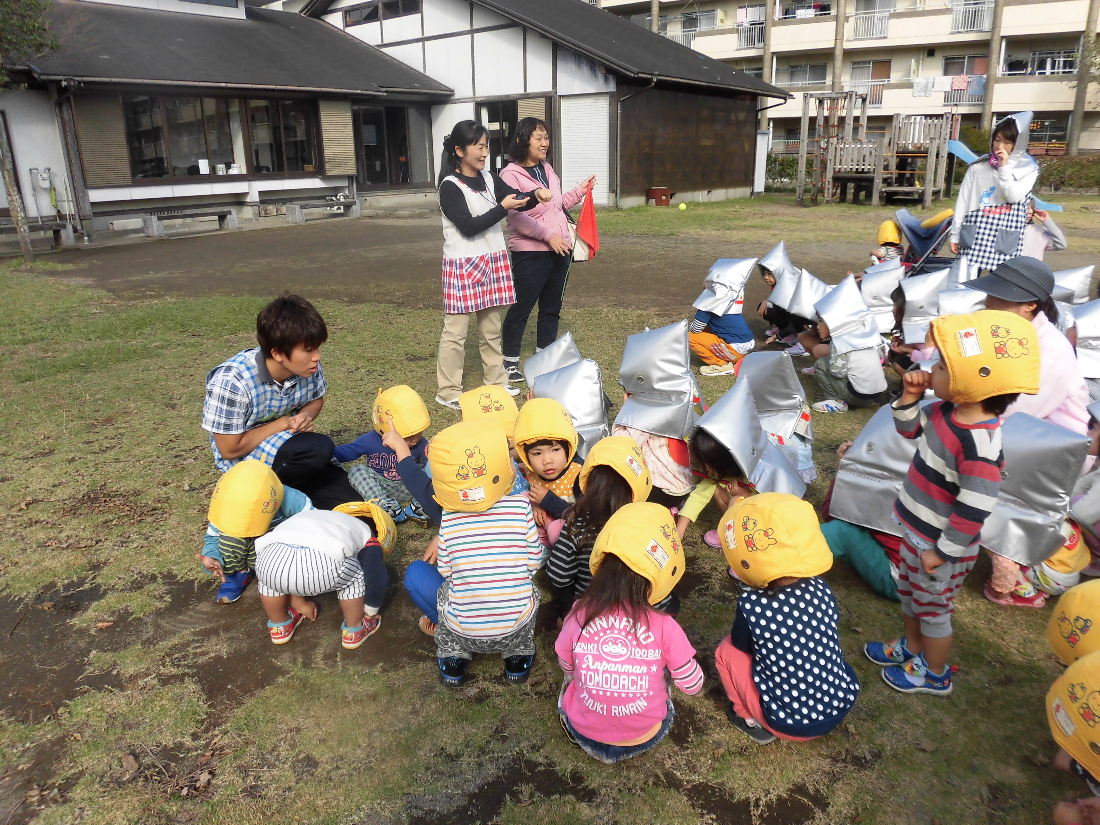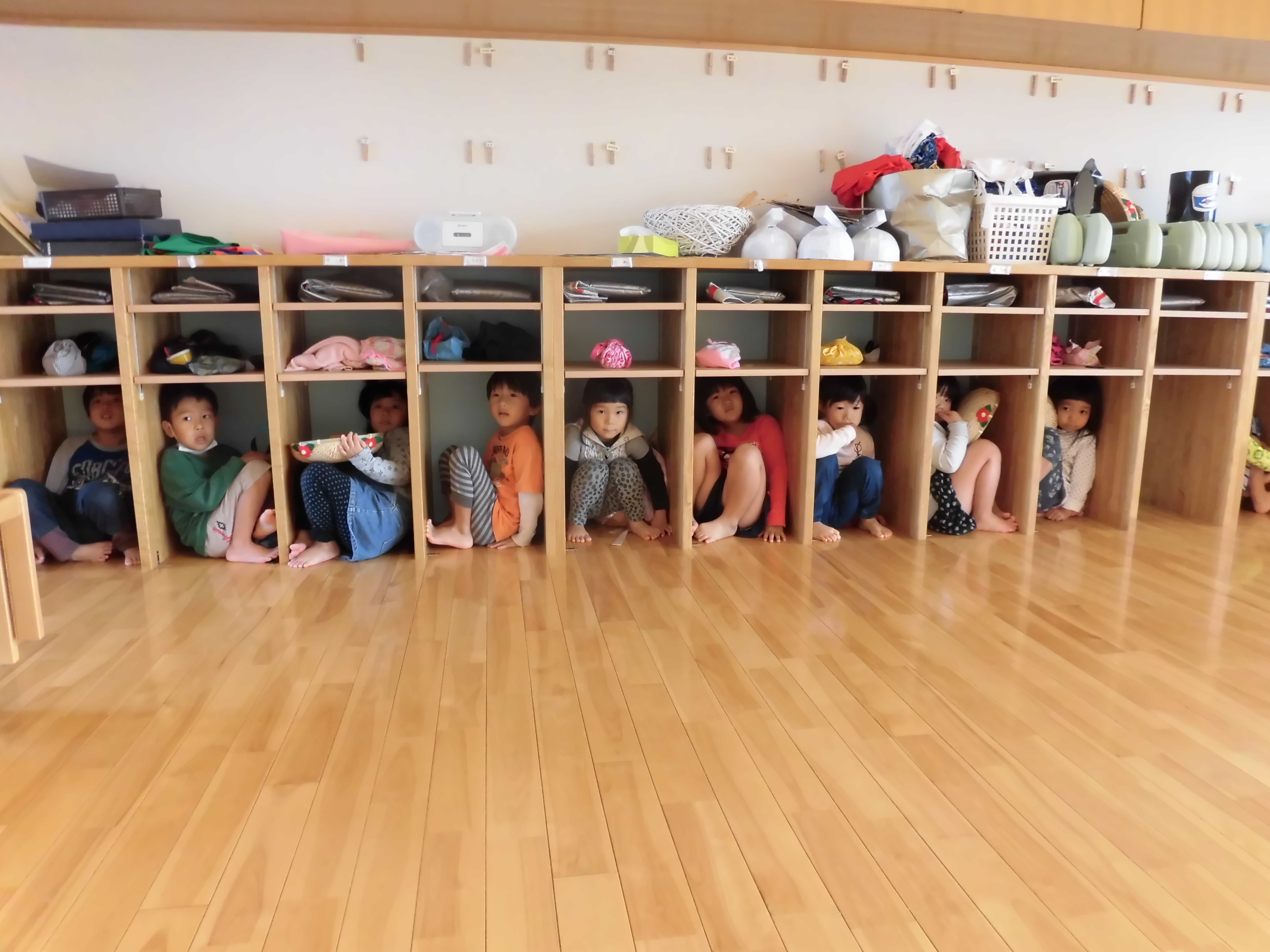 保育室のテーブル下に避難した後、防災頭巾を着用して園庭に1次避難しました。園舎に倒壊の恐れがあるとの判断で自由が丘団地に2次避難。