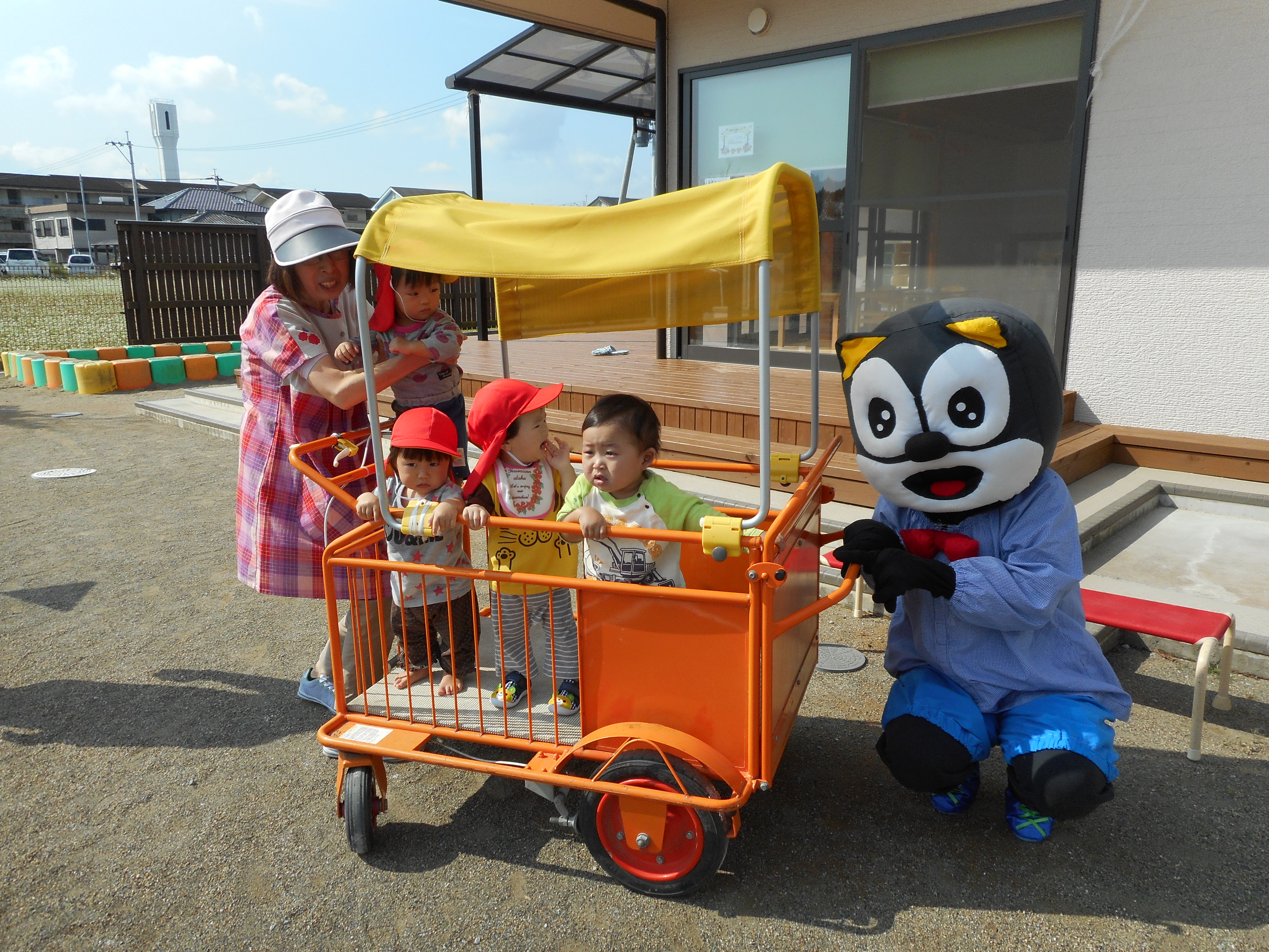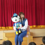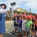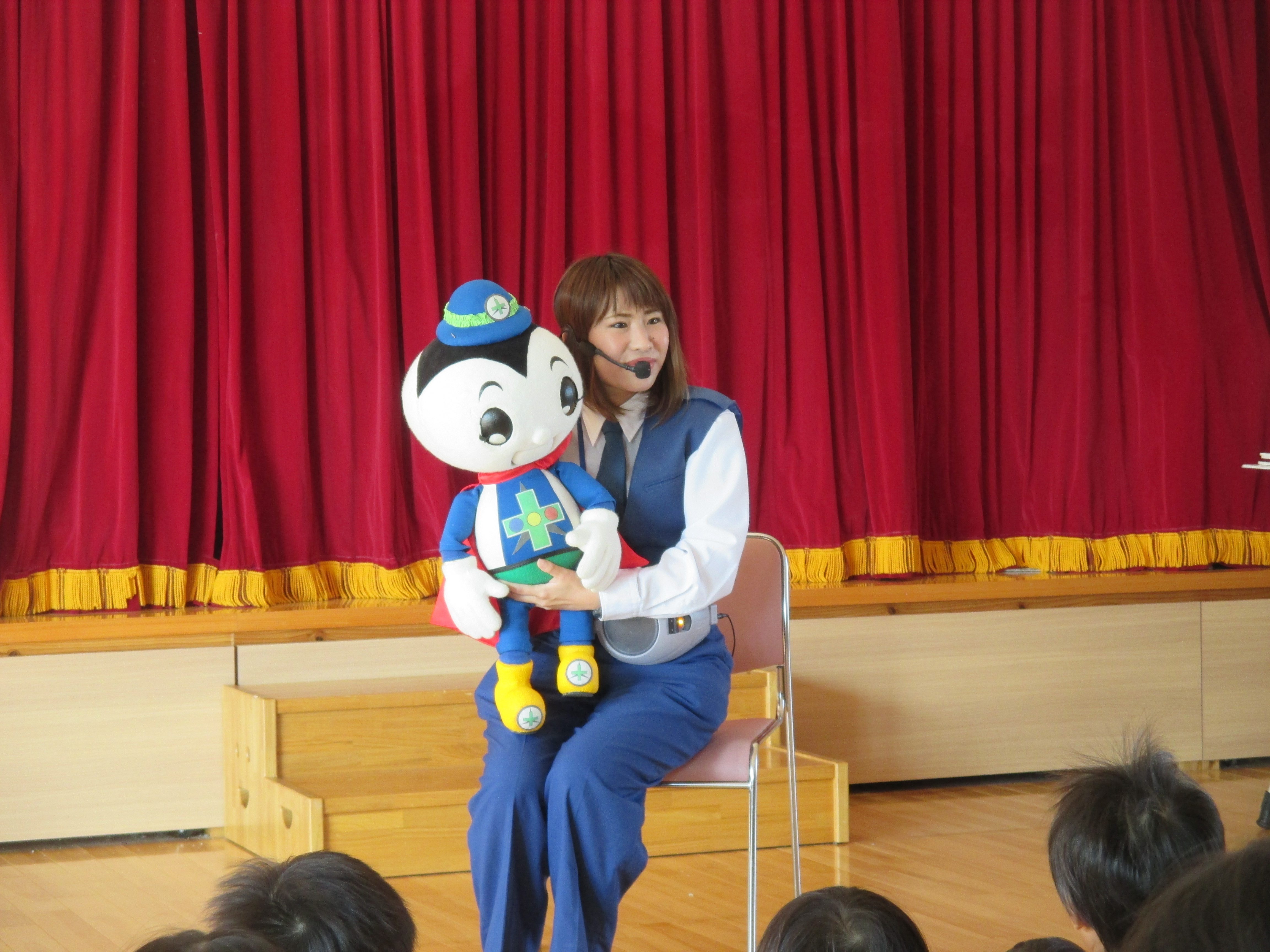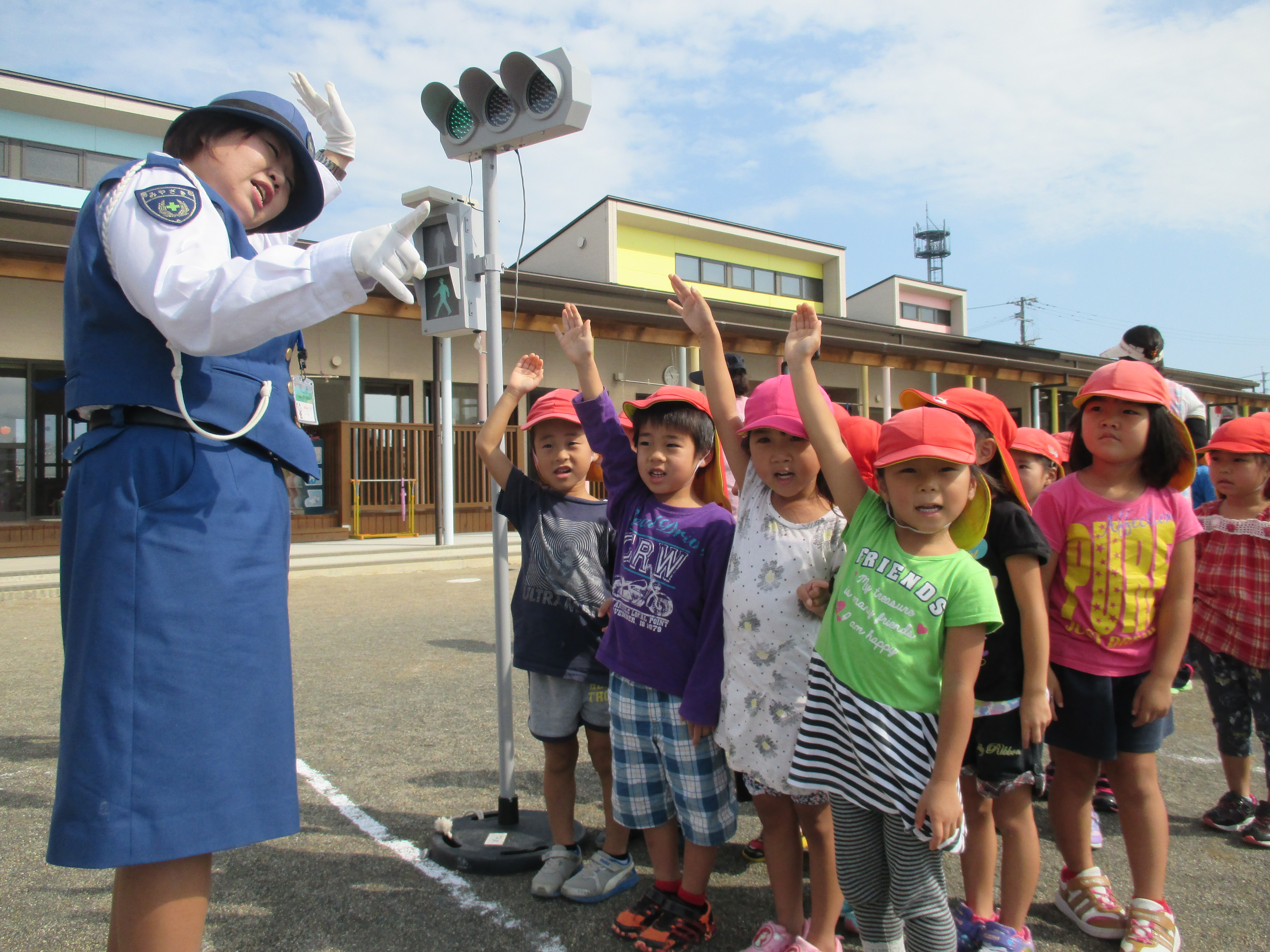 交通指導 10月26日(水) 交通指導で、指導員による腹話術(まもりん君)から信号機の見方や横断歩道の渡り方の話を聞き、交通ルールの大切さを学びました。 園庭では、実際に信号機を見ながら大きな声で「右よし。左よし。」と左右を確認しながら横断歩道を渡る練習をする等多くのことを学びました。 今回学んだことは園外保育で実践していきます。