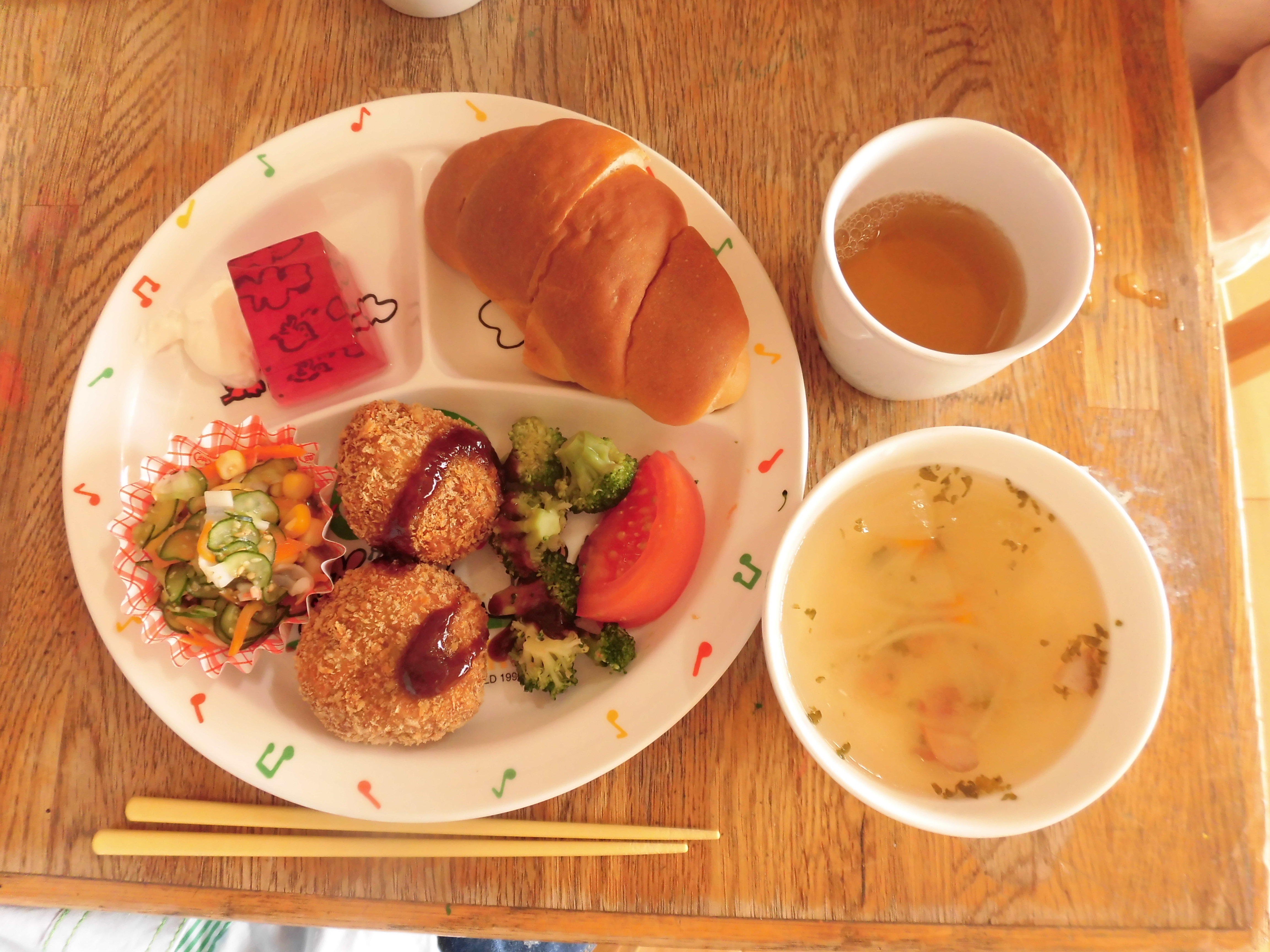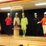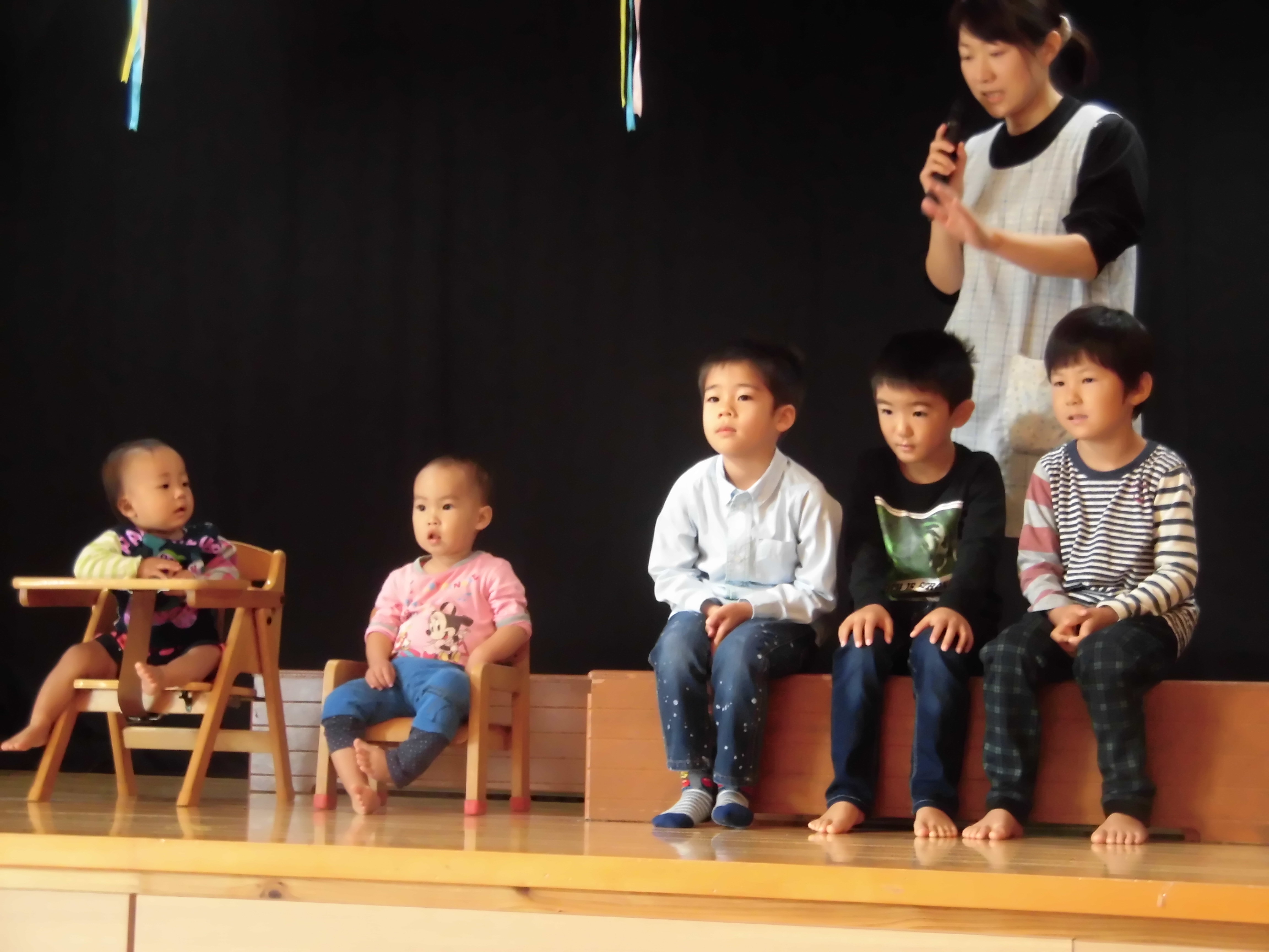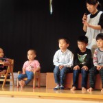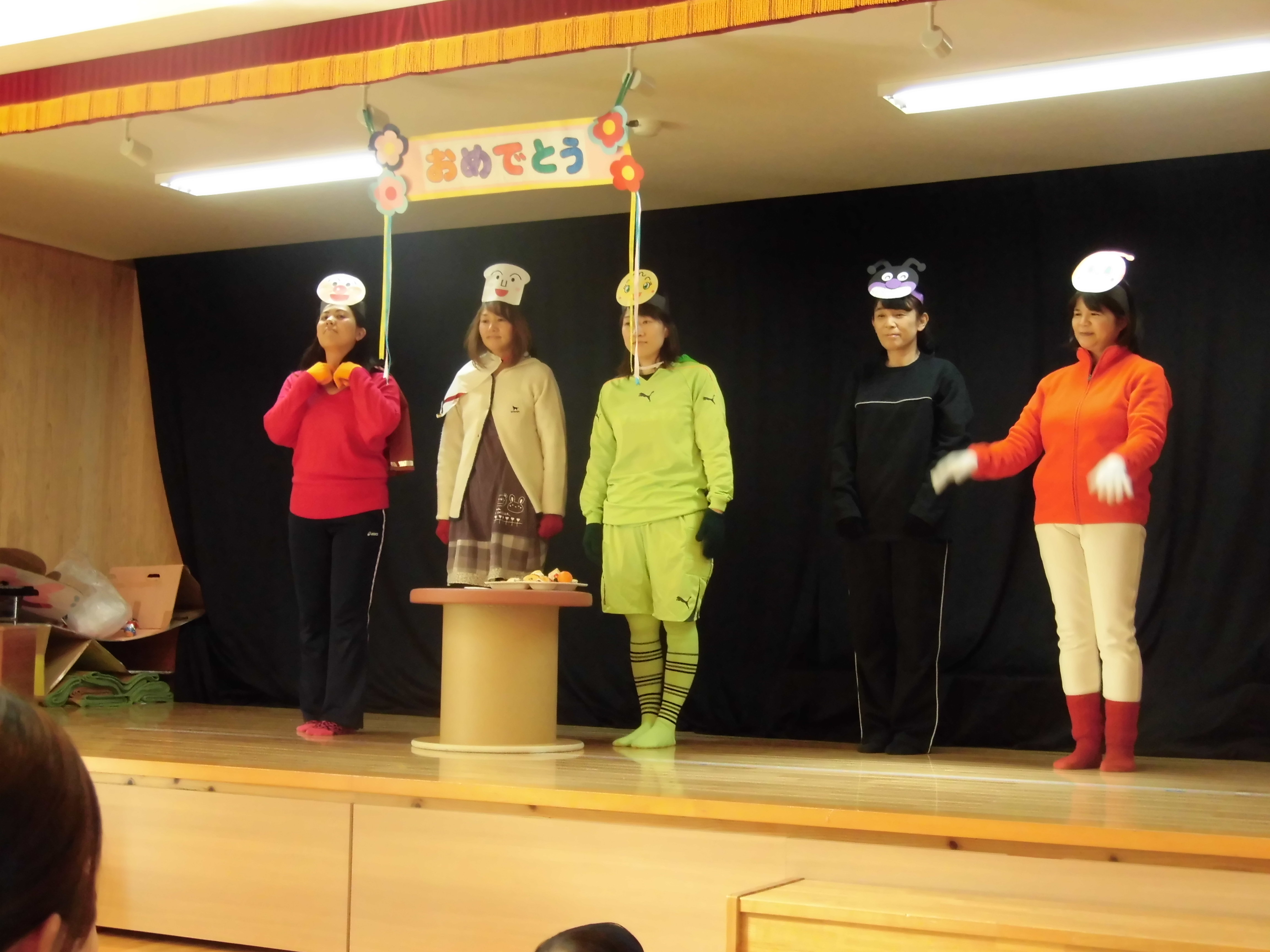 11月誕生会 11月16日(水) 11月の誕生児に「何が一番好きですか?」とインタビューをすると、「りんご」「いちご」と好きな物を嬉しそうに答えてくれました。 「お誕生日」の歌を歌った後は、職員による「アンパンマン」の劇を見ました。アンパンマンに登場するキャラクターに変身した職員を見て「ワーッすごい!」と声をあげ、集中して見ることができました。楽しかったようです。