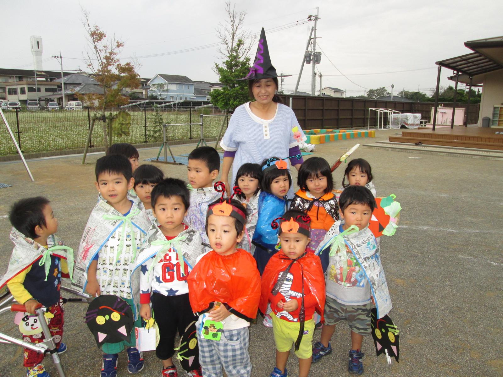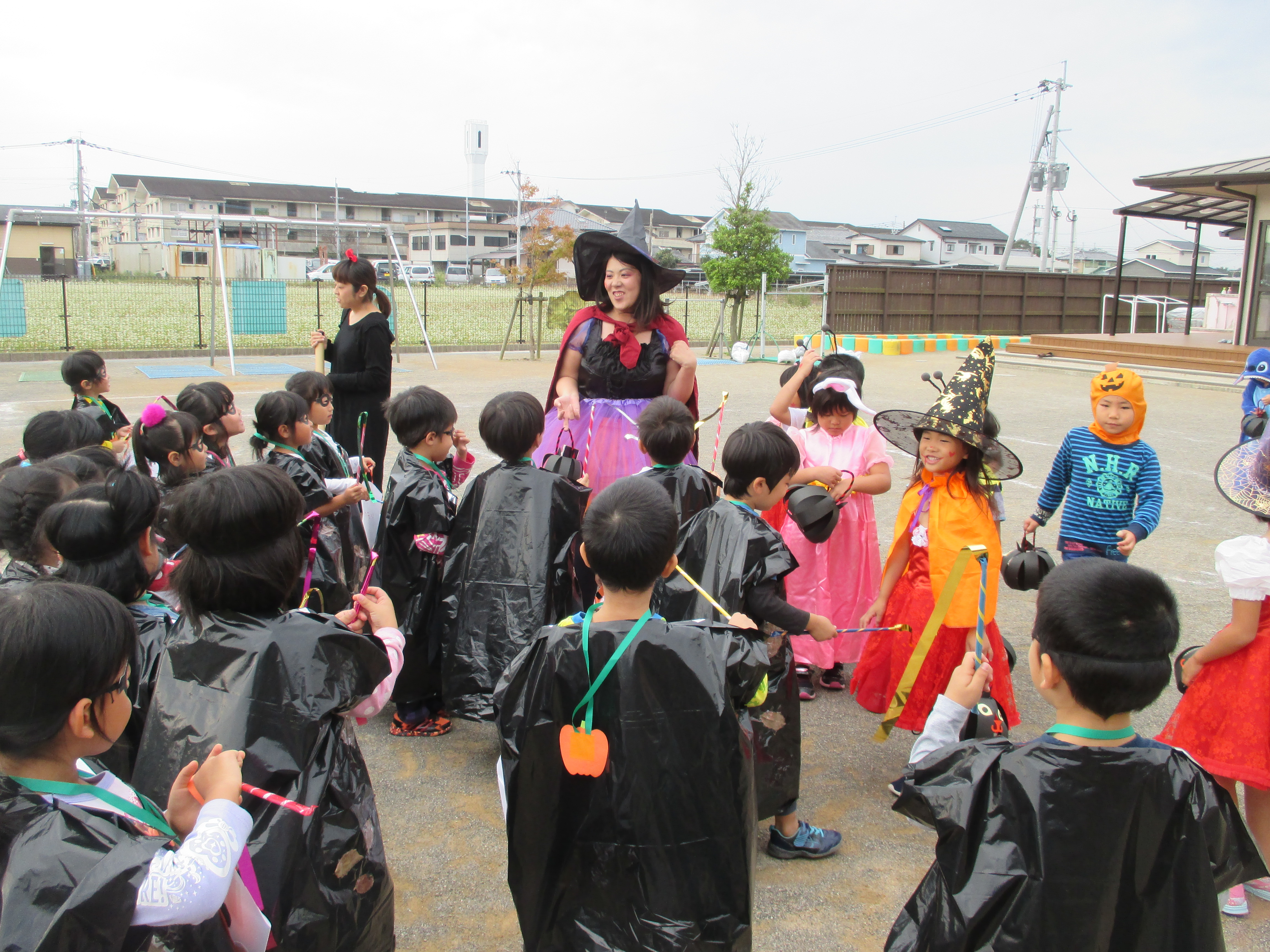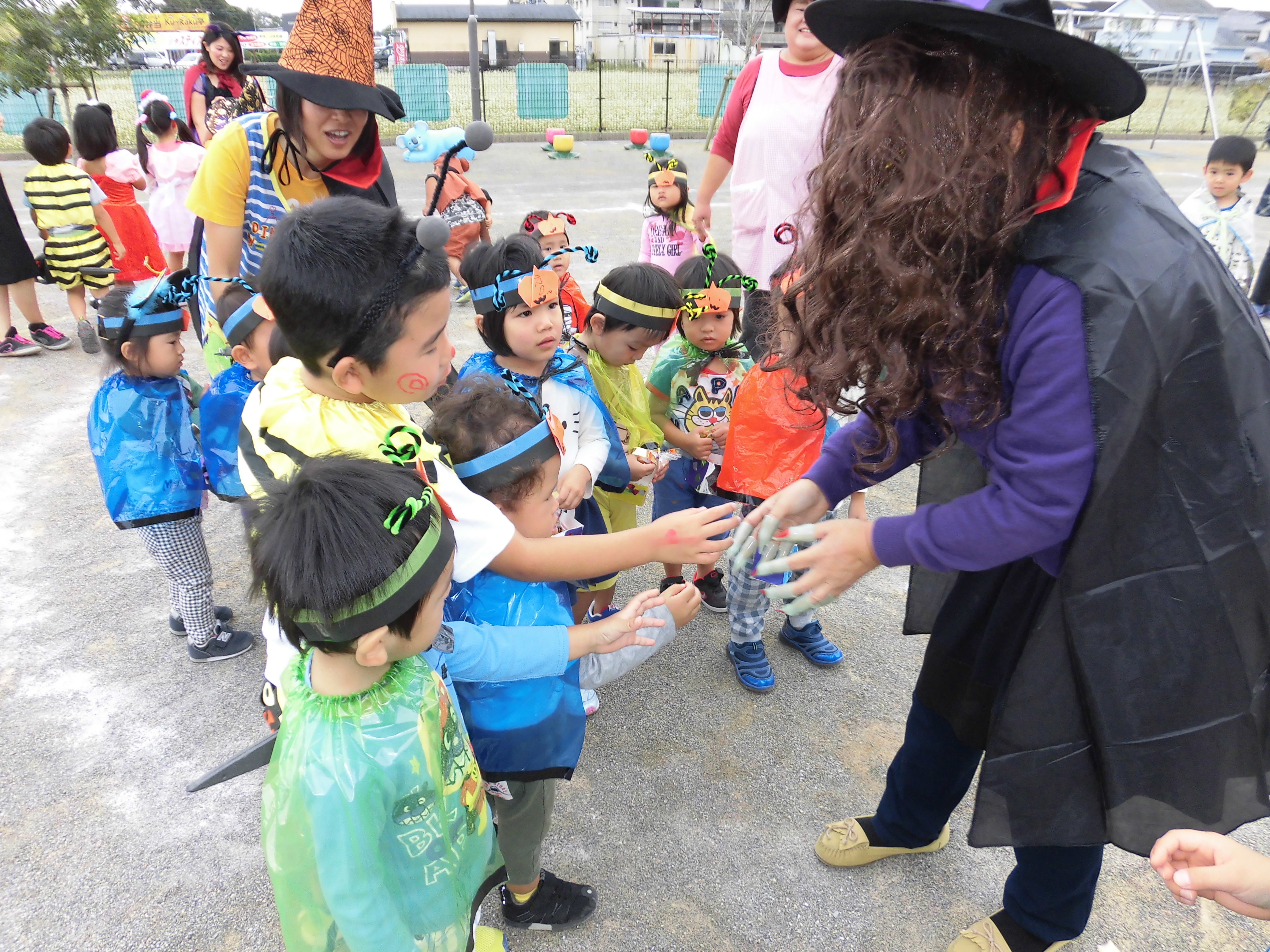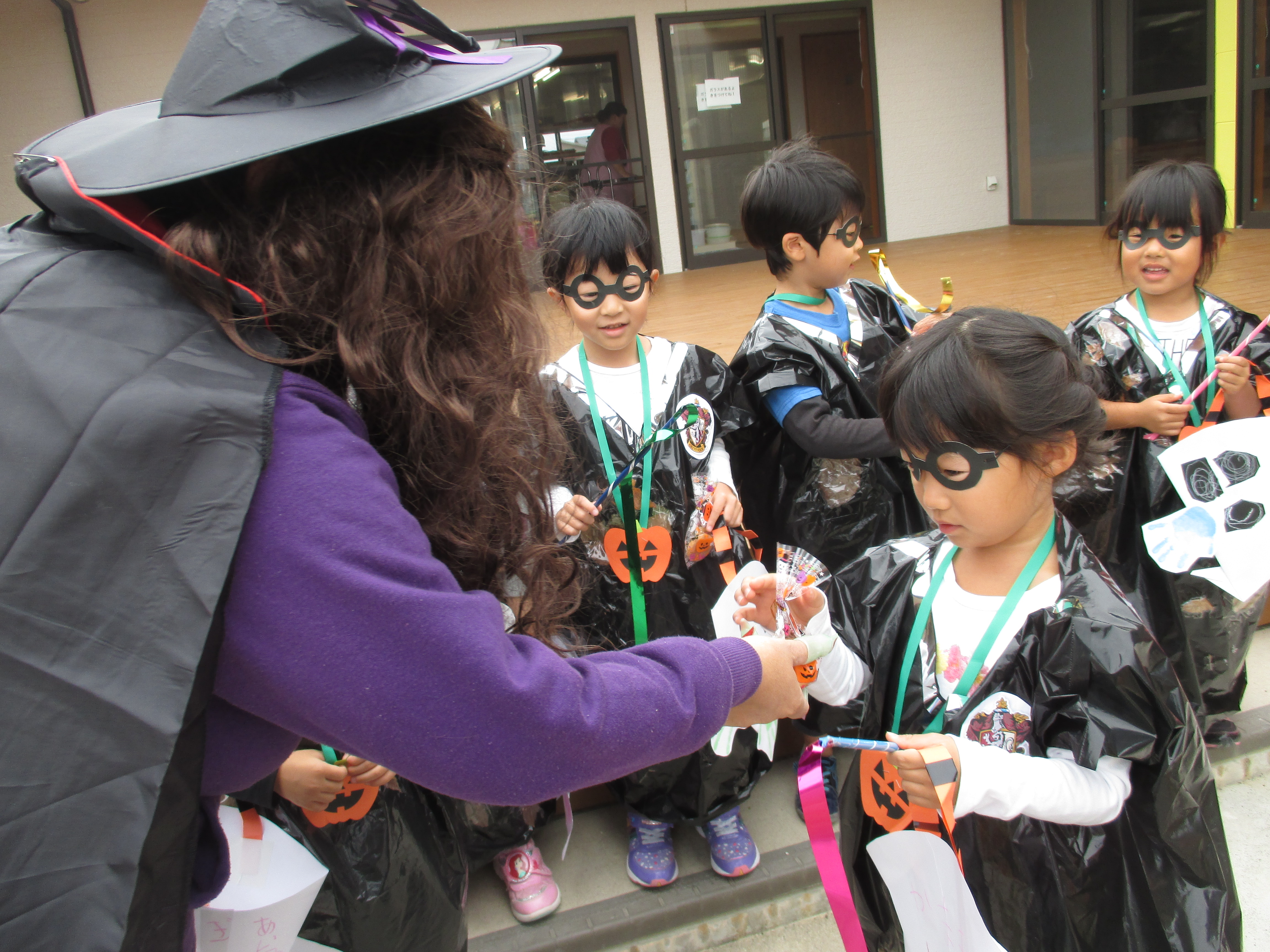 ハロウィン 10月31日(月) ハロウィンの日。子どもたちは、自分で作ったお面やマントをつけてグラウンドを練り歩きました。 「私、誰だかわかる?」「わーかっこいいね。」「魔女が来たよ~。」と会話が弾んでいました。 魔女からクッキーをもらうと大喜び!毎年、各クラスでアイデアを出し製作した衣装はとても素敵でした。