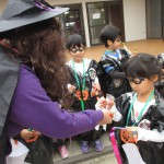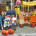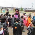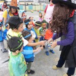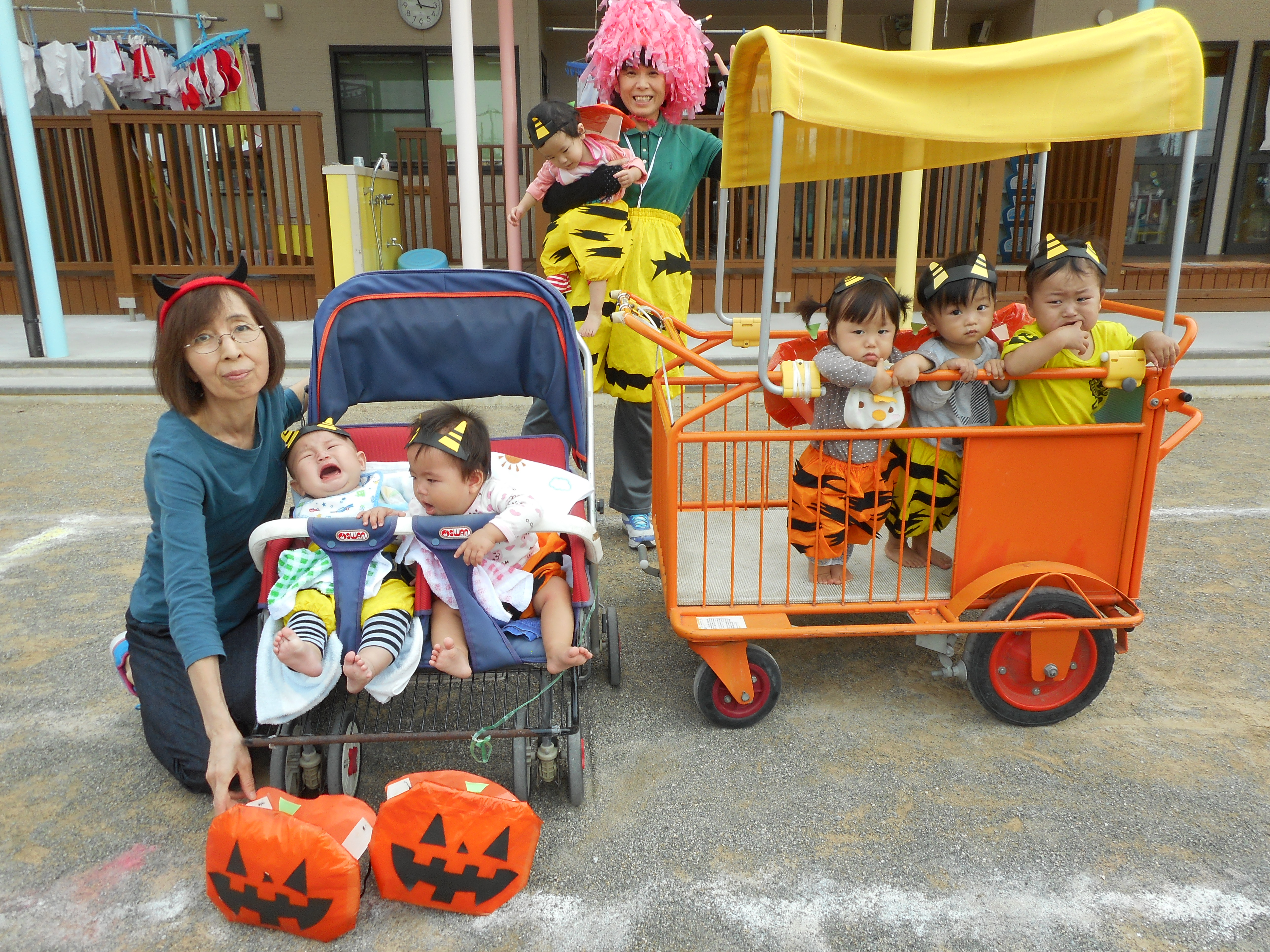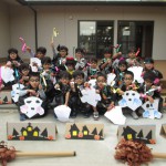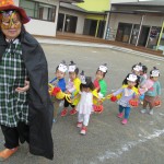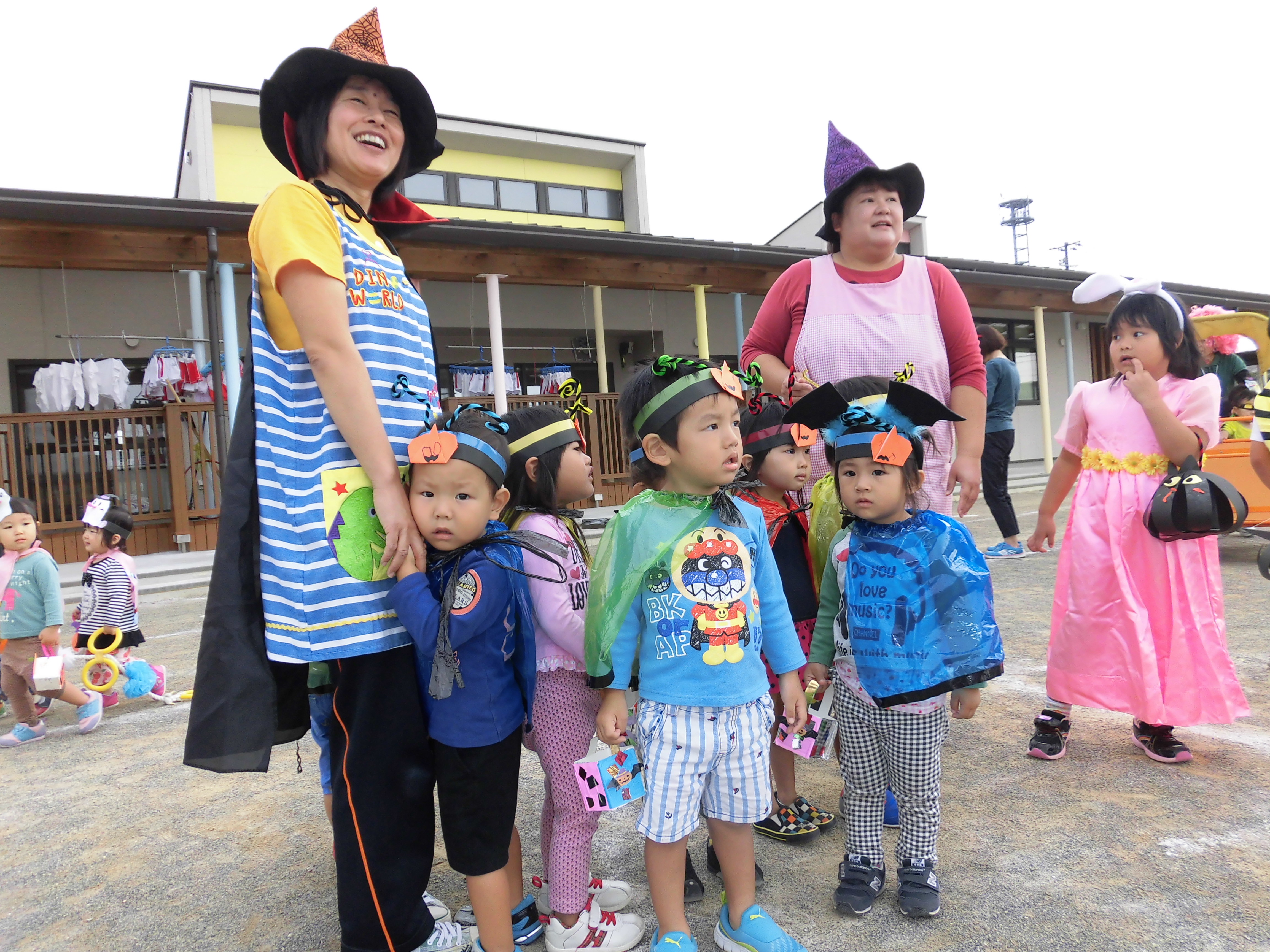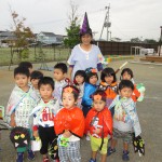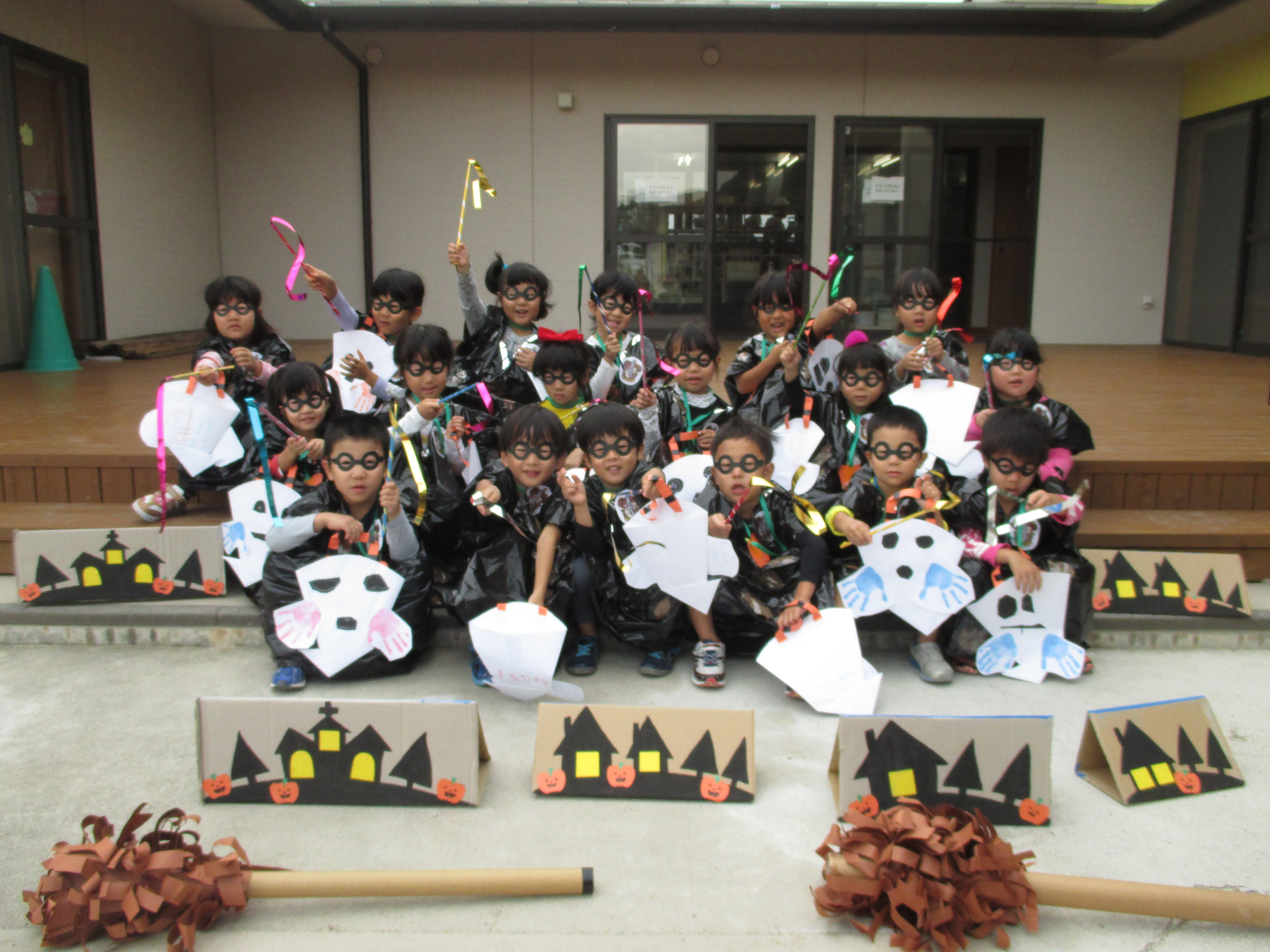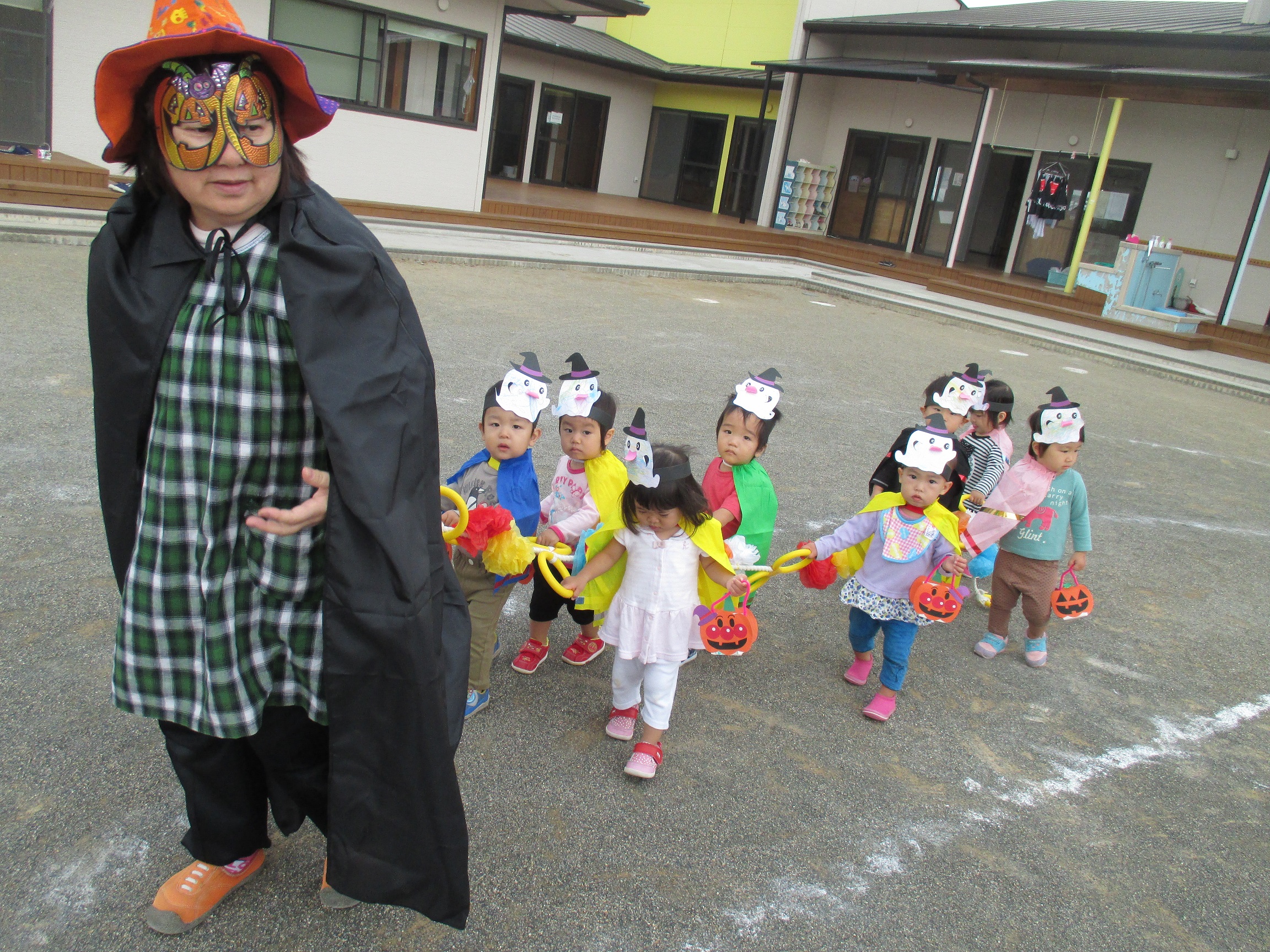 ハロウィン 10月31日(月) ハロウィンの日。子どもたちは、自分で作ったお面やマントをつけてグラウンドを練り歩きました。 「私、誰だかわかる?」「わーかっこいいね。」「魔女が来たよ~。」と会話が弾んでいました。 魔女からクッキーをもらうと大喜び!毎年、各クラスでアイデアを出し製作した衣装はとても素敵でした。