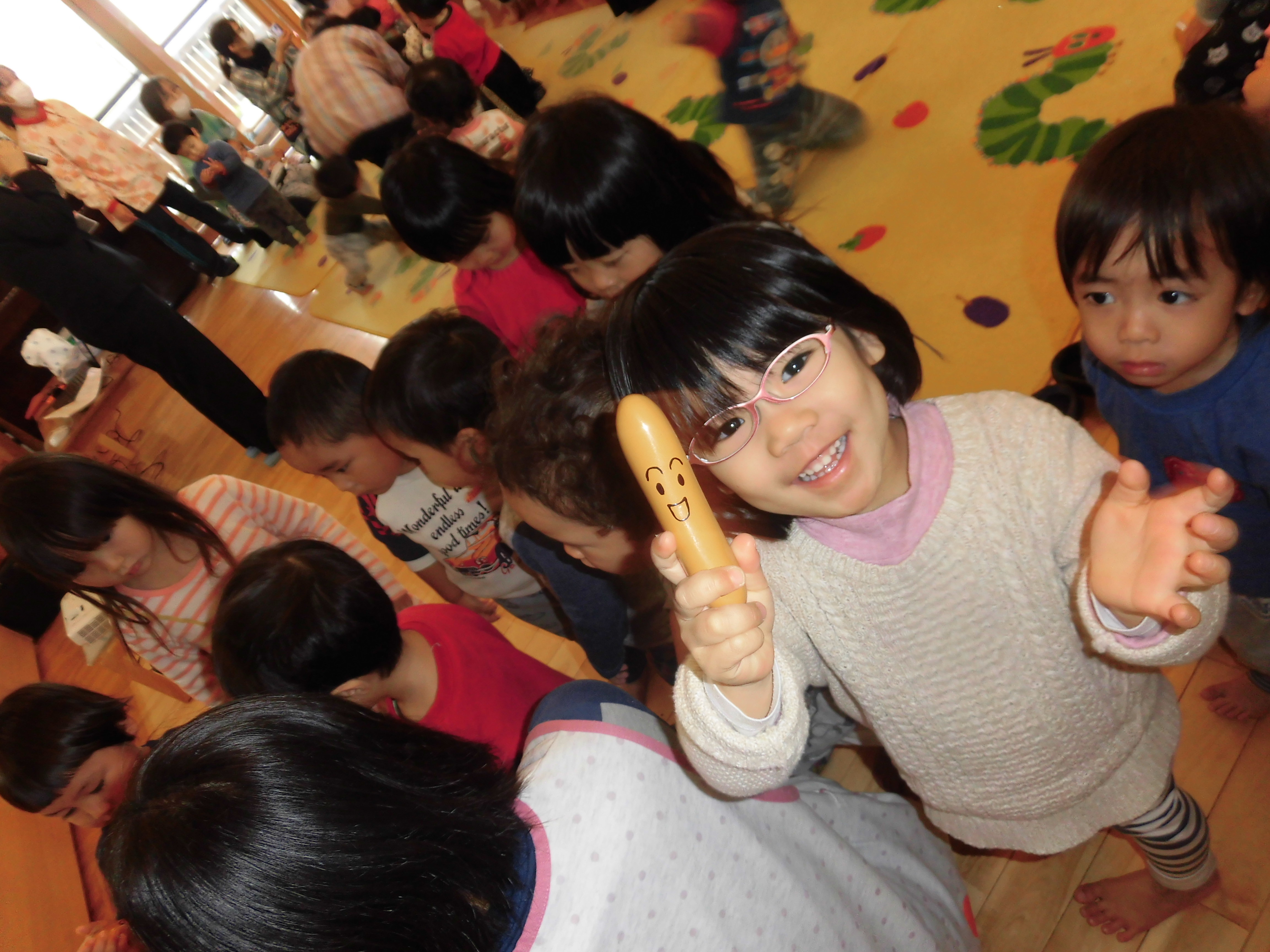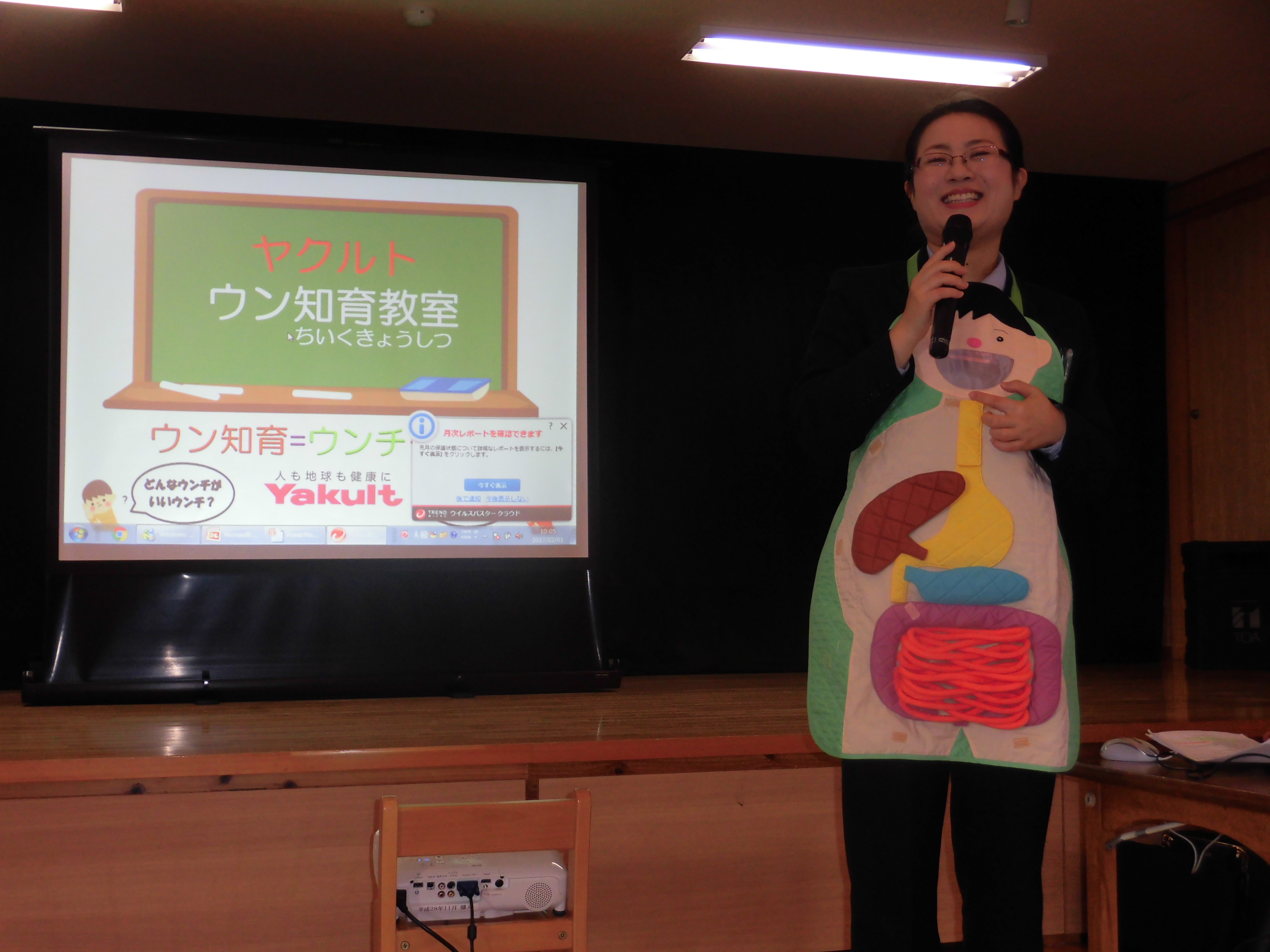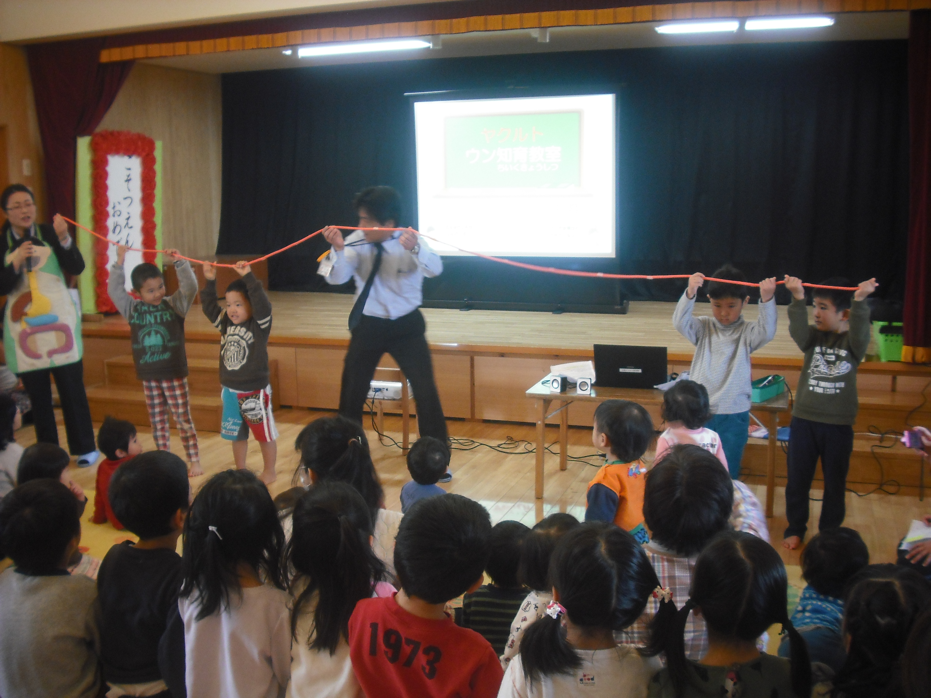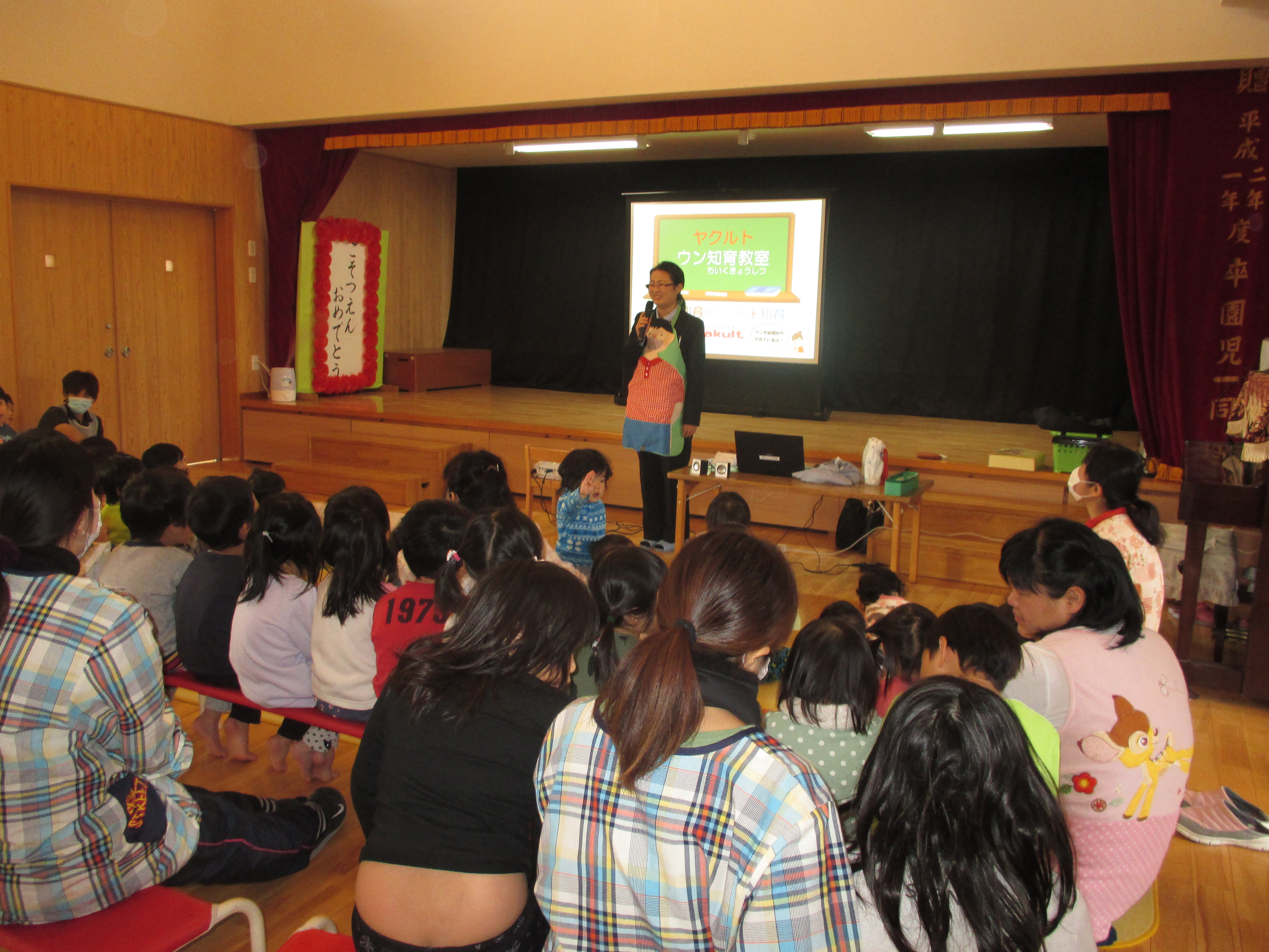 ウン知育教室 2月1日(水) ヤクルト宮崎による「ウン知育教室」に参加しました。 体のしくみをエプロンシアターや模型を使ってお話をして下さったので、とても分かりやすく楽しく学ぶことができました。 食事を「よく噛むことが大切」であることを学び、子どもたちは給食の時間に「何回嚙む?」「たくさん噛まんといかんよね。」など会話を弾ませていました。
