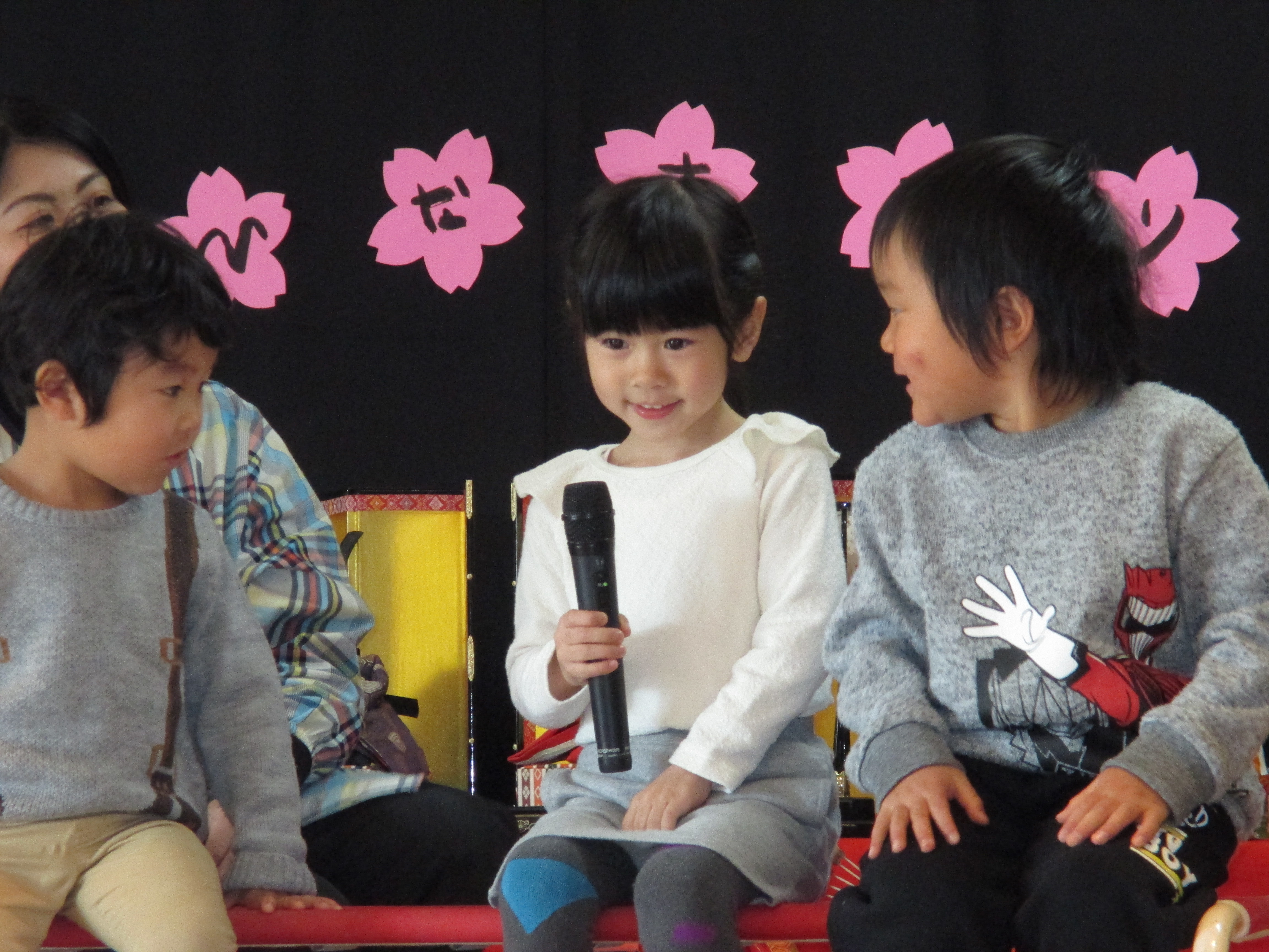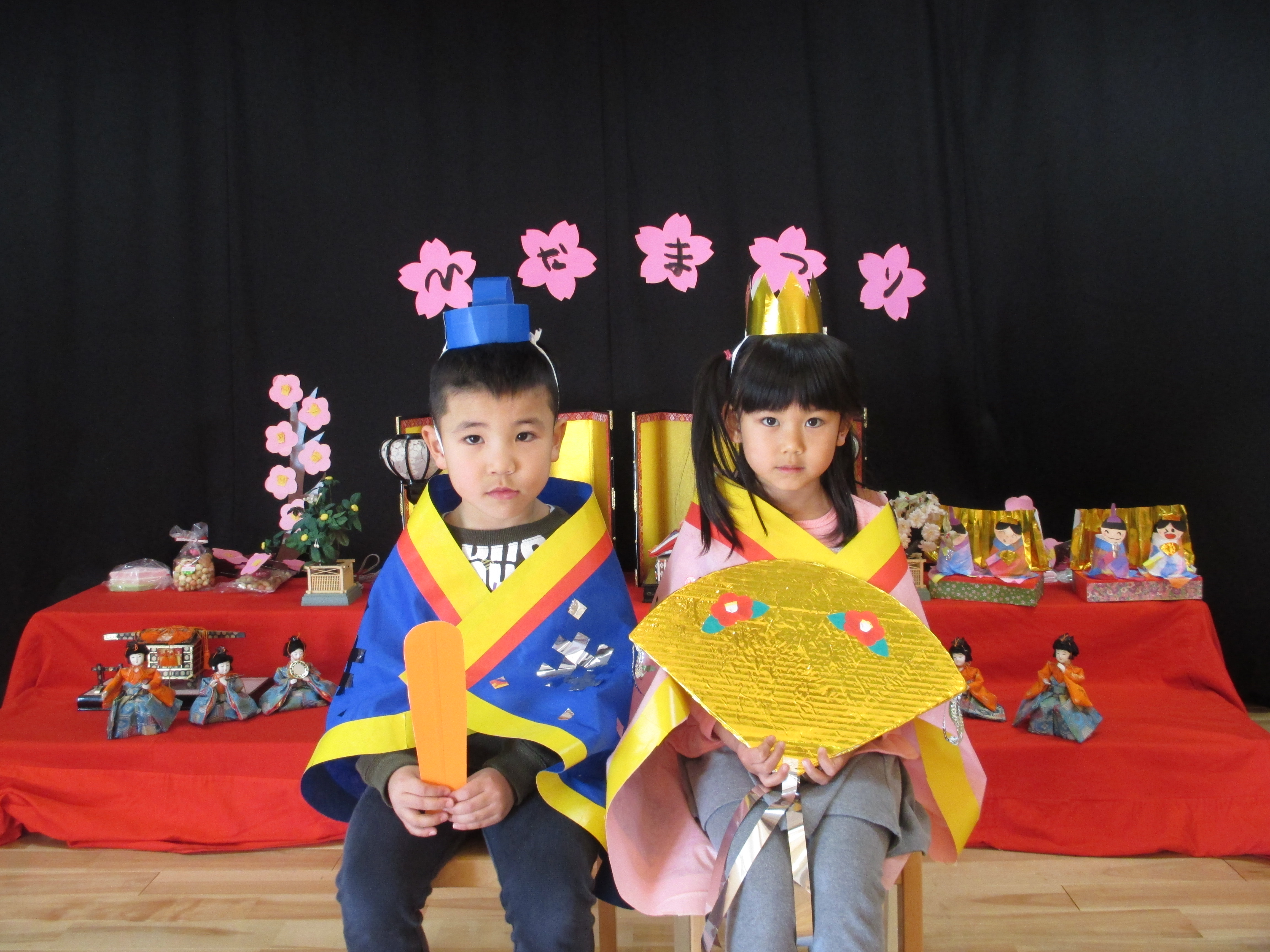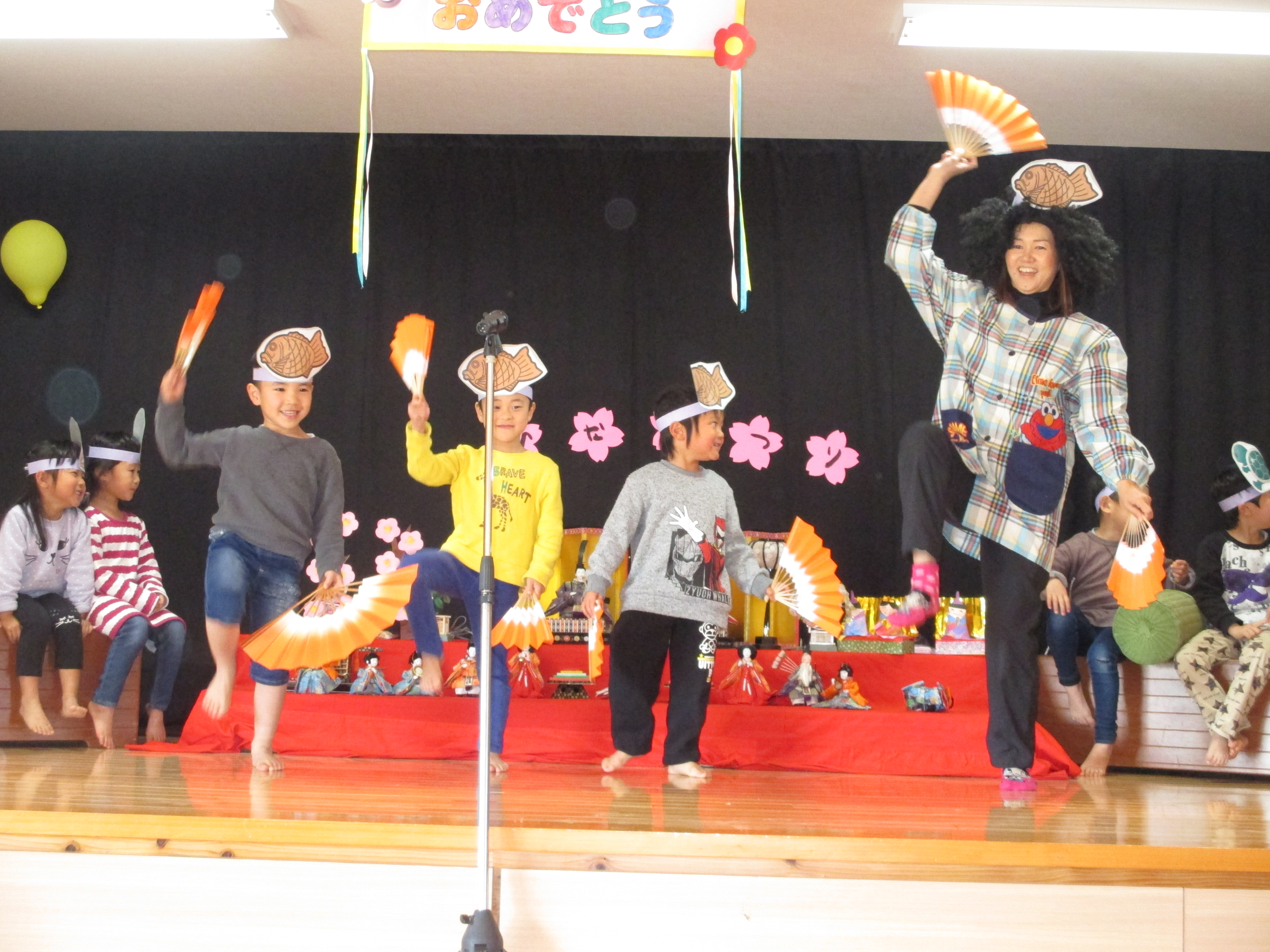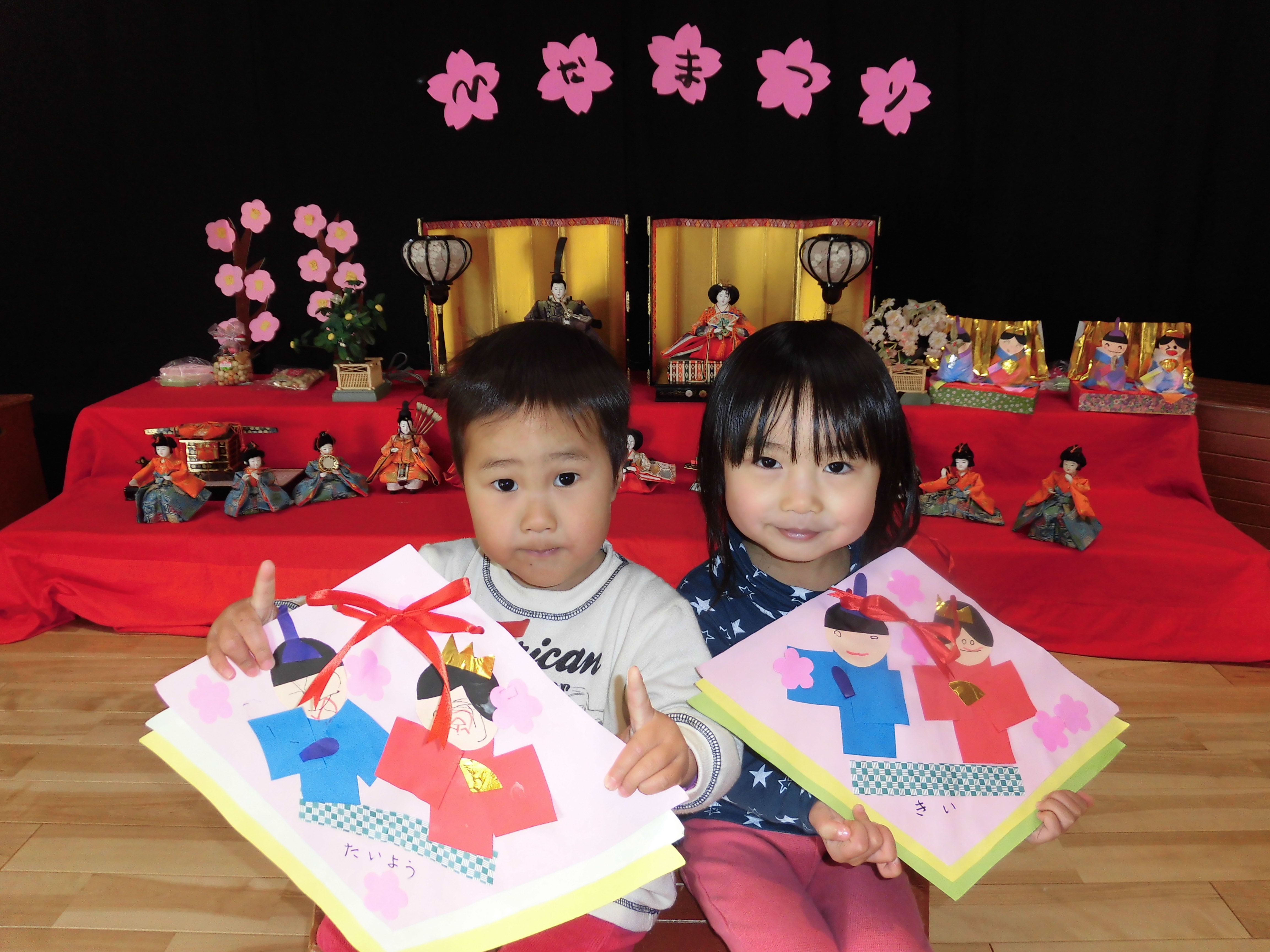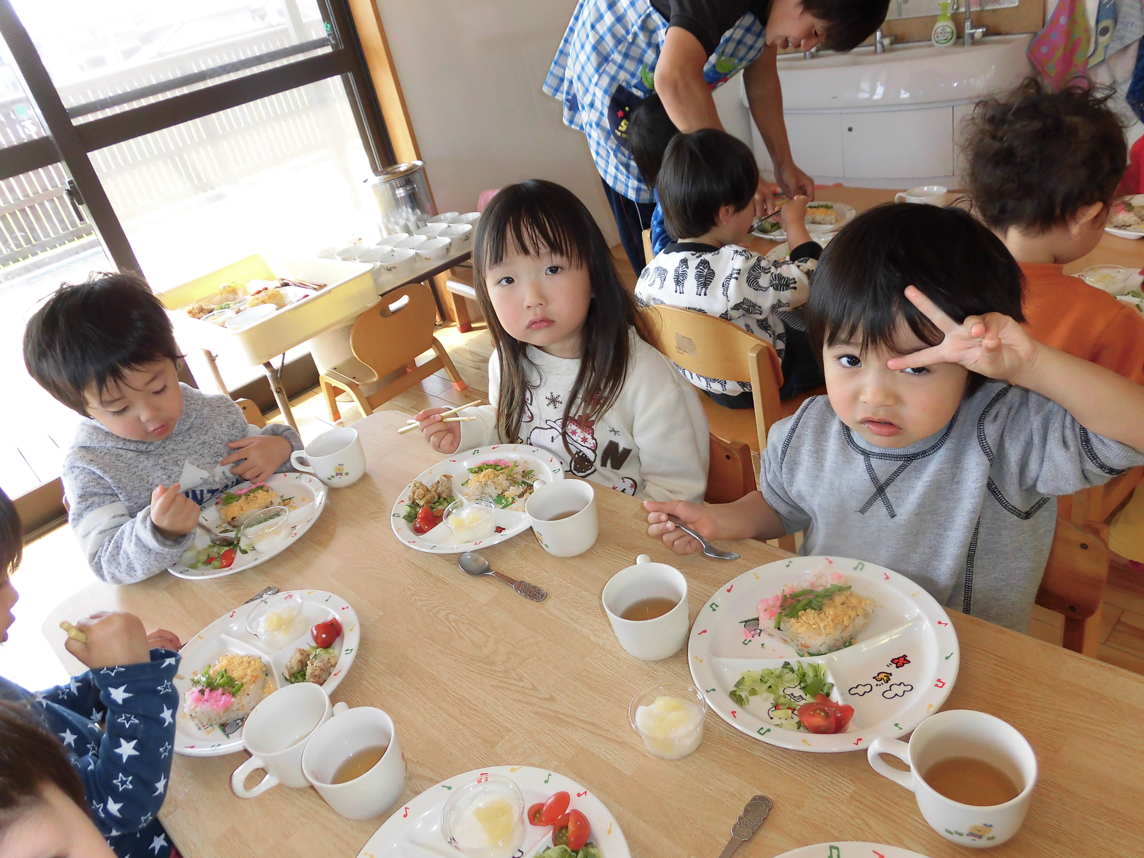 ひなまつり誕生会 3月3日(金) ひなまつり誕生会があり、各クラスで作ったおひなさまを飾ったり、衣装を身に付け、おだいり様とおひな様に変身しました。 誕生会では子どもと職員による劇や踊りで盛り上がり、楽しいひとときになりました。ひなまつりランチはちらし寿司や唐揚げなど、子どもたちの好きなメニューで大満足でした。