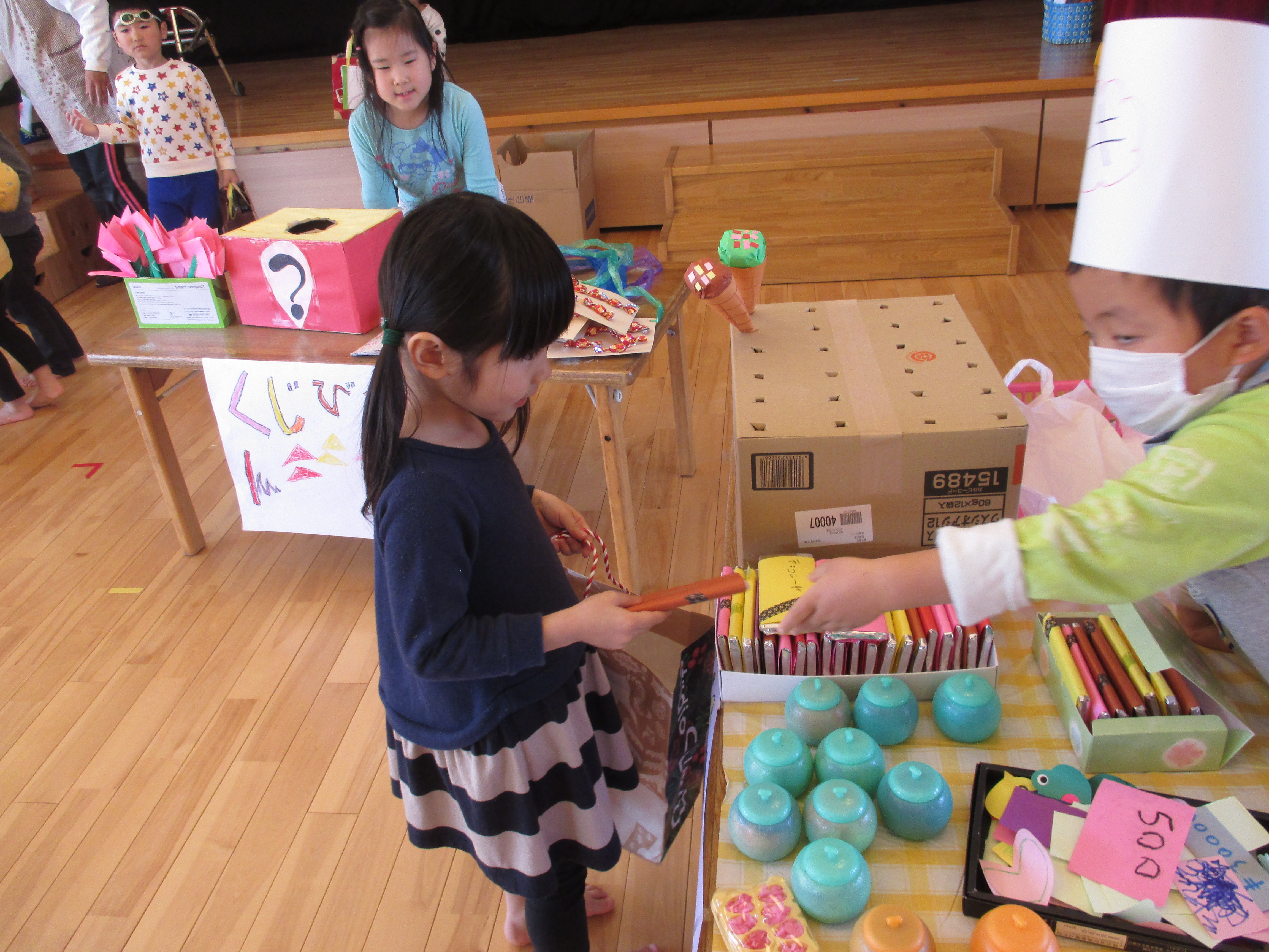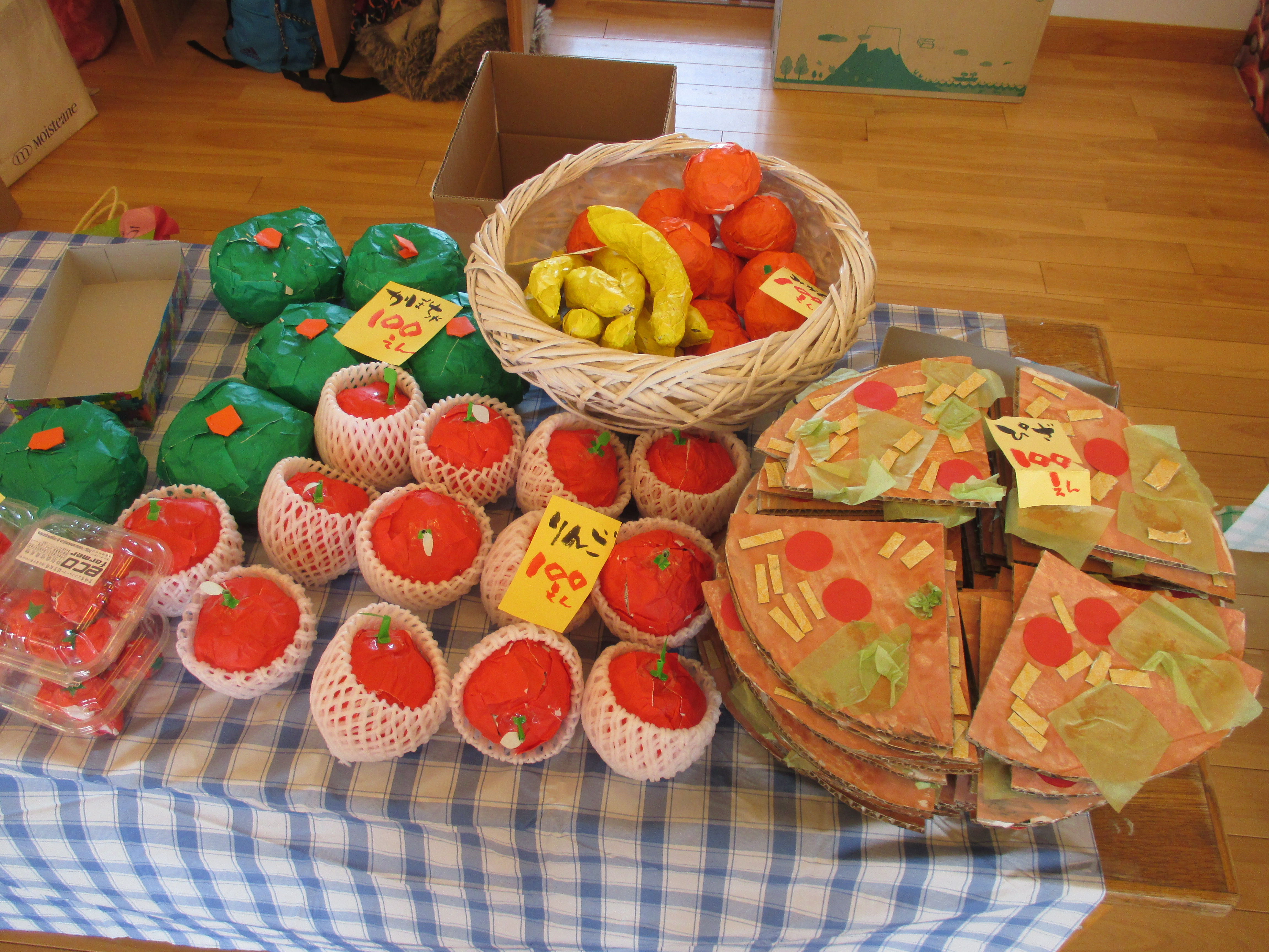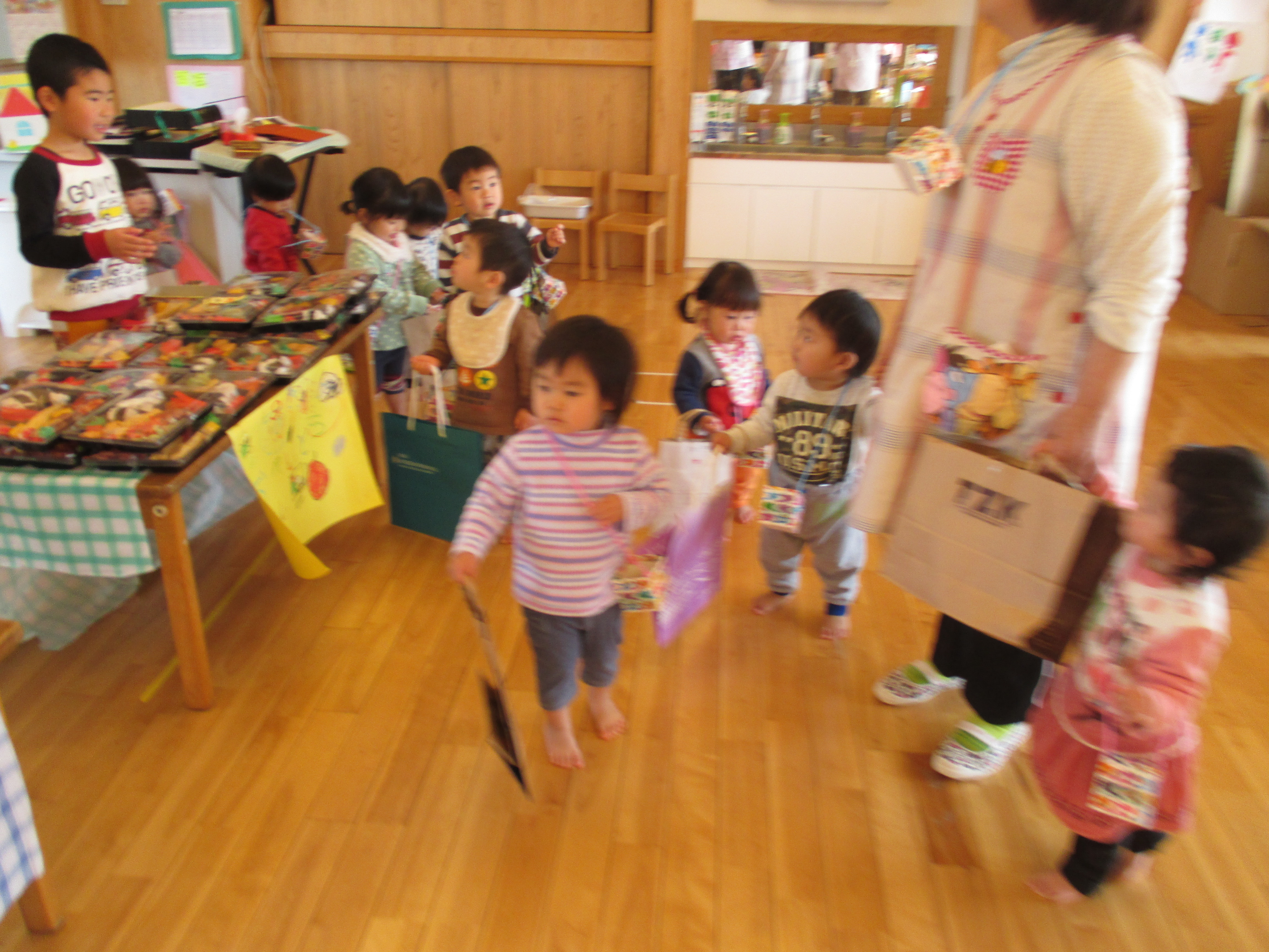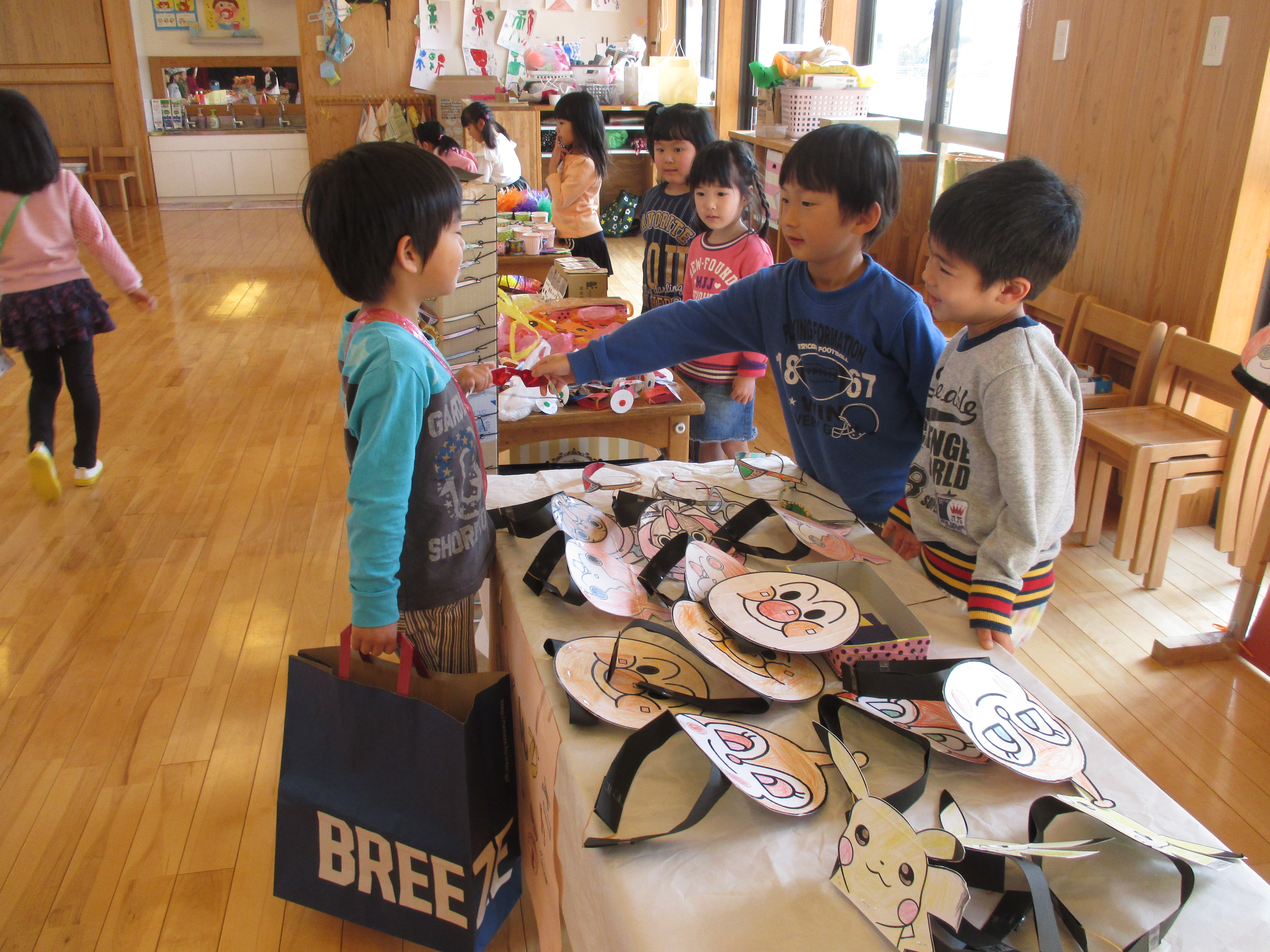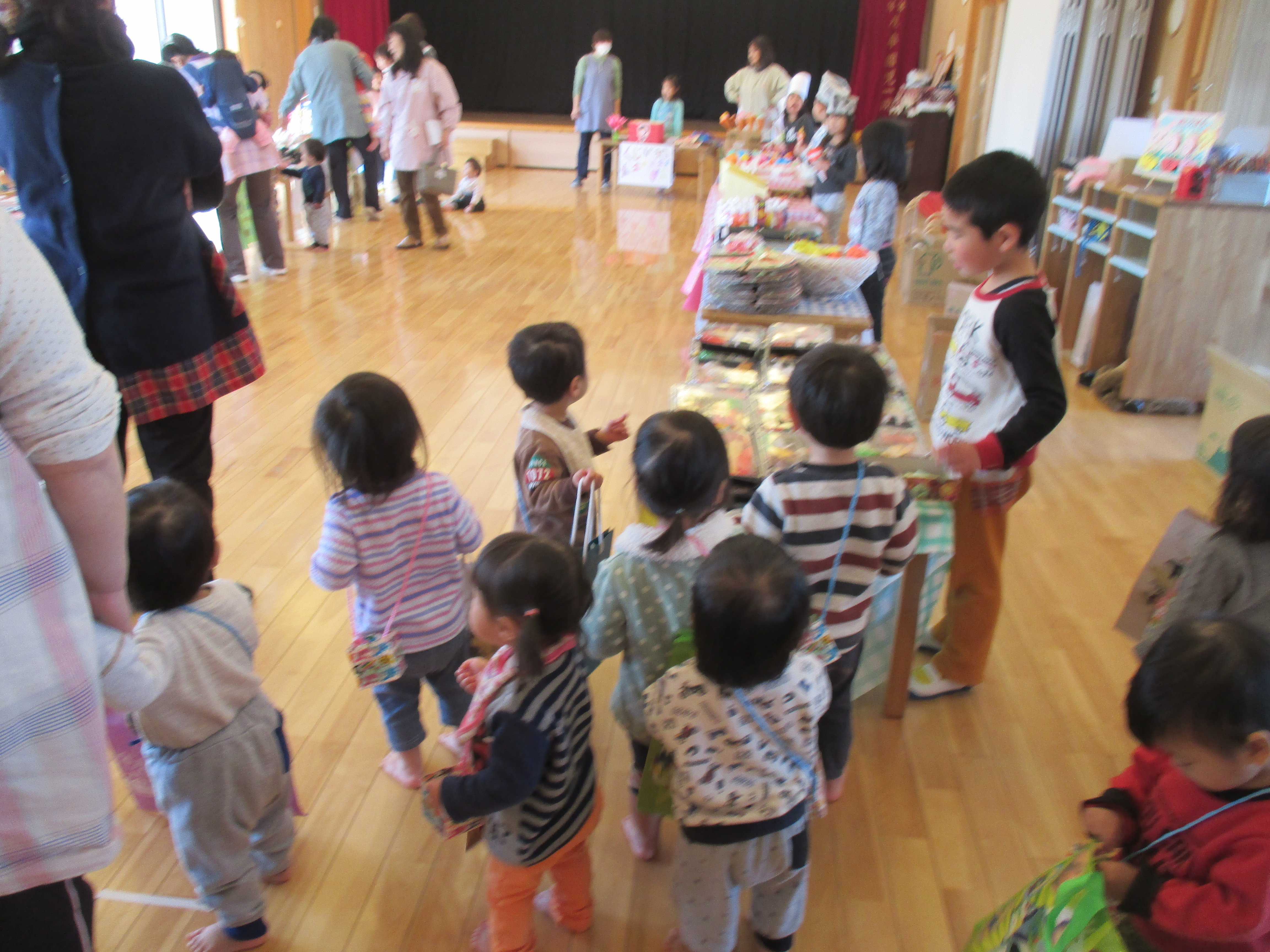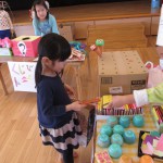バックと財布を持って遊戯室へ。子どもと保育士が一緒に作ったマスコット、アクセサリー、果物、アイス、おもちゃなど自分の好きな物を選んで買いました。
