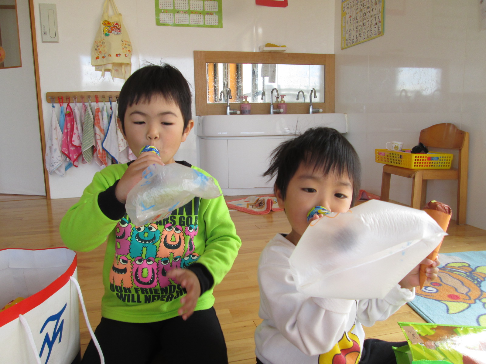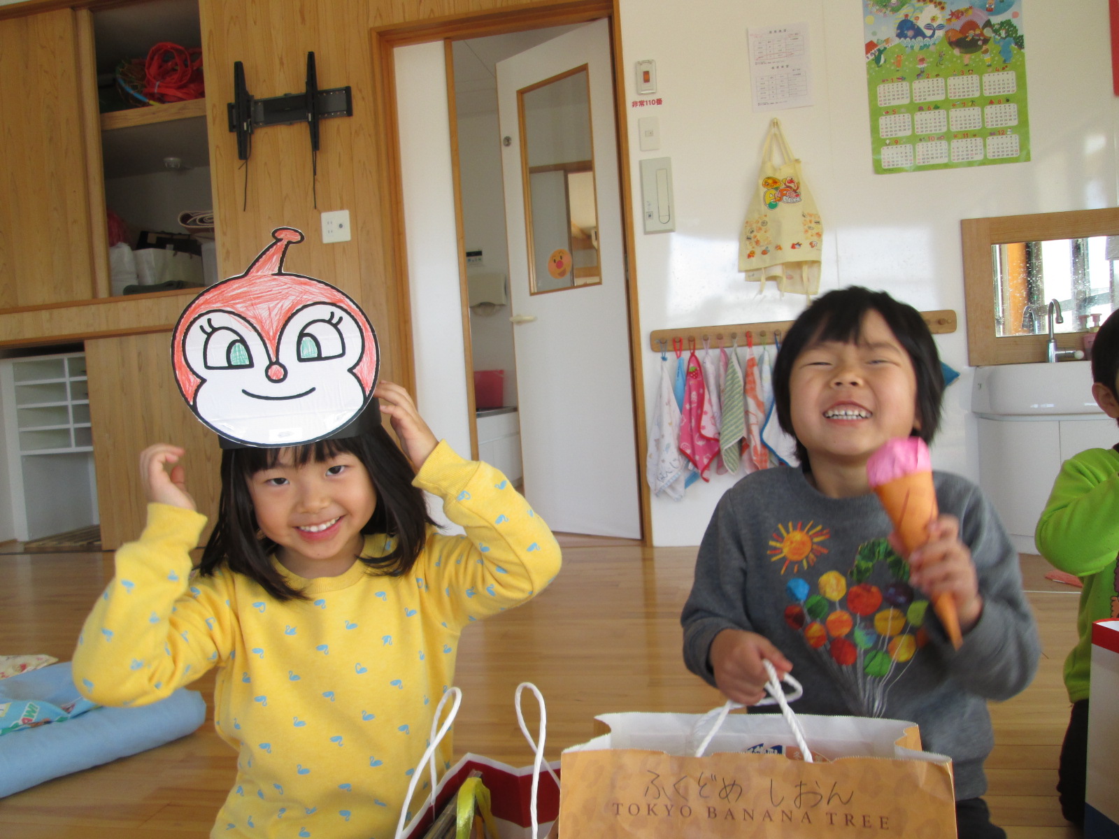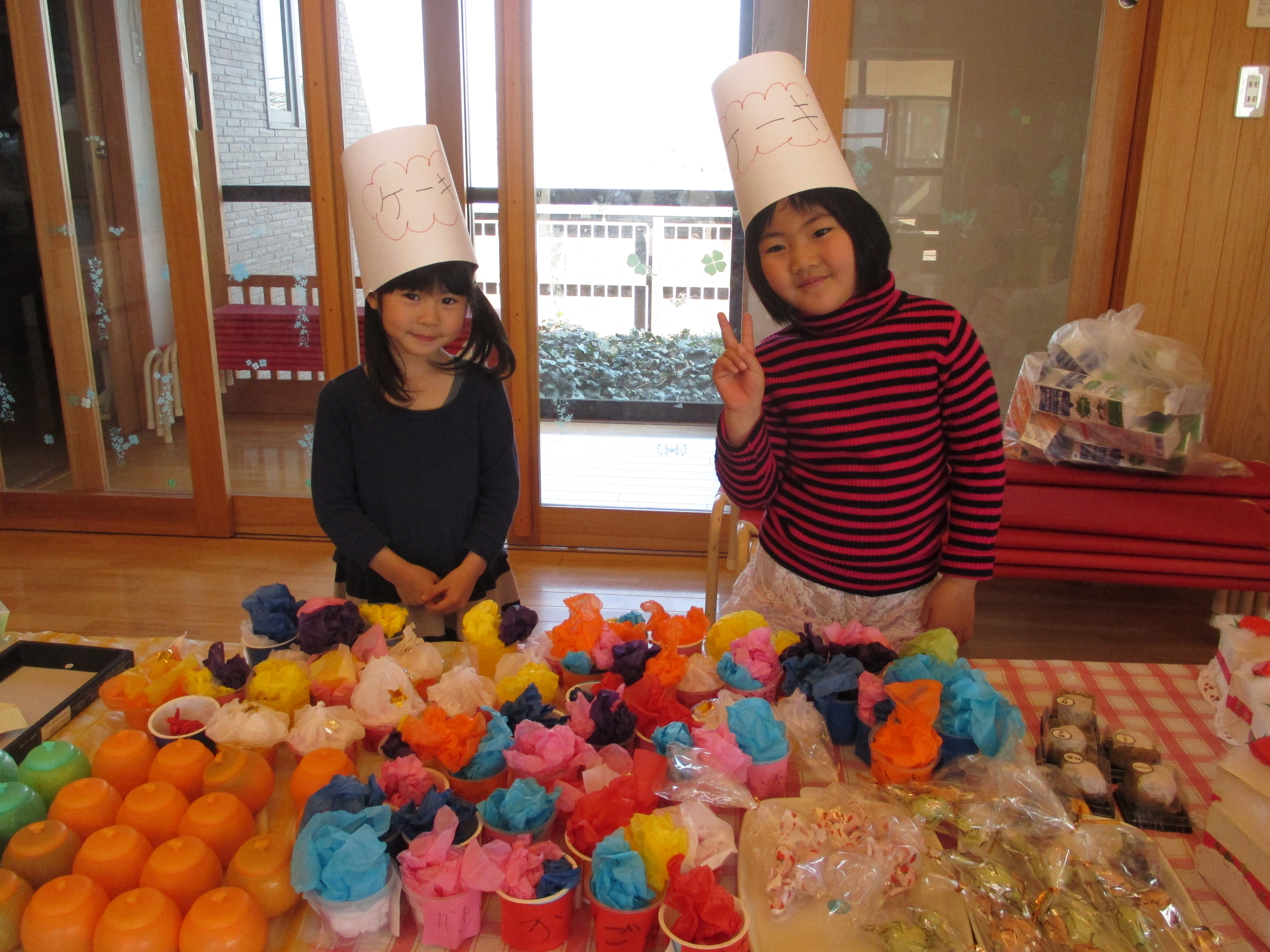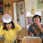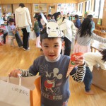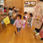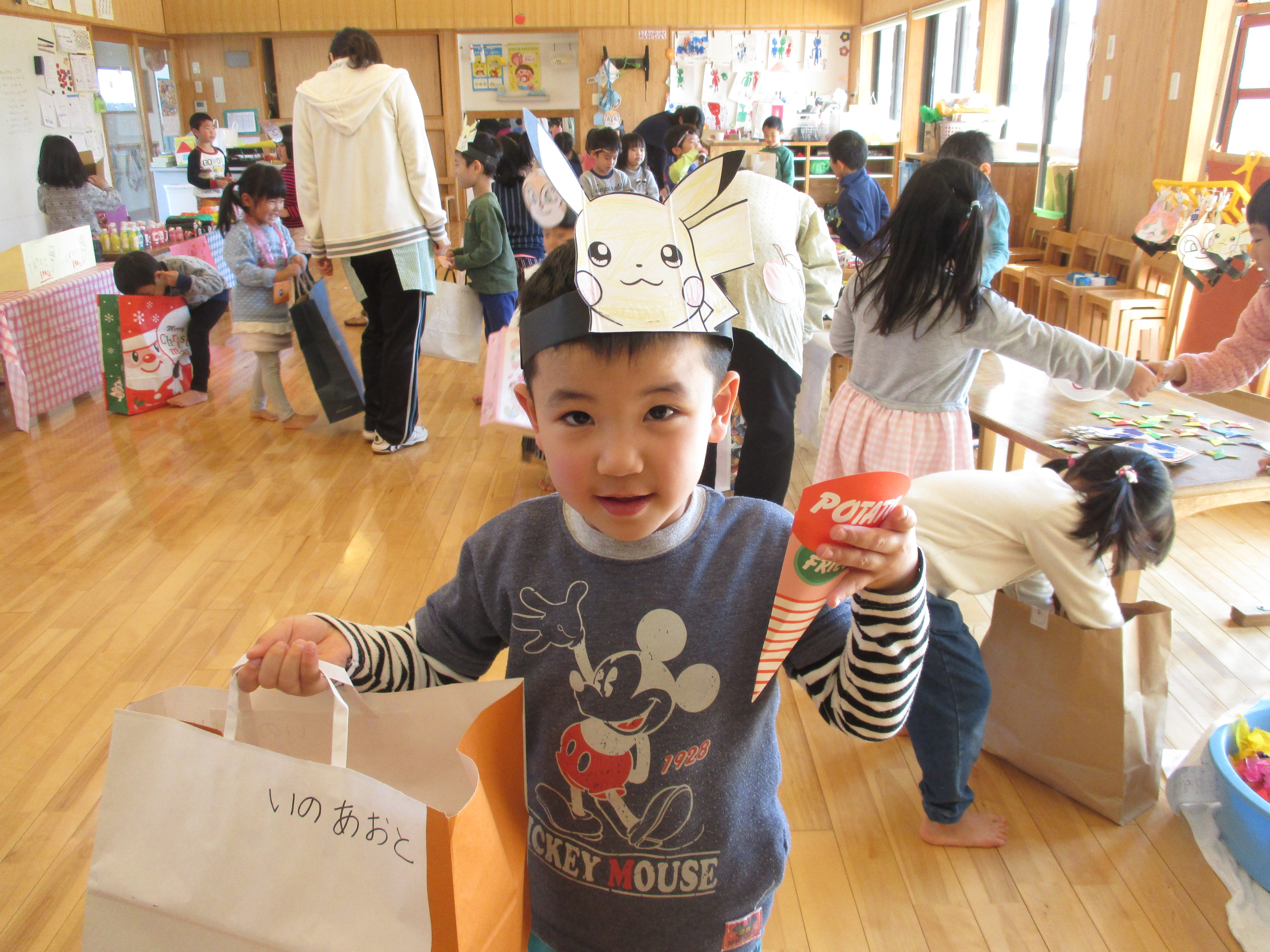 バックと財布を持って遊戯室へ。子どもと保育士が一緒に作ったマスコット、アクセサリー、果物、アイス、おもちゃなど自分の好きな物を選んで買いました。