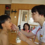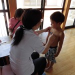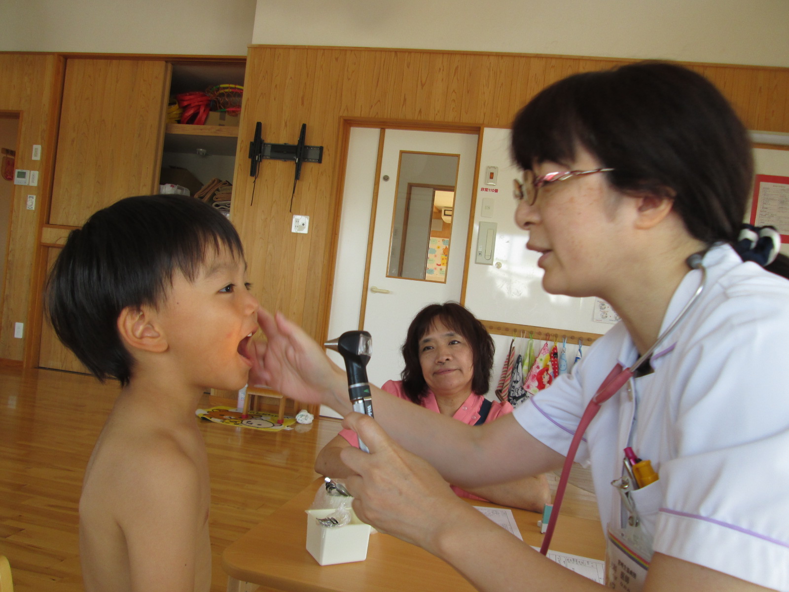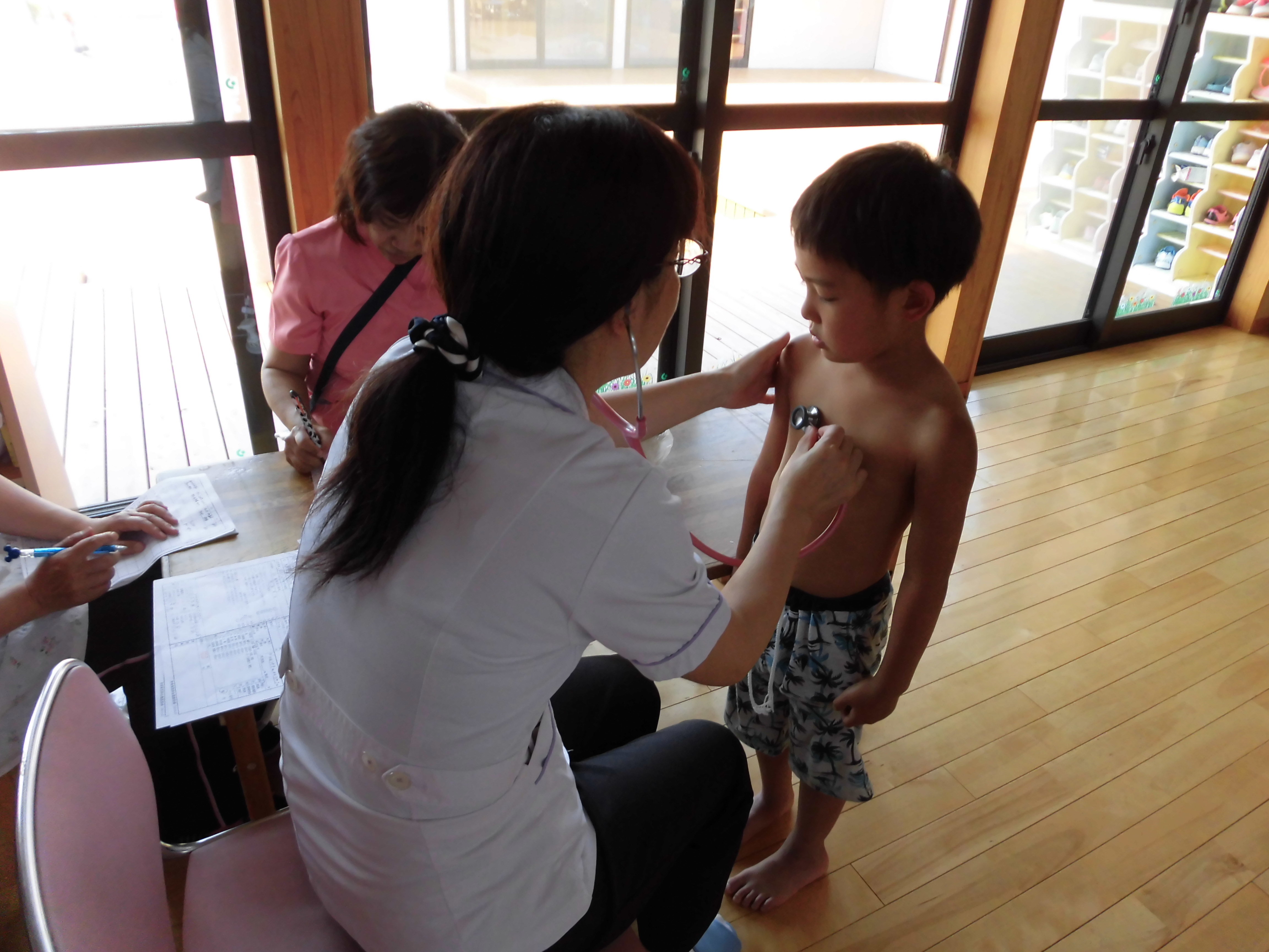 内科健診 5月29日(月) 「もしもししようか?」と優しい女医さんの声かけで安心して健診を受けることができました。 目や口、背中をしっかり診ていただきました。 健診後の予防接種についてのアドバイス等を保護者に伝えることで、定期的に予防接種を受けられる家庭が多くなってきています。