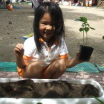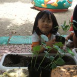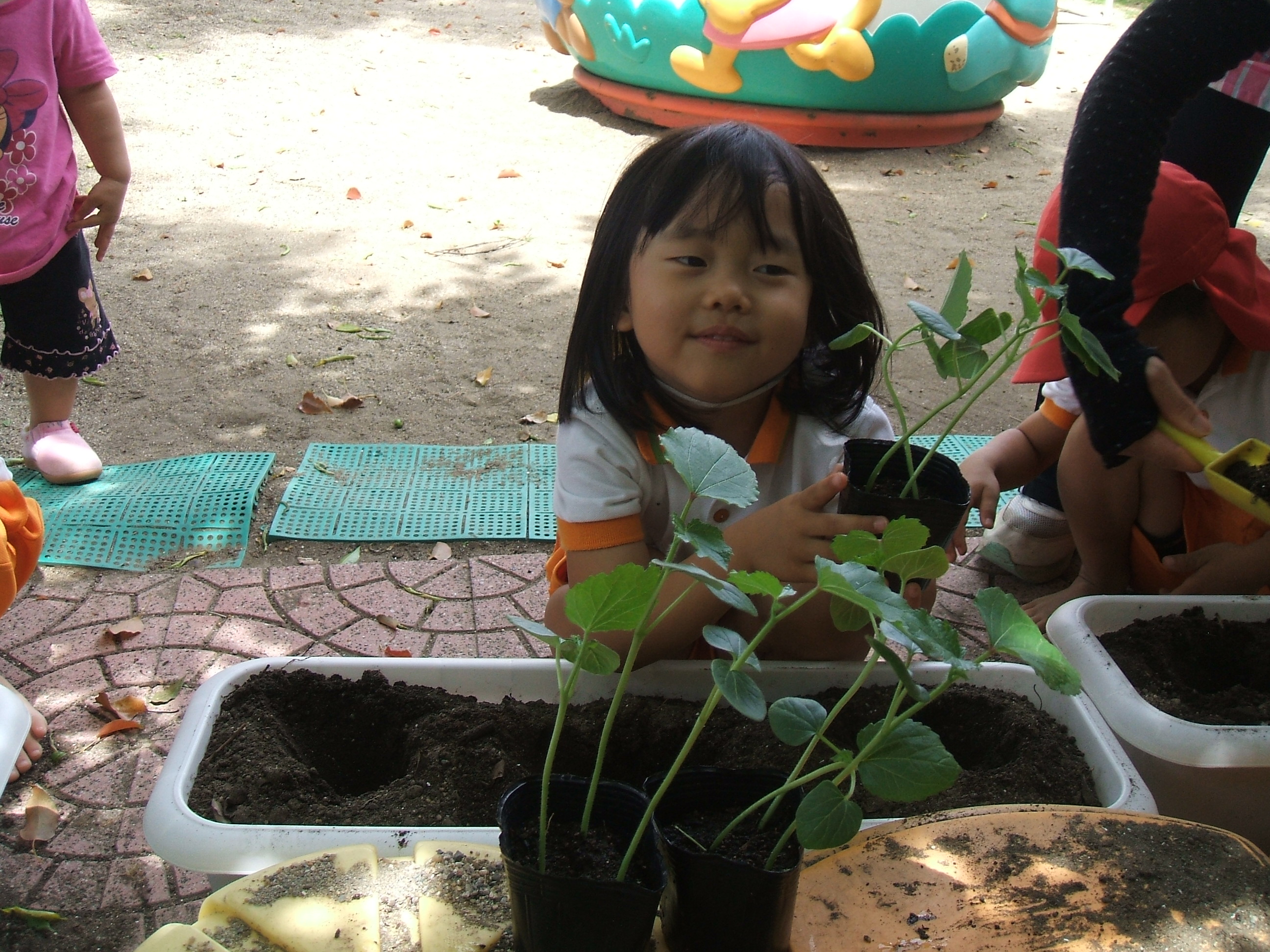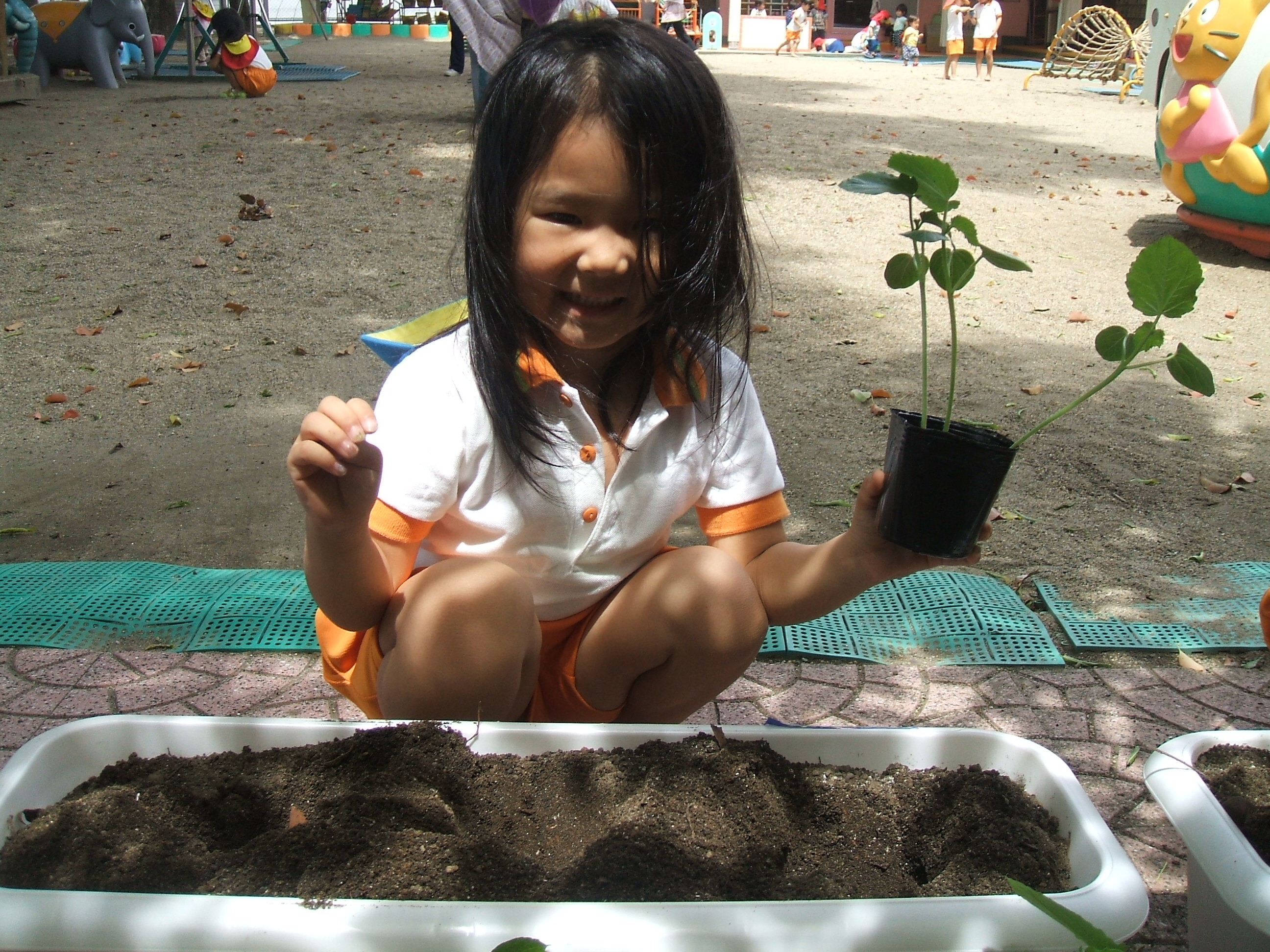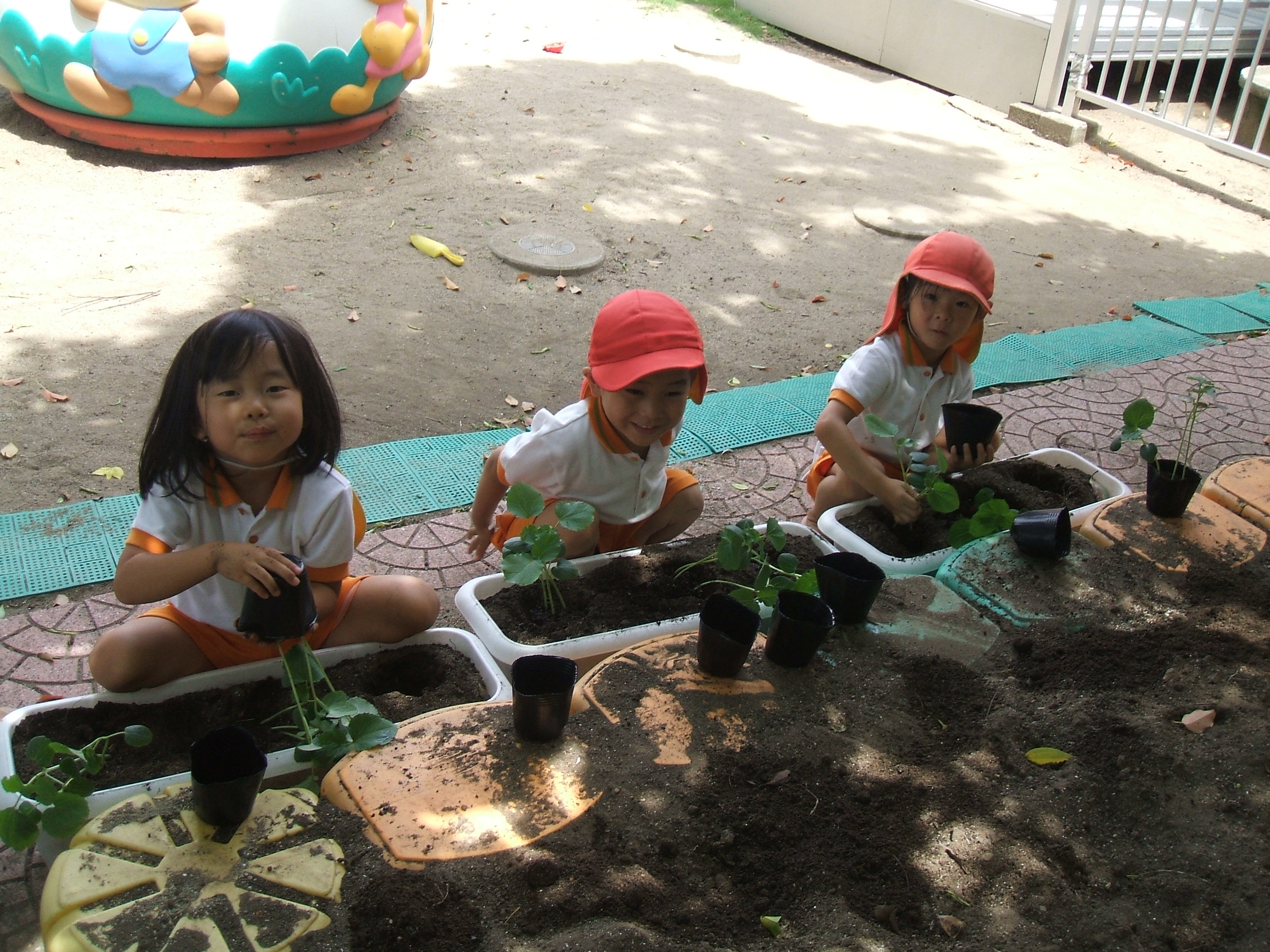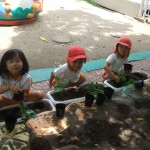 ぞう組さんが、夏野菜のオクラの苗植えを行いました。