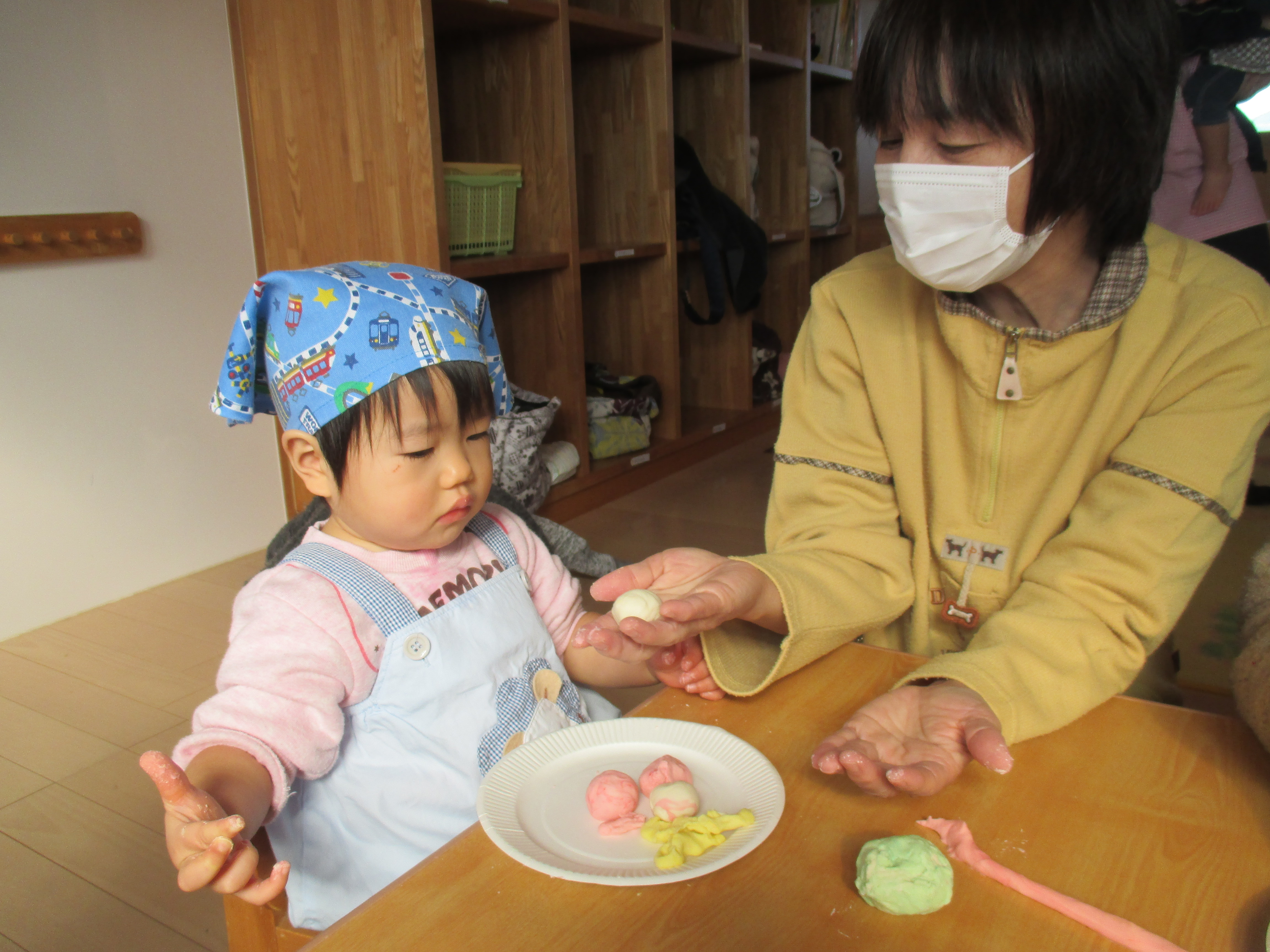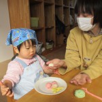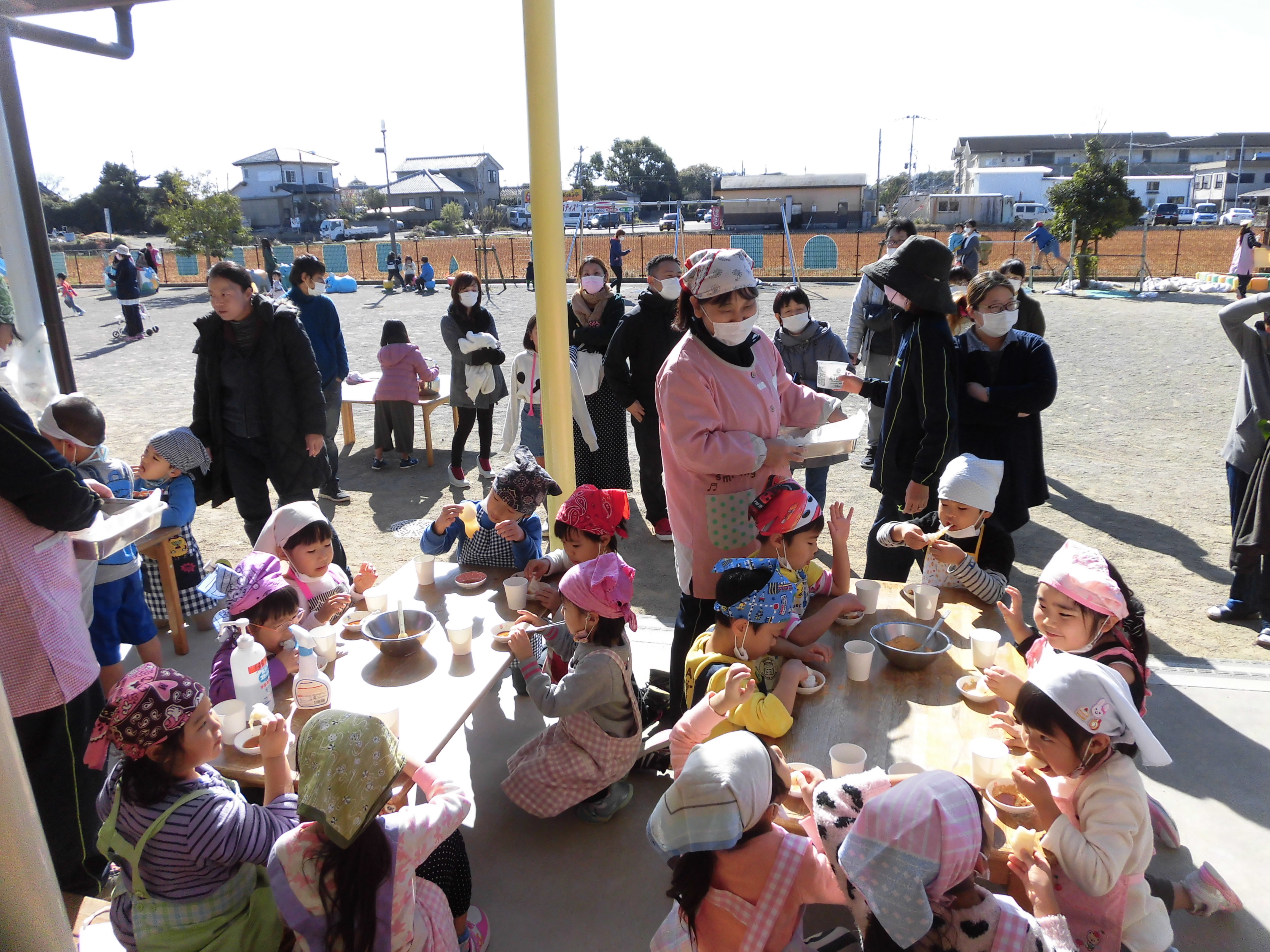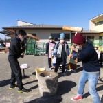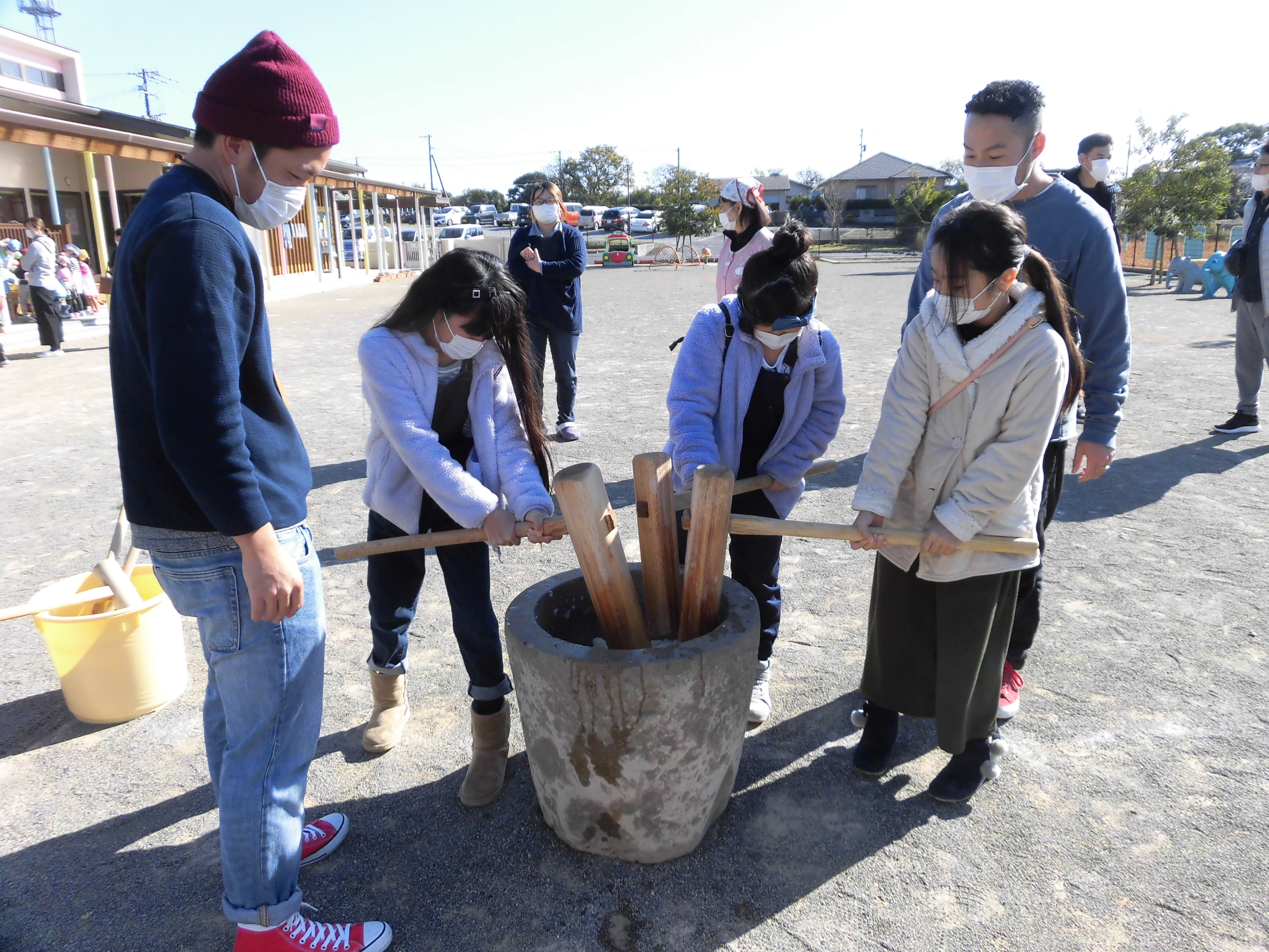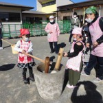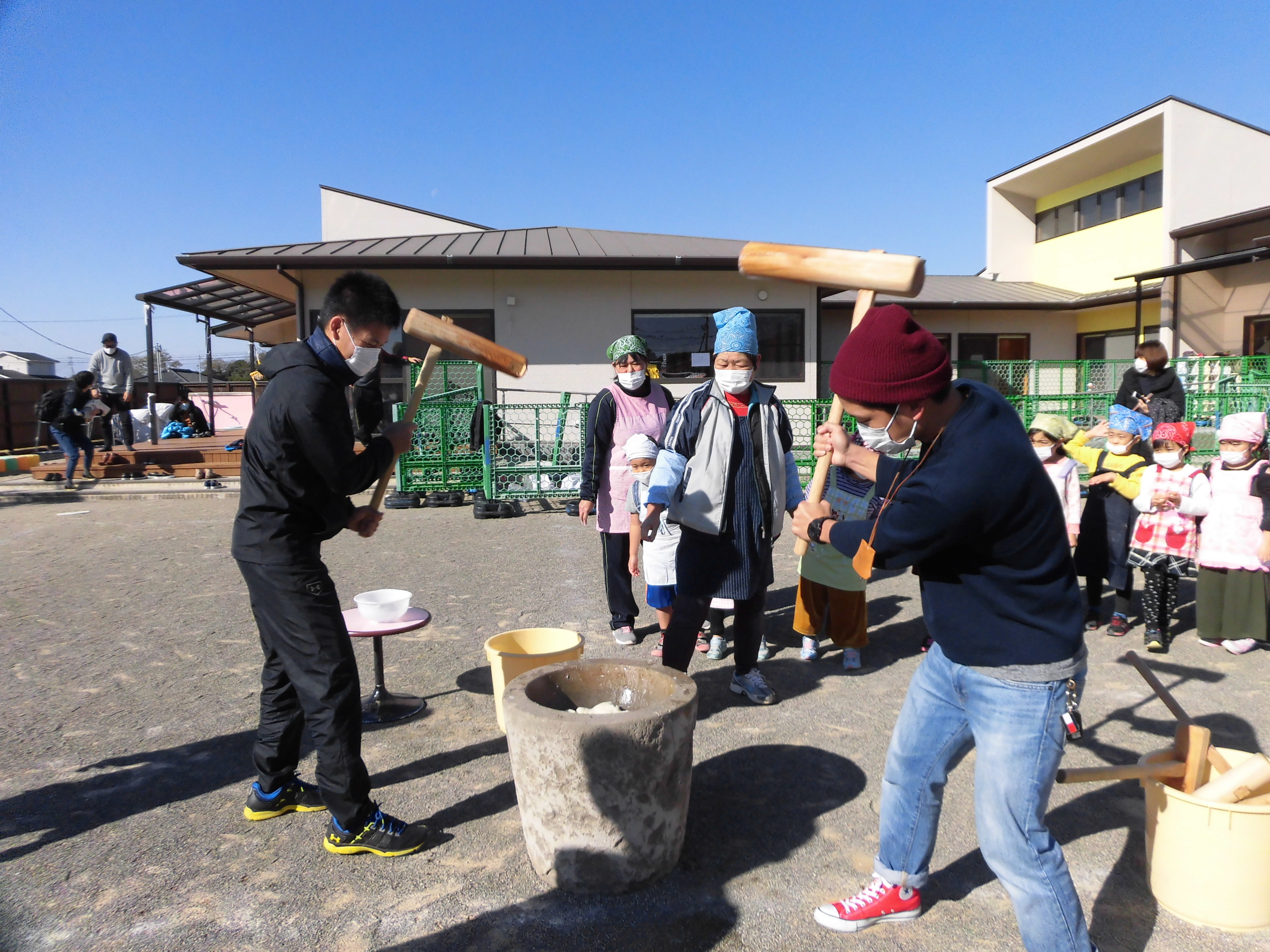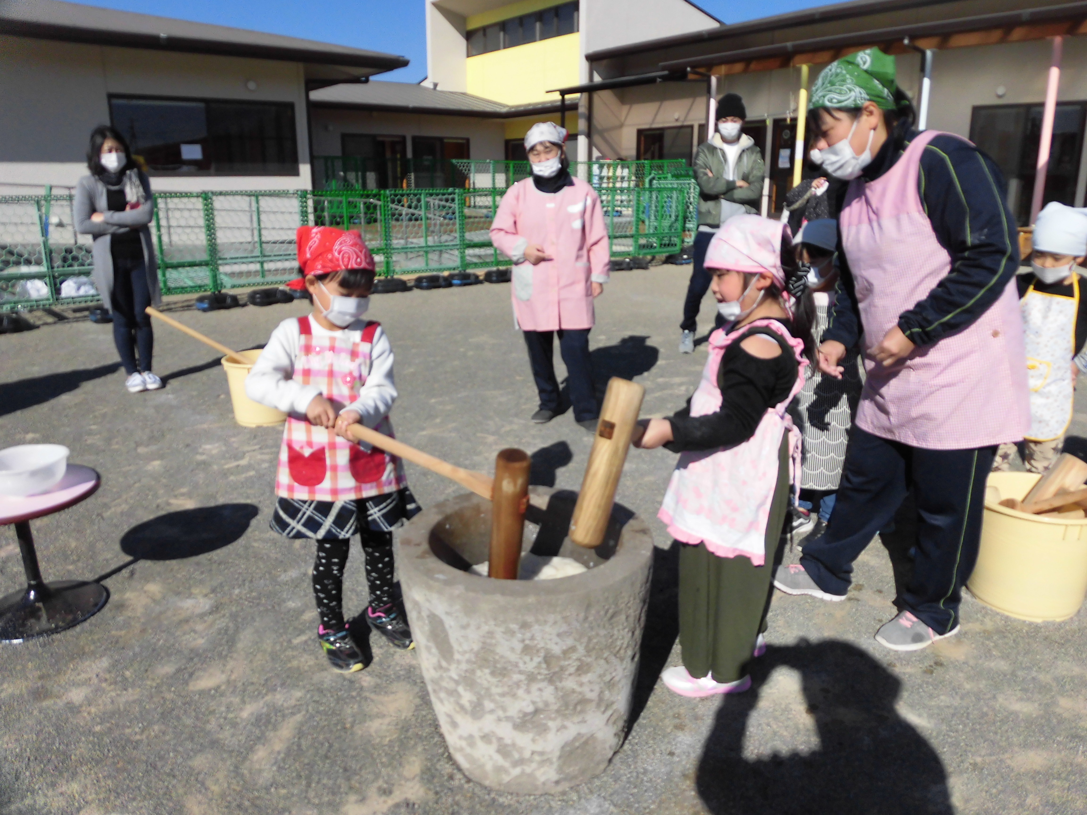 もちつき大会 12月9日(土) もちつき大会に参加しました。「ぺったんぺったんぺったんこ。」保護者の方の協力もあり子ども達はきねを大きく振りながら餅つきを楽しみました。 園児の兄弟や卒園児の小学生も参加しての餅つき大会となり、とても賑やかな会になりました。 子供たちは、つきあがった餅を醤油やきな粉をつけて美味しそうに食べていました。自分で丸めたお餅は格別に美味しかったようです。