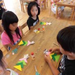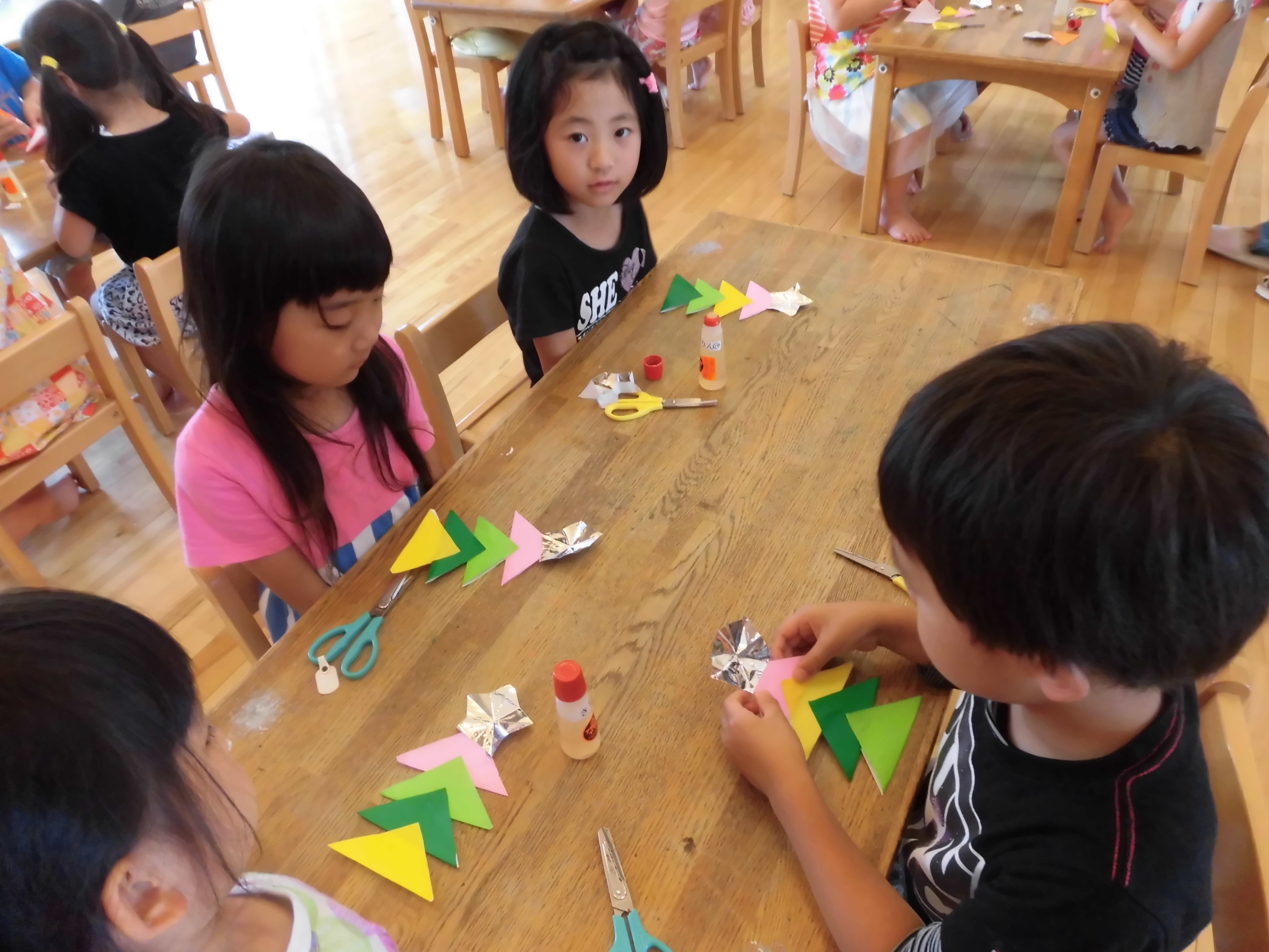 七夕さま 7月6日(木) 七夕飾りを作りました。 折り紙、のり、はさみでお星さまやちょうちん、スイカなど素敵な飾りが出来上がりました。短冊には家族の健康や幸せをお願いする言葉や自分の欲しい物、将来の夢など様々でした。 お願い事が叶いますように。