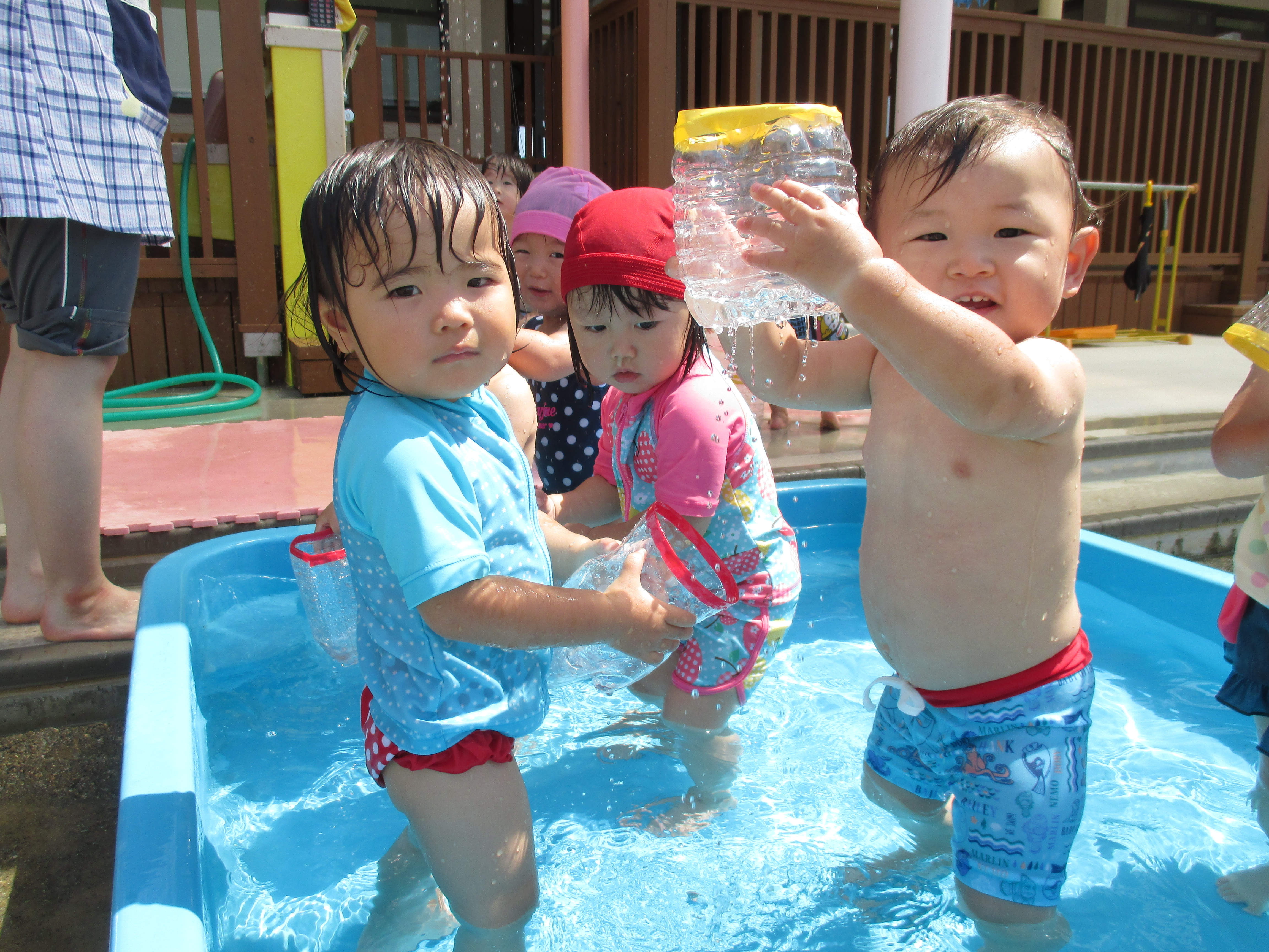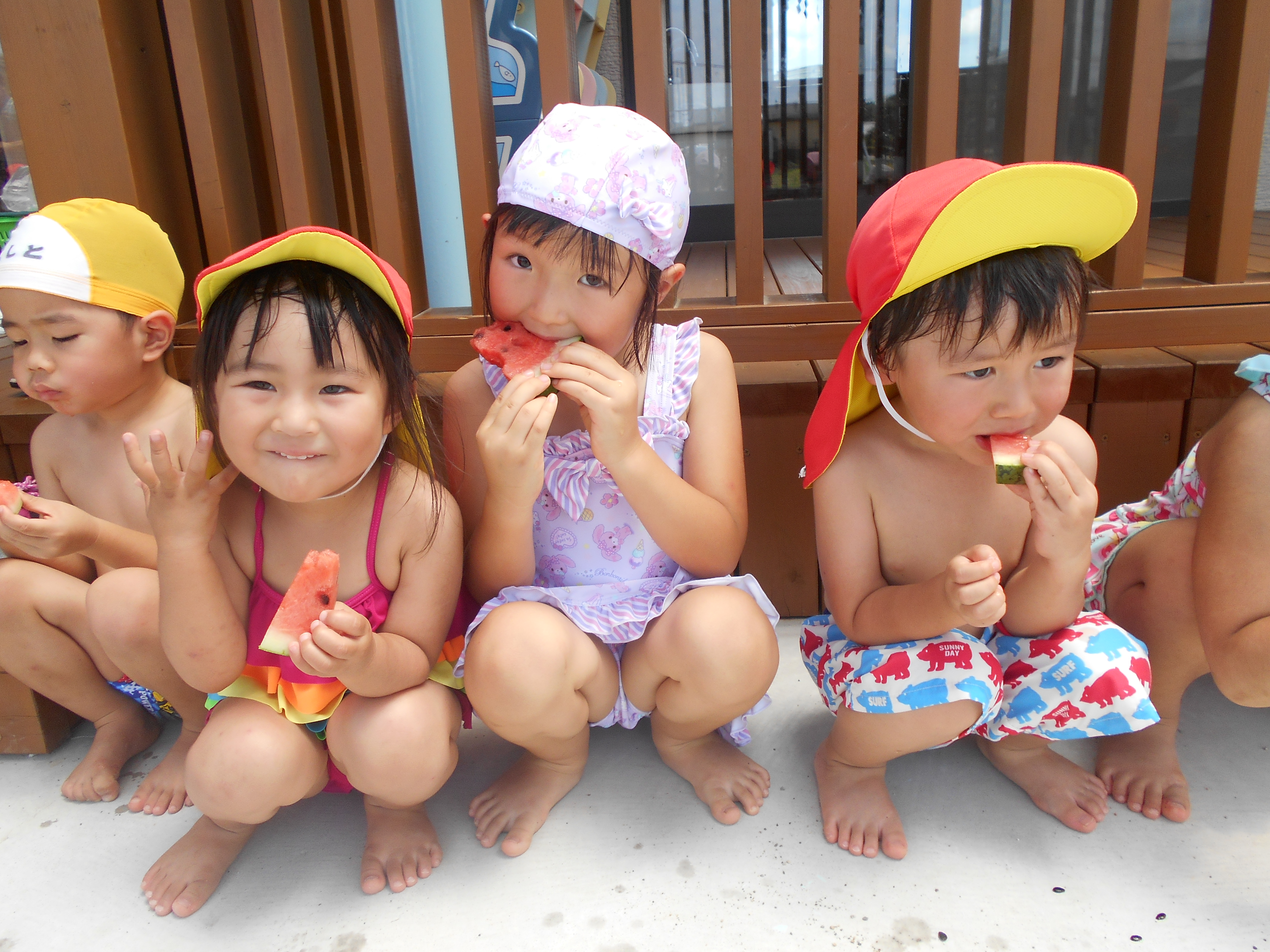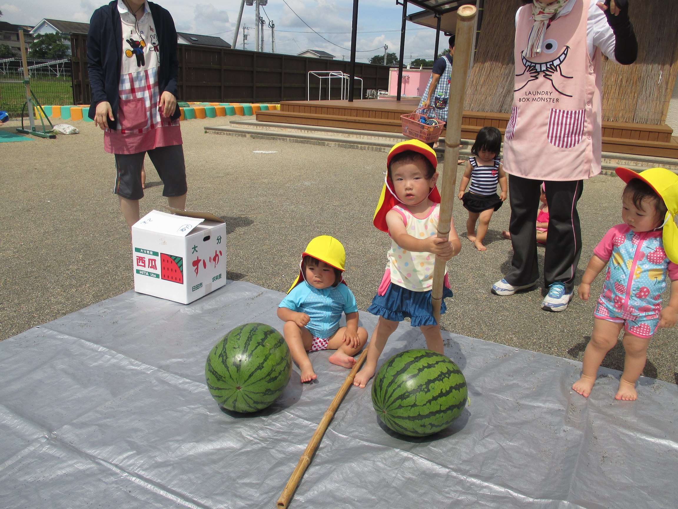 プール開き 7月11日(火) 待ちに待ったプール開きの日がやってきました。スイカ割りを楽しんだ後、甘いすいかを大きな口でパクリとほおばりました。その後、プール遊びや水遊びを楽しみました。 未満児クラスは、ペットボトルで作った遊具に水を入れたり出したりし、水しぶきがかかると「キャッキャッ」と笑い声。 以上児クラスのお友達は大きなプールで足をバタバタさせたり、水かけごっこ、最後は一方方向に何回も歩き、その水流を利用して流れるプールを楽しみました。