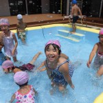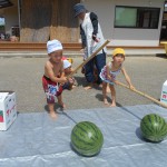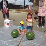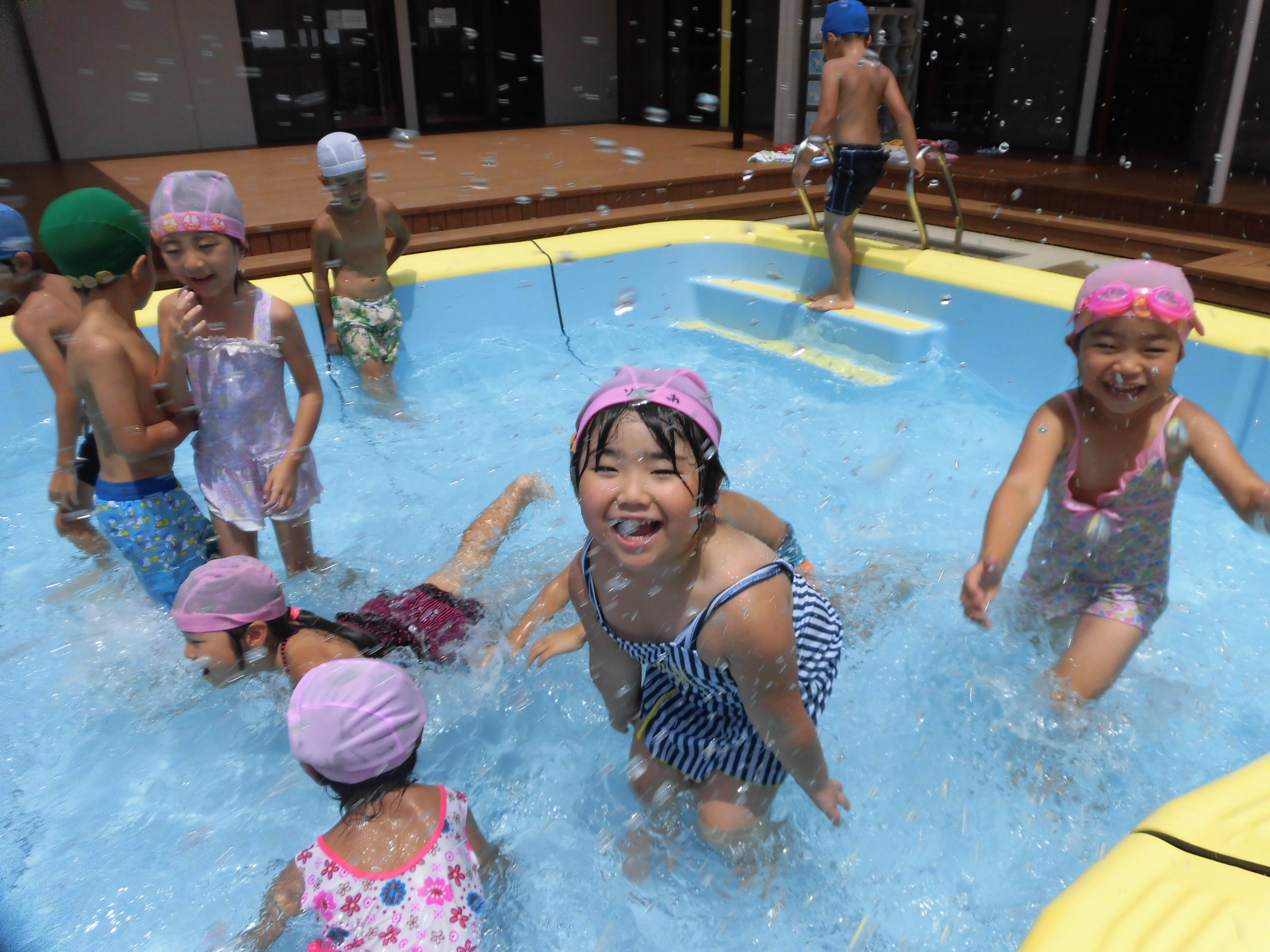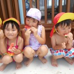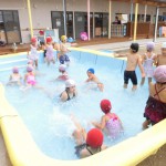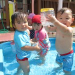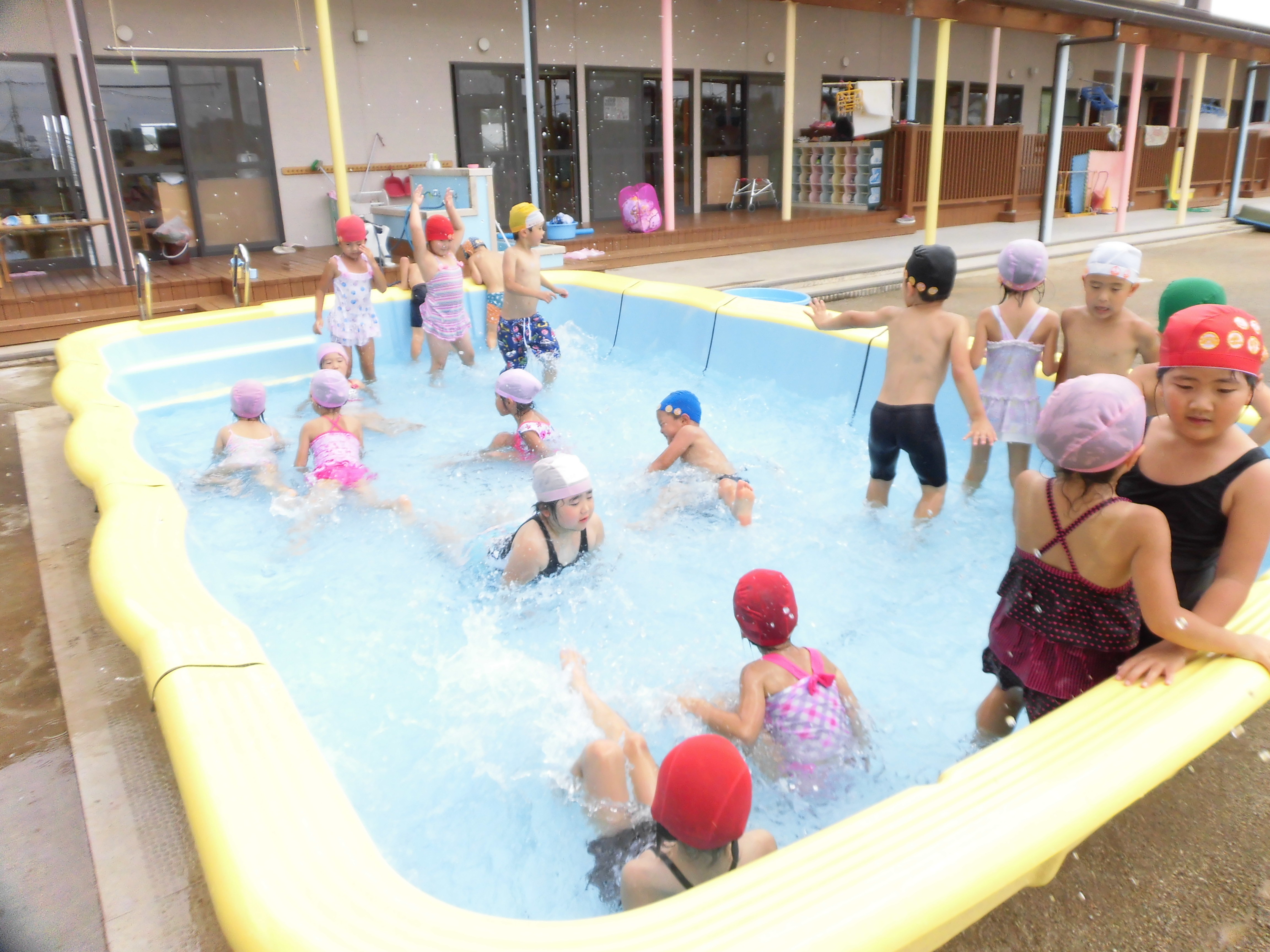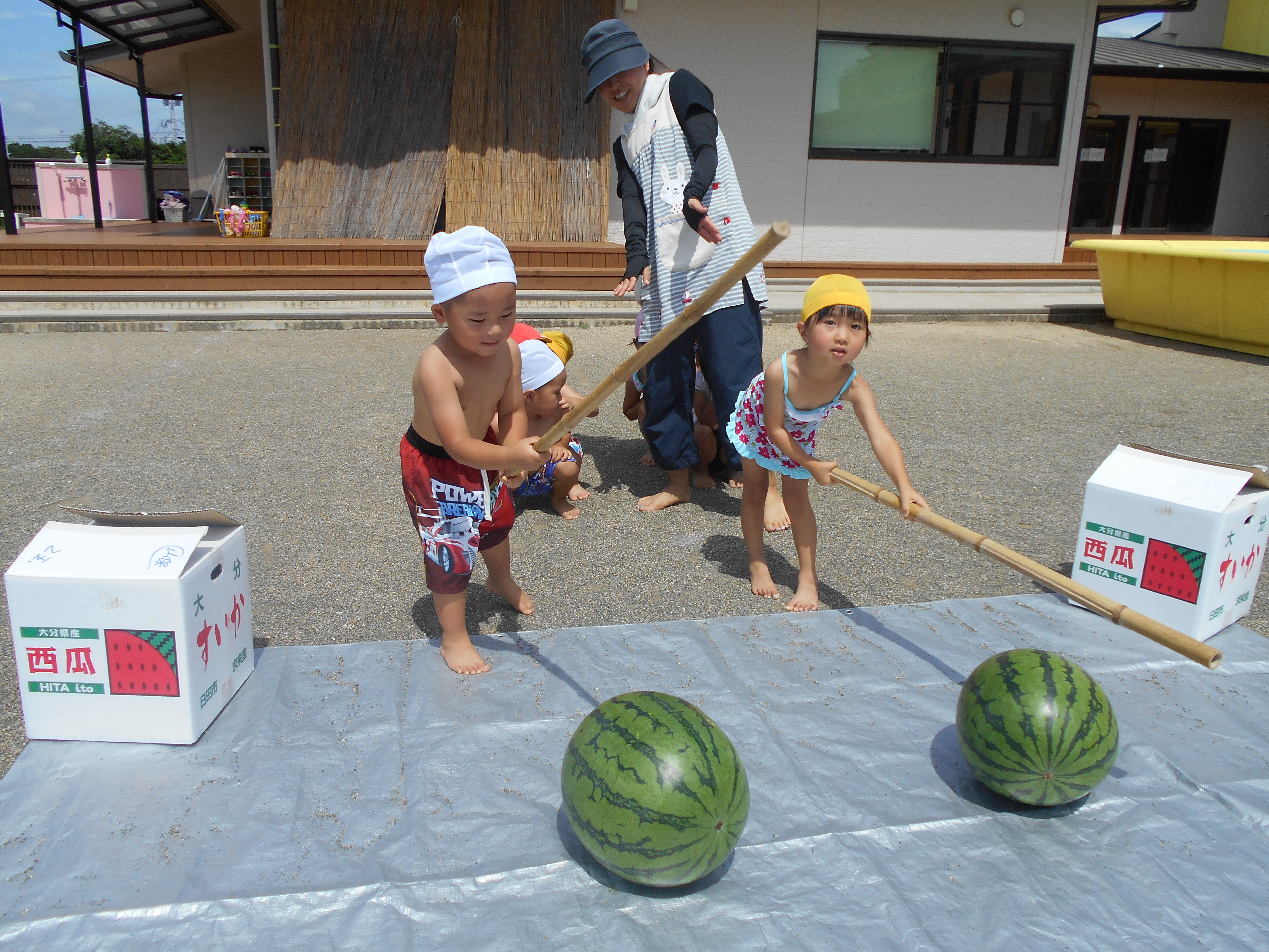 プール開き 7月11日(火) 待ちに待ったプール開きの日がやってきました。スイカ割りを楽しんだ後、甘いすいかを大きな口でパクリとほおばりました。その後、プール遊びや水遊びを楽しみました。 未満児クラスは、ペットボトルで作った遊具に水を入れたり出したりし、水しぶきがかかると「キャッキャッ」と笑い声。 以上児クラスのお友達は大きなプールで足をバタバタさせたり、水かけごっこ、最後は一方方向に何回も歩き、その水流を利用して流れるプールを楽しみました。
