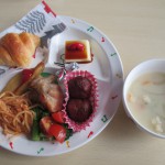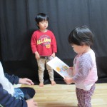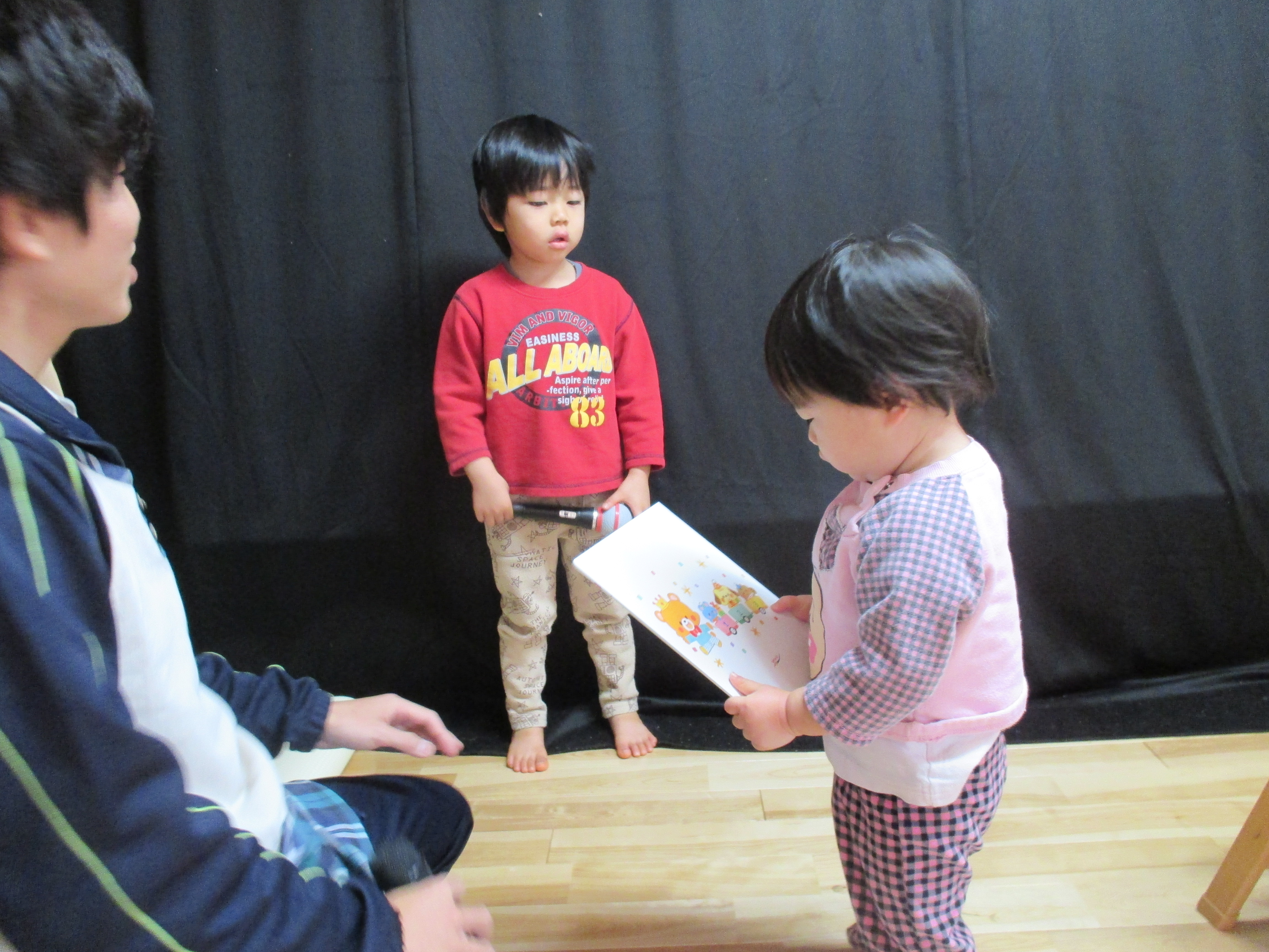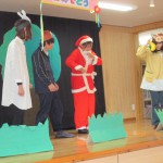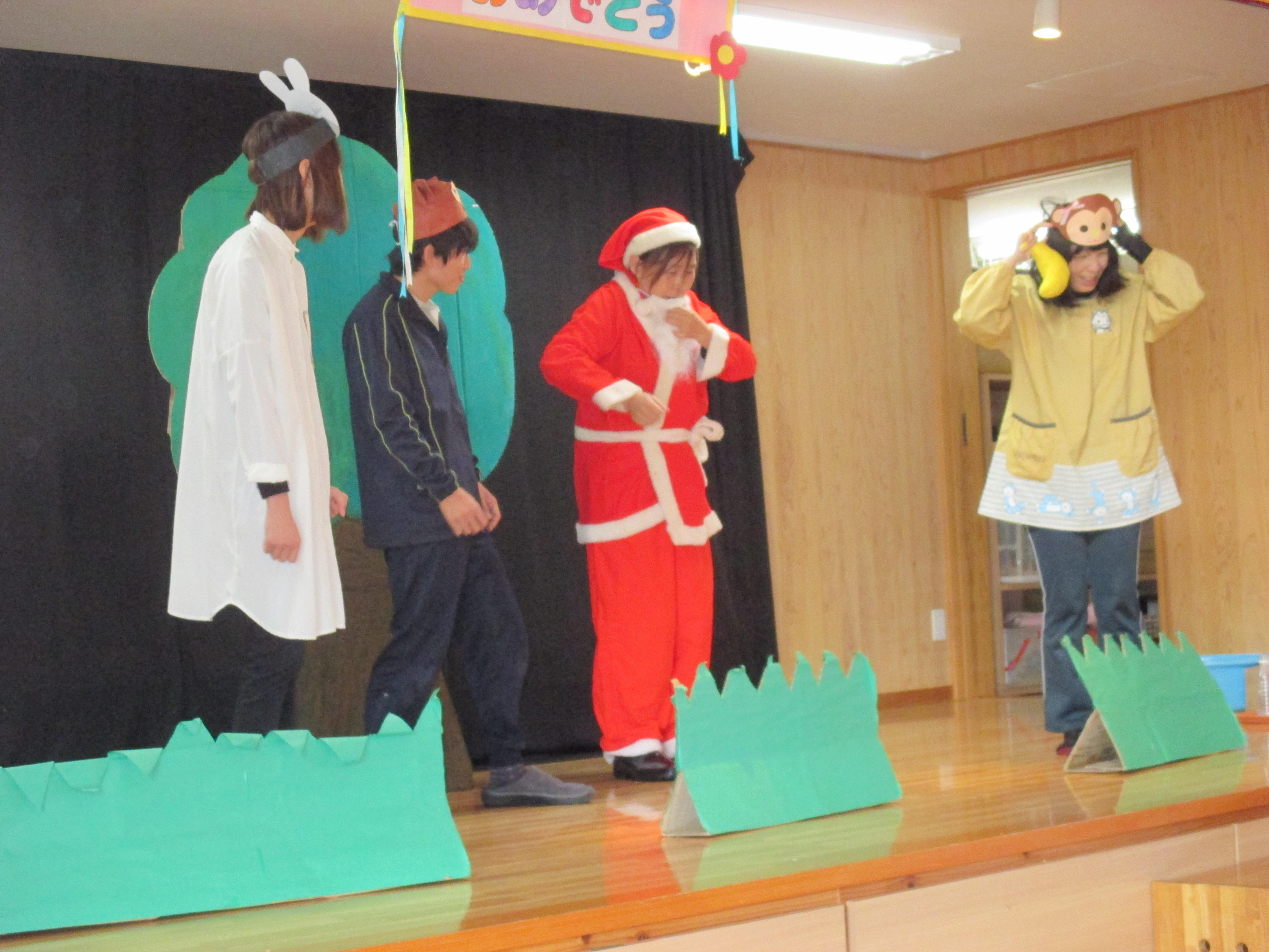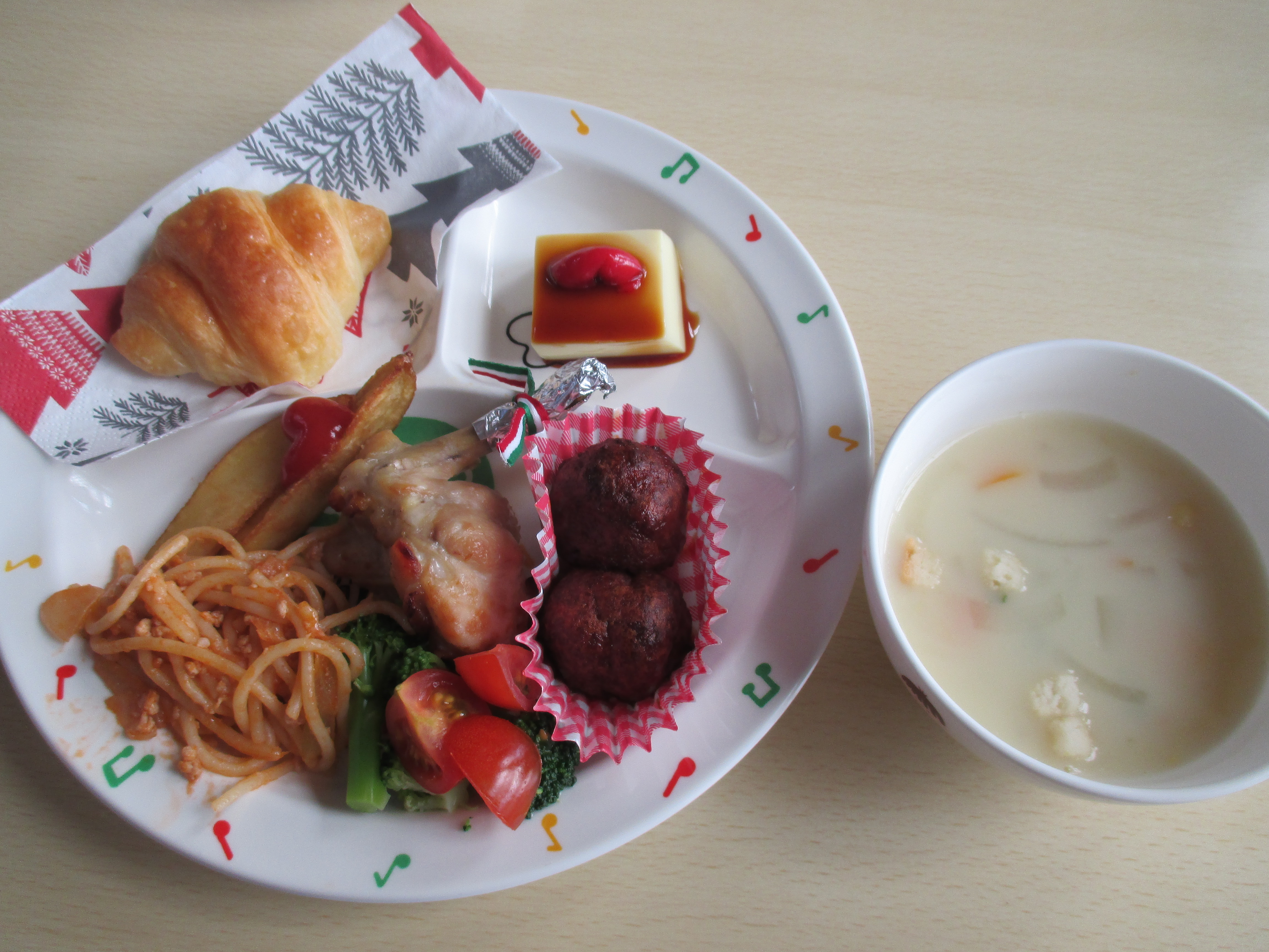 12月の誕生会 12月20日(水) 12月の誕生会はサンタさんの登場です。子どもたちは笑顔で「サンタさ~ん。」と大喜び!! 0・1歳クラスのお友達も今回は長い時間集中して劇を見ることができ、サンタさんの持つ鈴の音が楽しい雰囲気を作ってくれました。 クリスマスランチはクロワッサン、チキン、ポテトにデザート(プリン)でした。以上児のクラスはテーブルにお皿を並べ、バイキング形式で食事を楽しみました。 子ども達は、食事をしながらクリスマスプレゼントの話で盛り上がっていました。