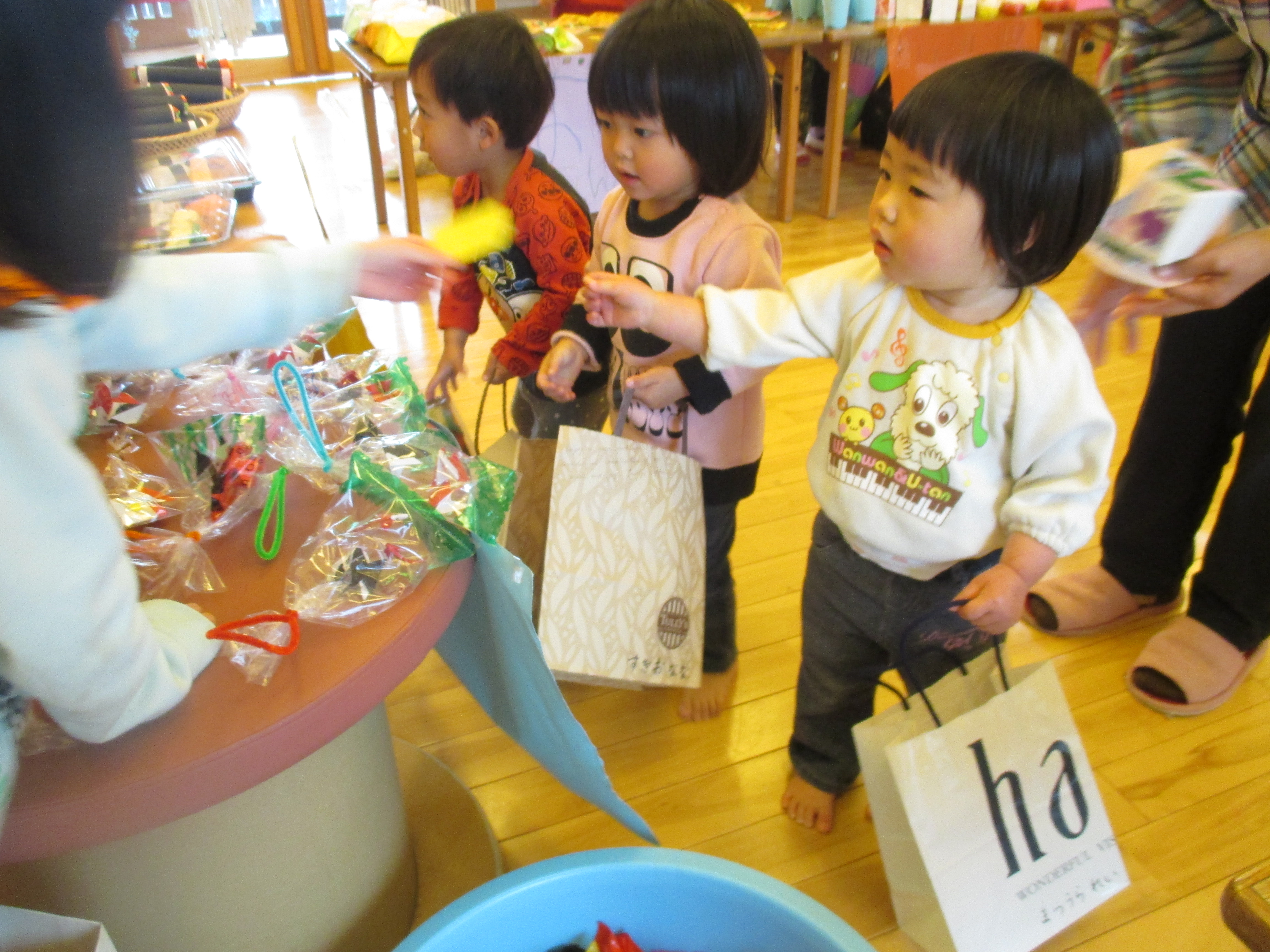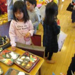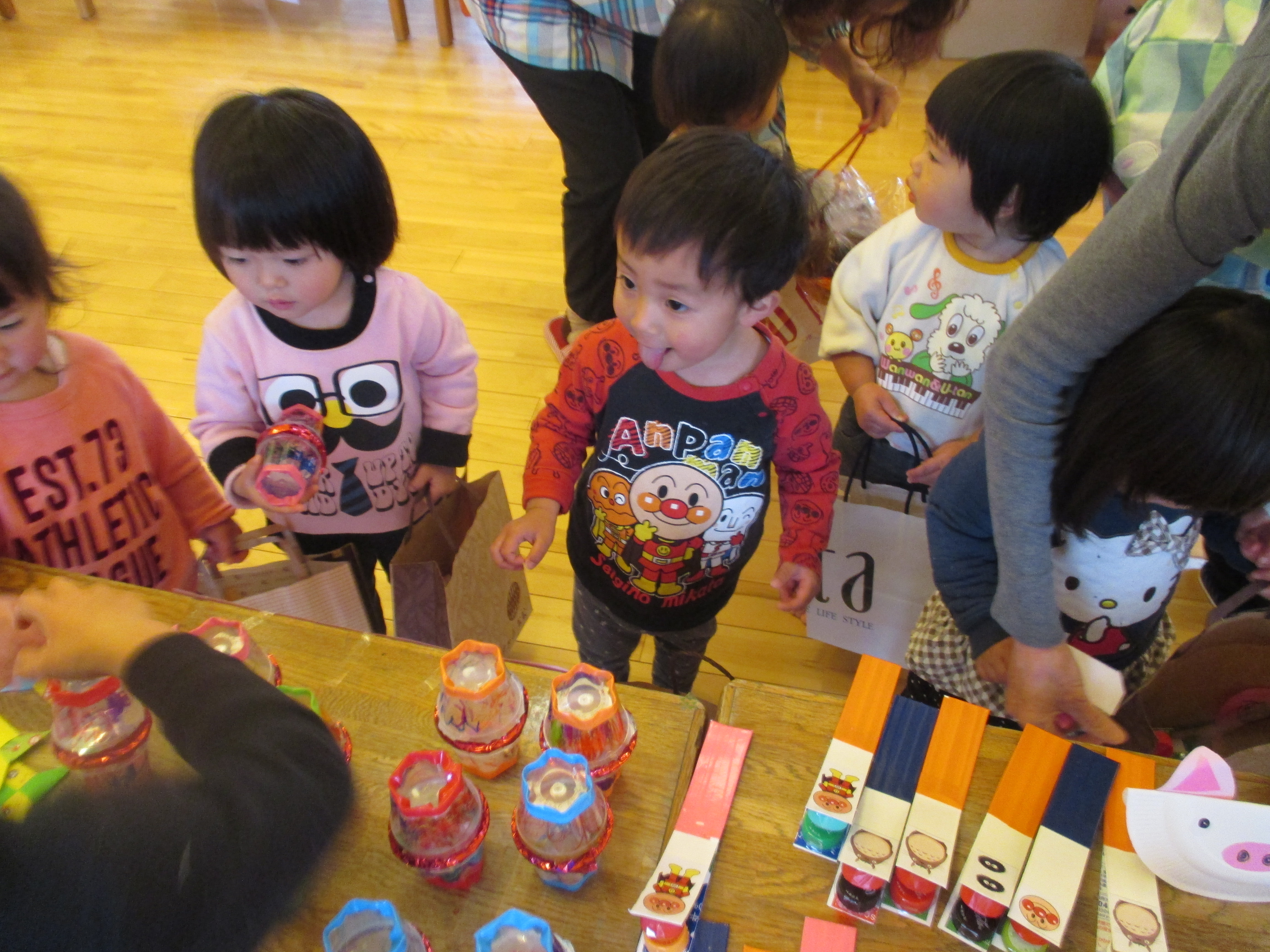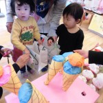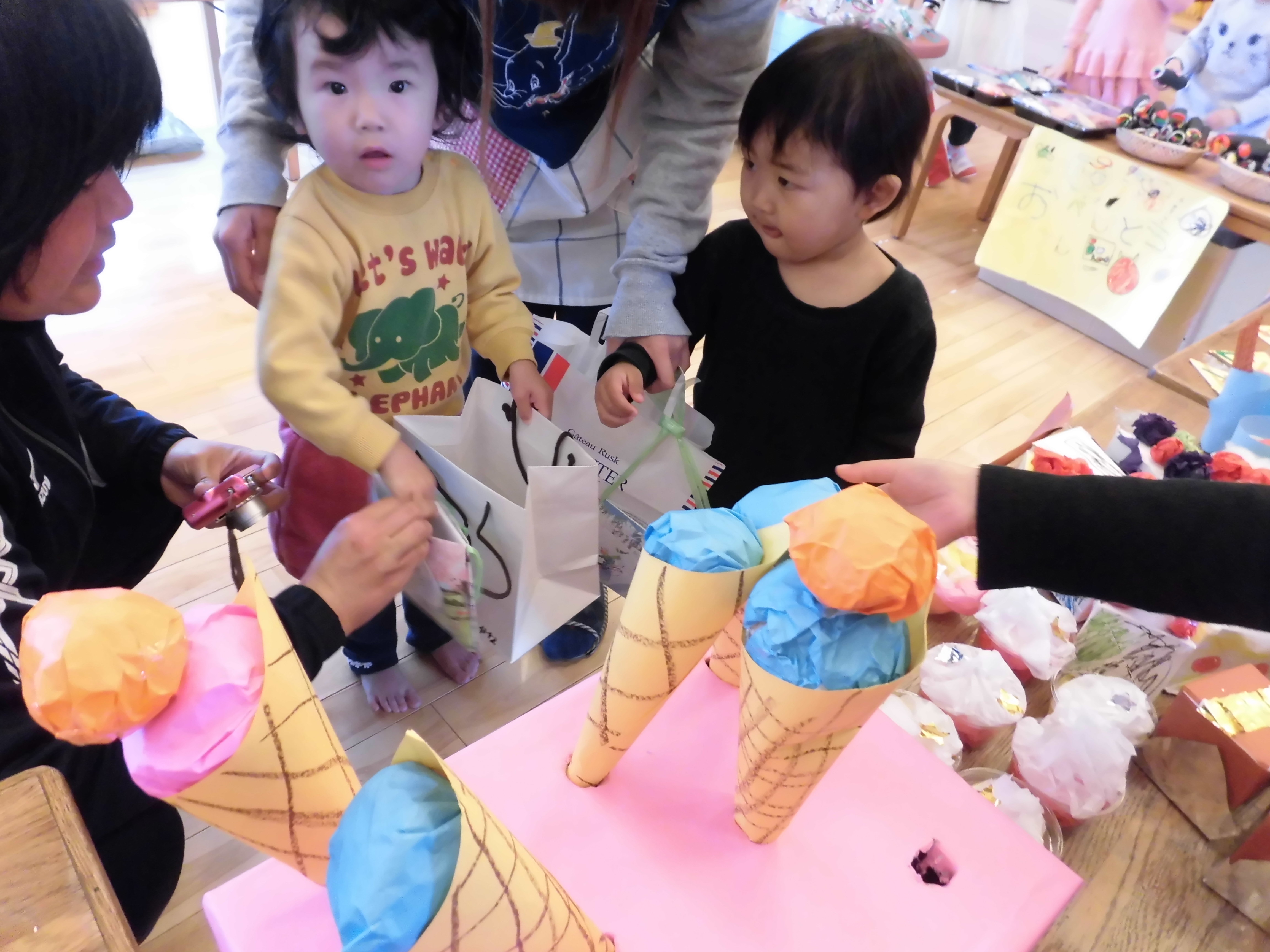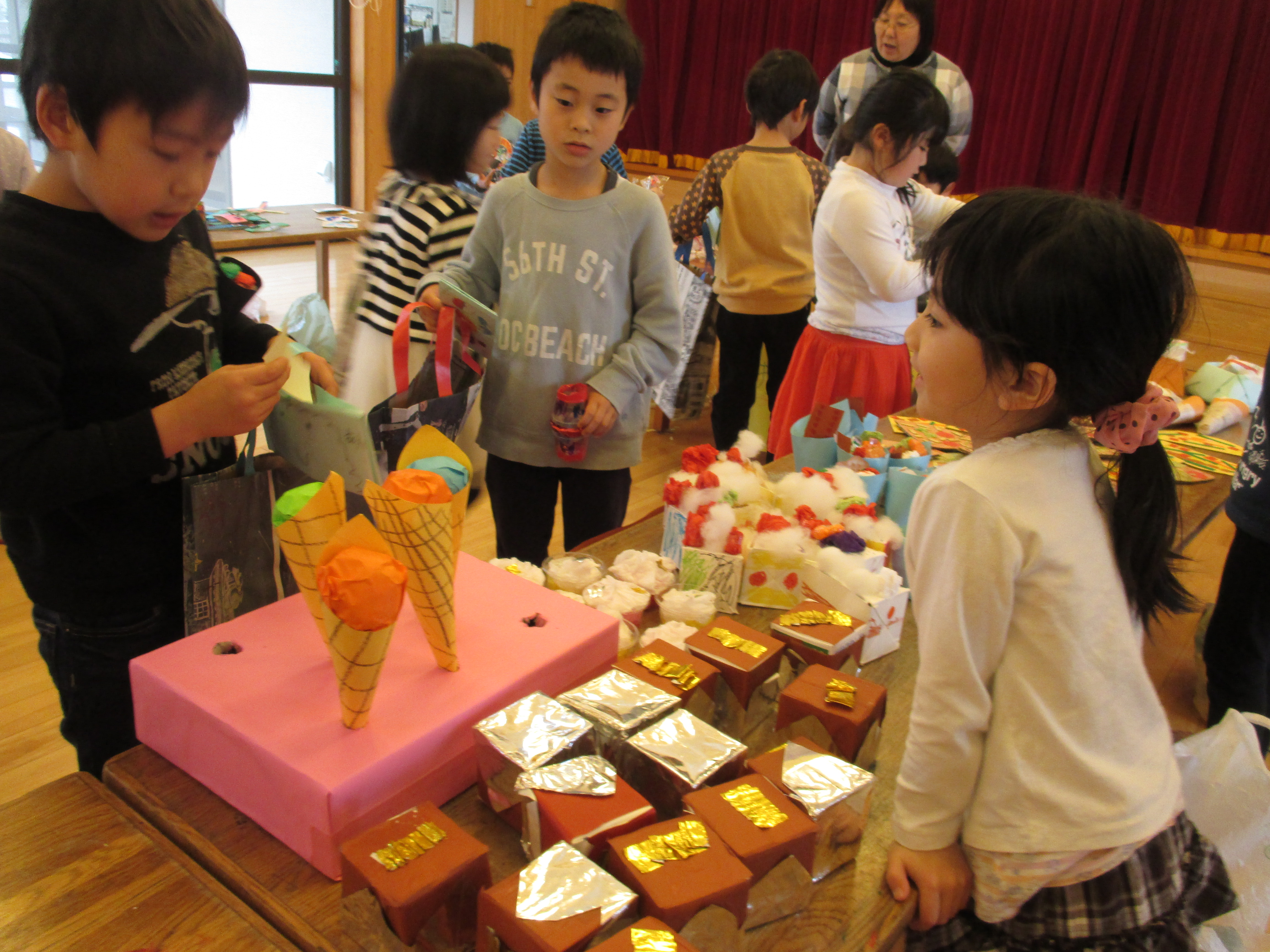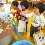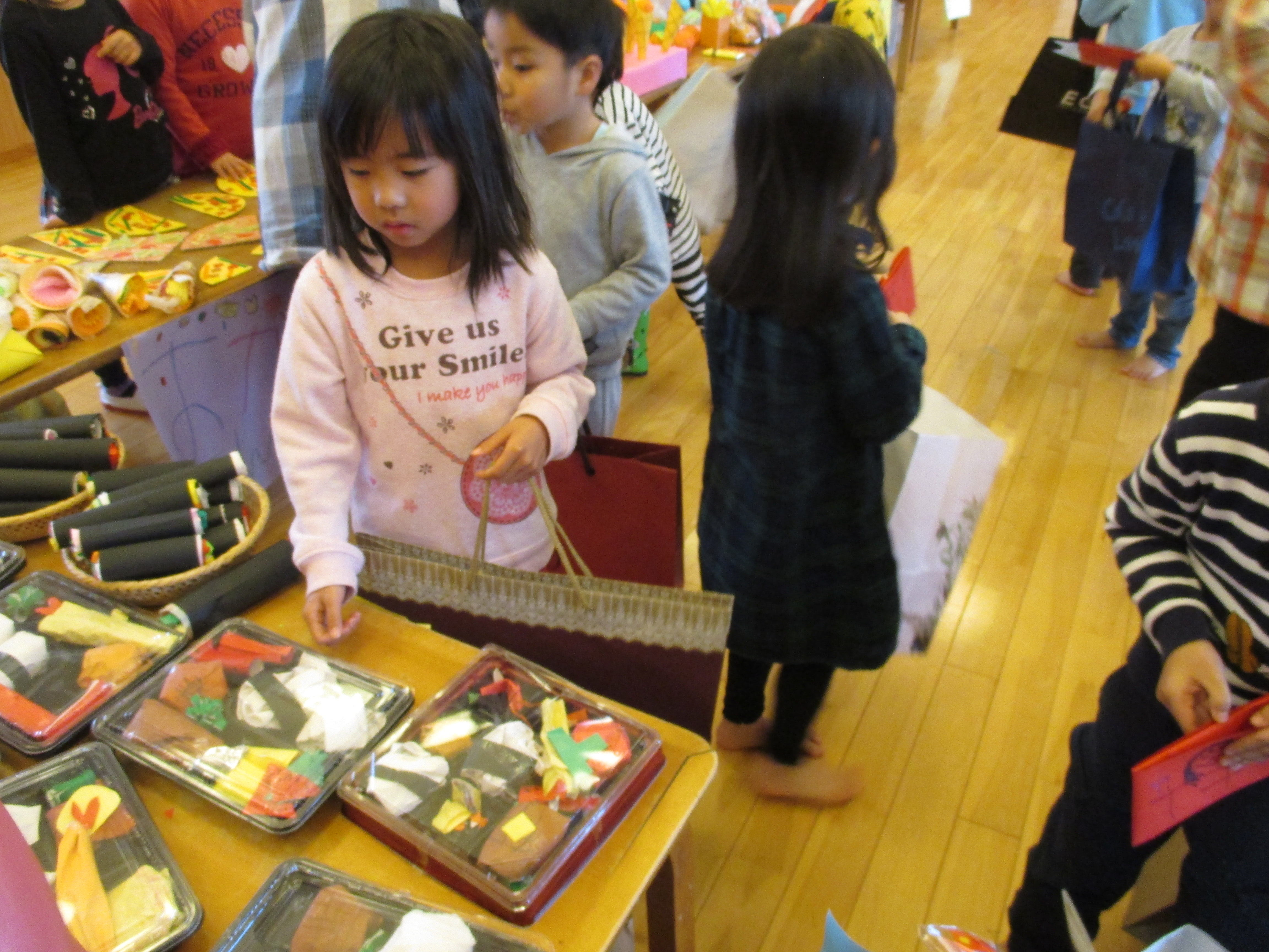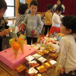 年長クラスの子ども達が、アイスクリームや玩具や花屋さん等のお店屋さんになりました。他のクラスの子ども達は、手づくりの財布とお金を持って自分の好きな物を選んでお買い物を楽しみました。