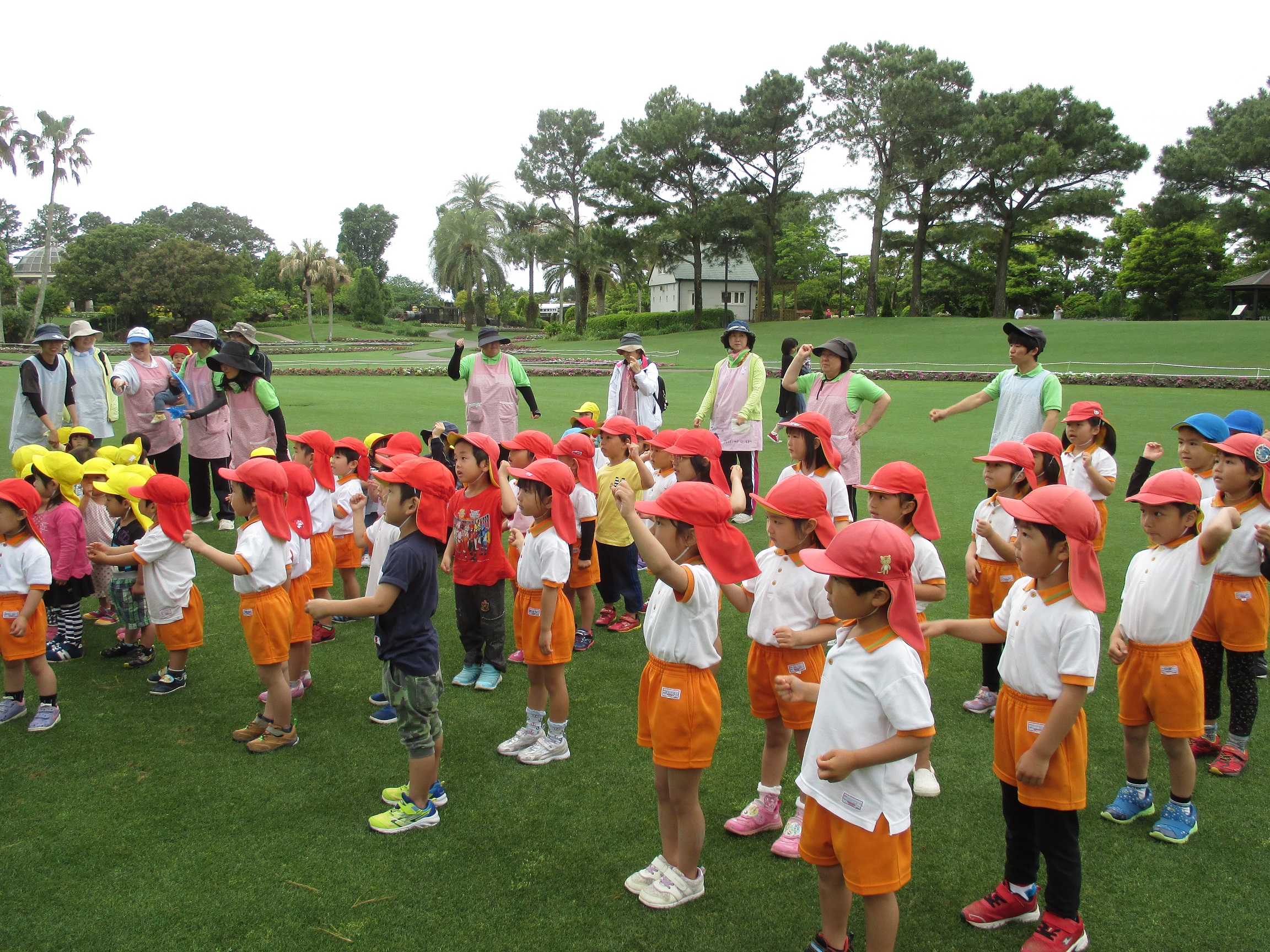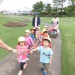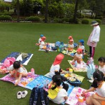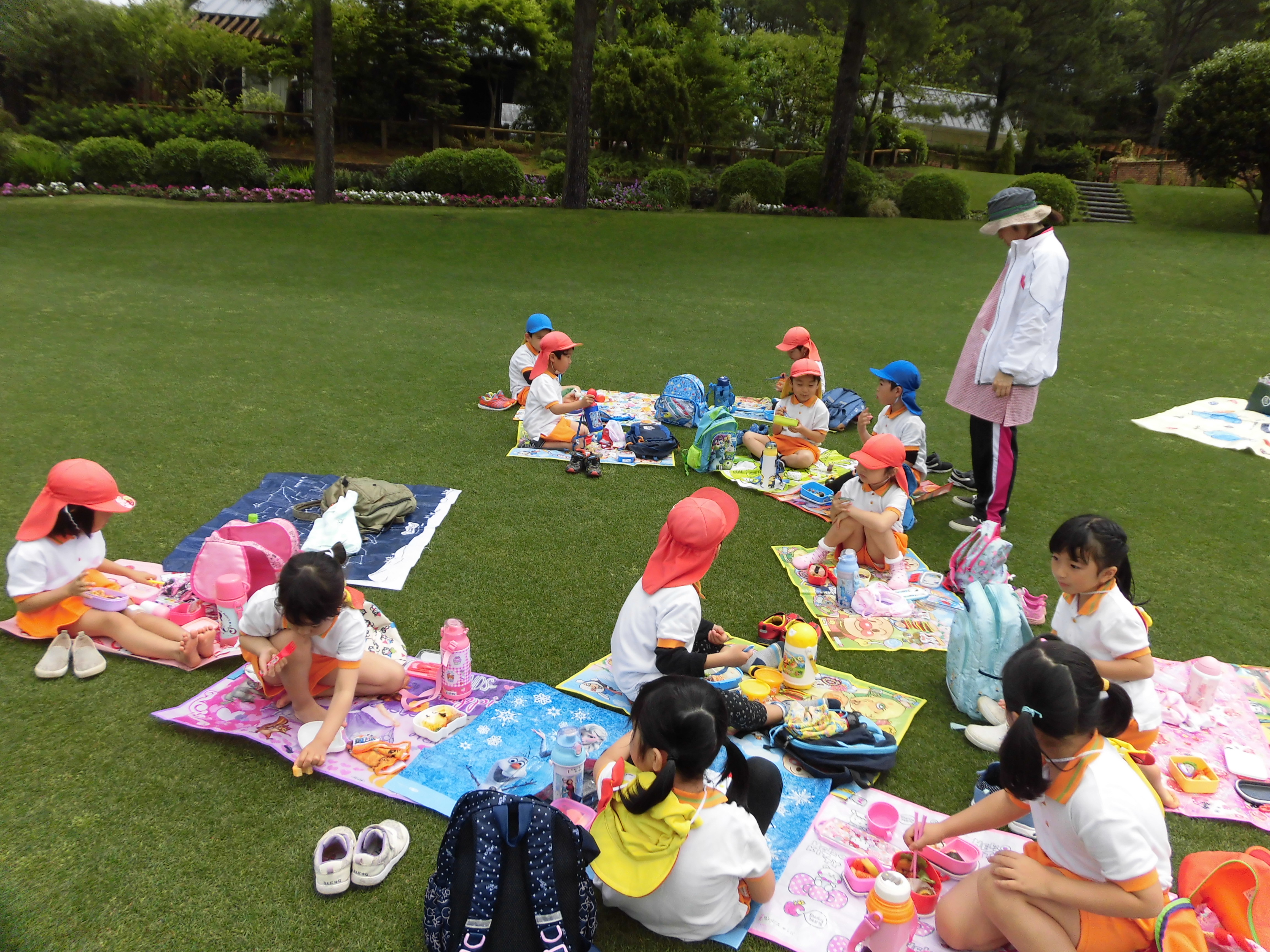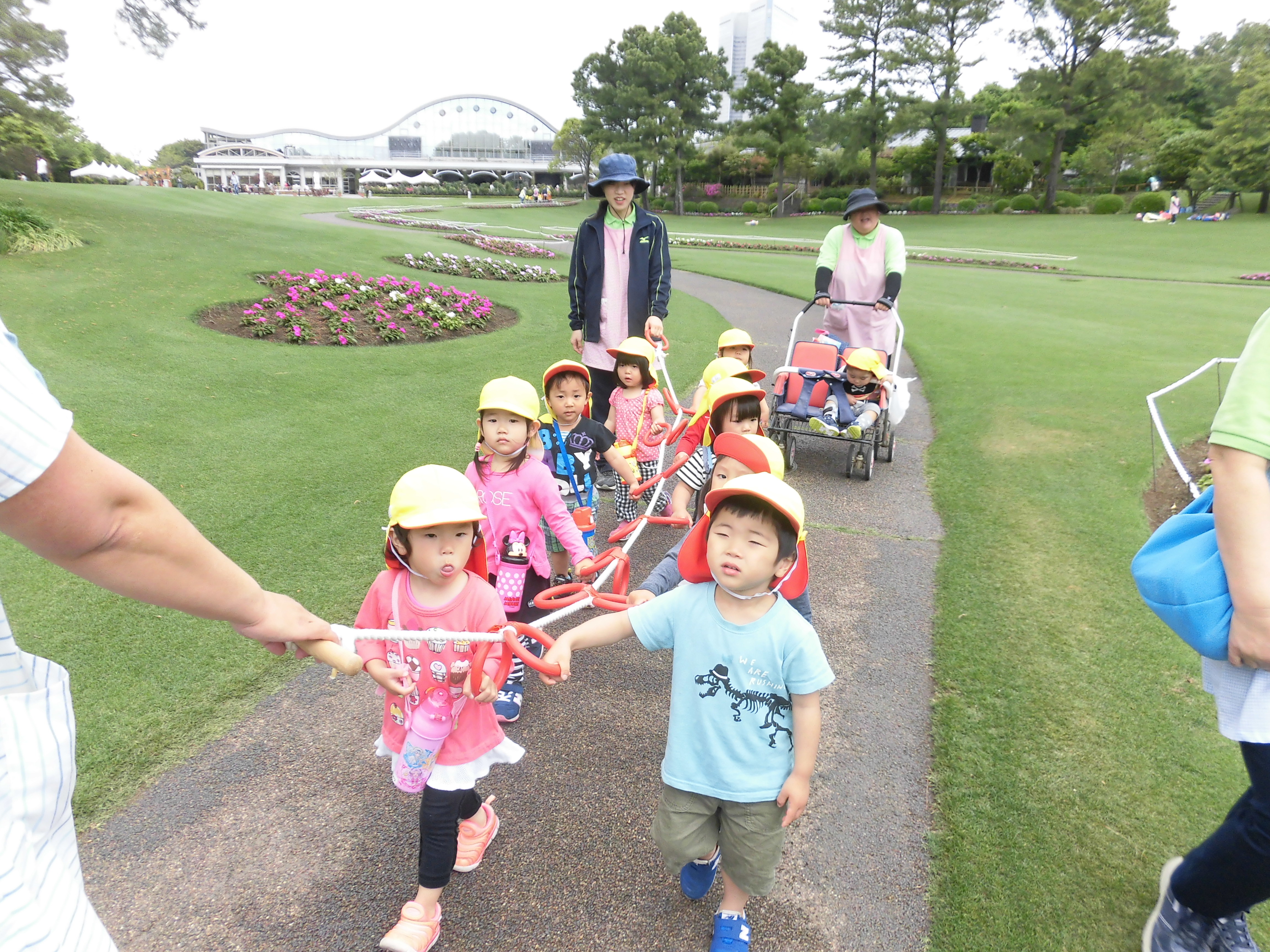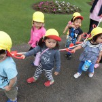 歓迎遠足 4月25日(水) フローランテ宮崎に歓迎遠足に行きました。 広場で季節の歌(チューリップ、小鳥の歌)を歌ったり、リュックサックをテーマにしたダンスを踊り楽しい時間を過ごしました。 4月の後半はチューリップからバラの花に植え替えがされており、甘い香りの中、お散歩を楽しむことができました。 アスレチックの汽車の滑り台やトンネルで遊んだ後は、お家の方の手作り弁当をいただきました。子どもたちは、友達に自分の弁当を見せながら美味しそうに食べていました。