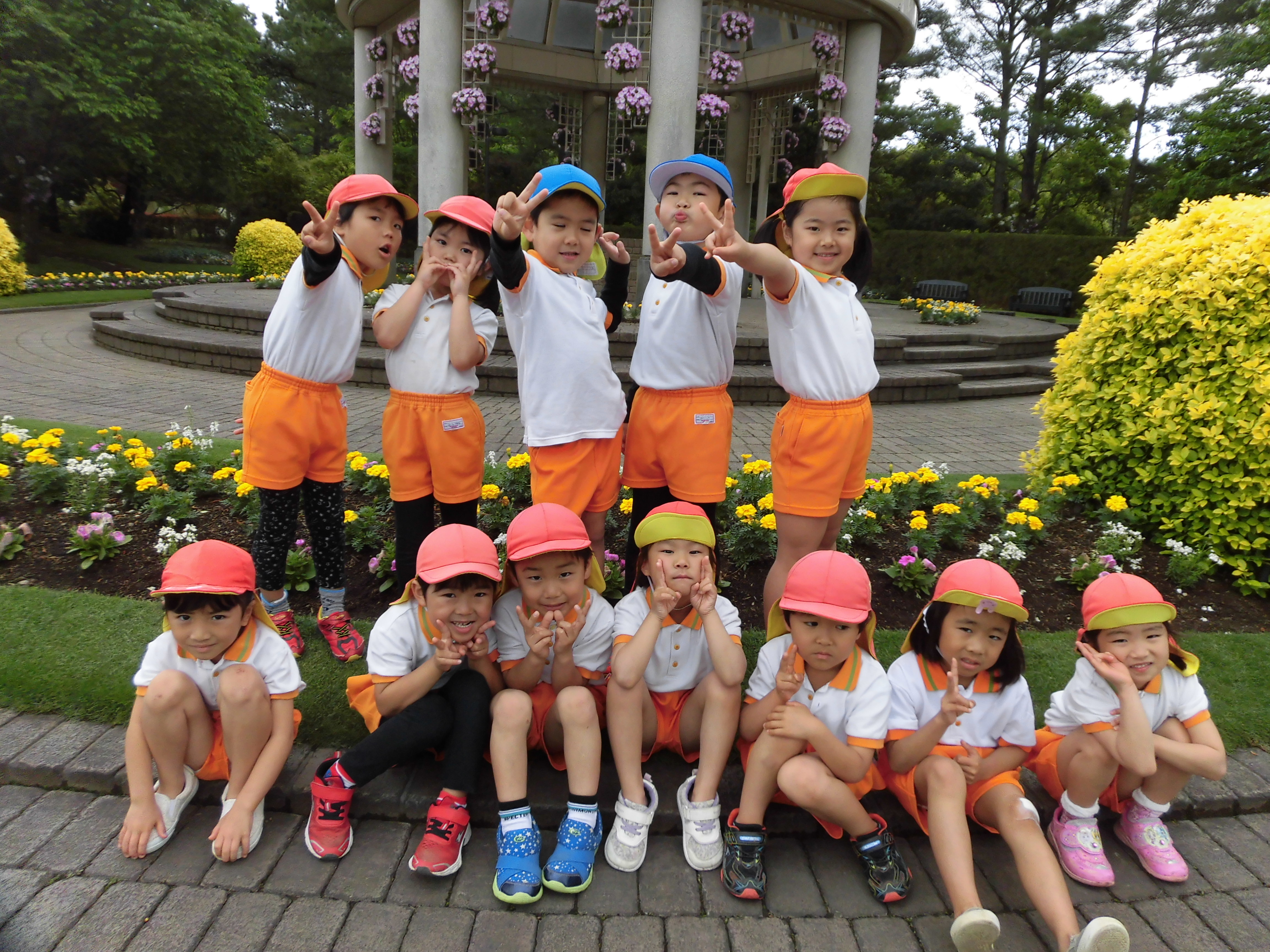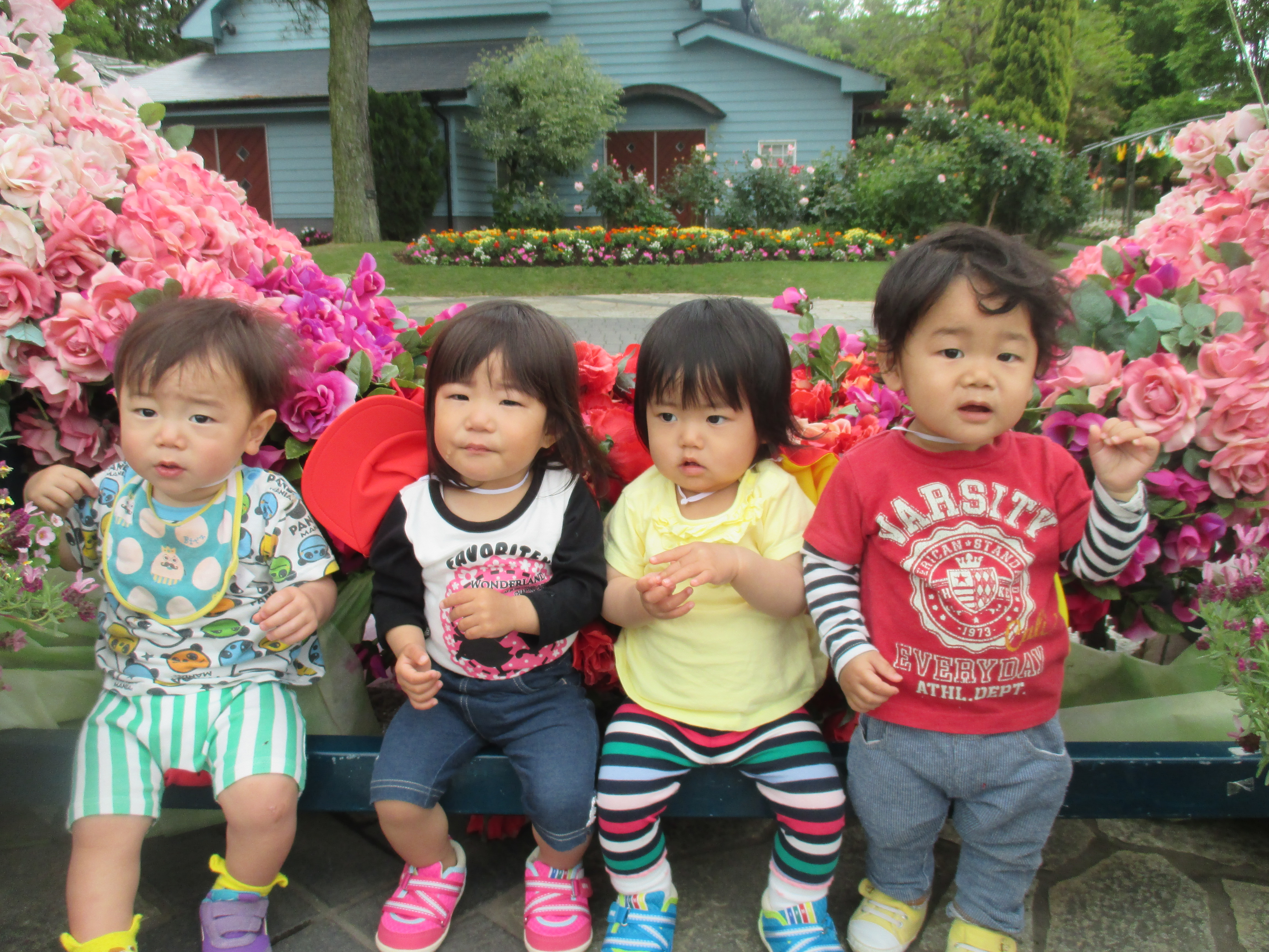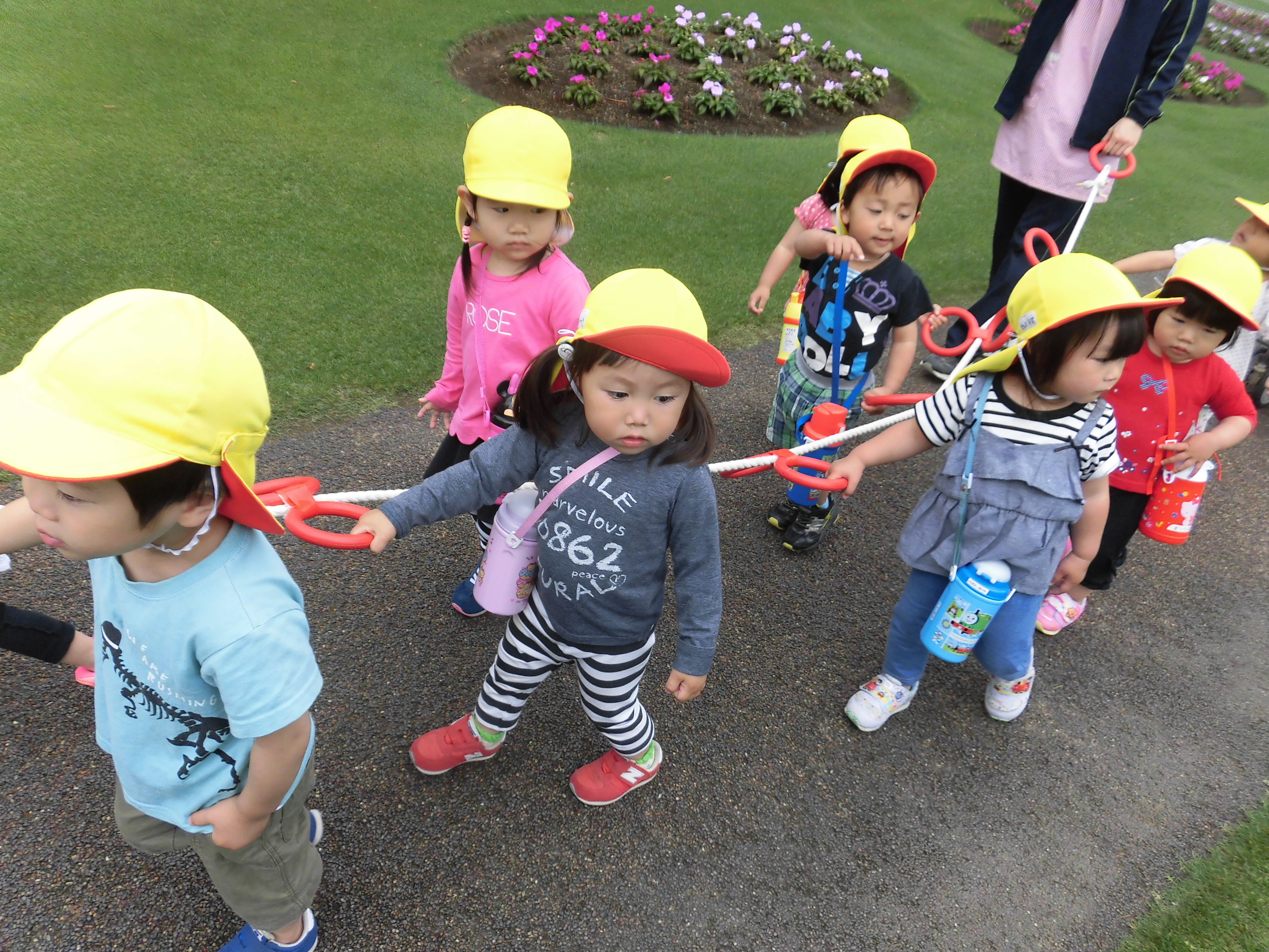 歓迎遠足 4月25日(水) フローランテ宮崎に歓迎遠足に行きました。 広場で季節の歌(チューリップ、小鳥の歌)を歌ったり、リュックサックをテーマにしたダンスを踊り楽しい時間を過ごしました。 4月の後半はチューリップからバラの花に植え替えがされており、甘い香りの中、お散歩を楽しむことができました。 アスレチックの汽車の滑り台やトンネルで遊んだ後は、お家の方の手作り弁当をいただきました。子どもたちは、友達に自分の弁当を見せながら美味しそうに食べていました。