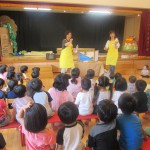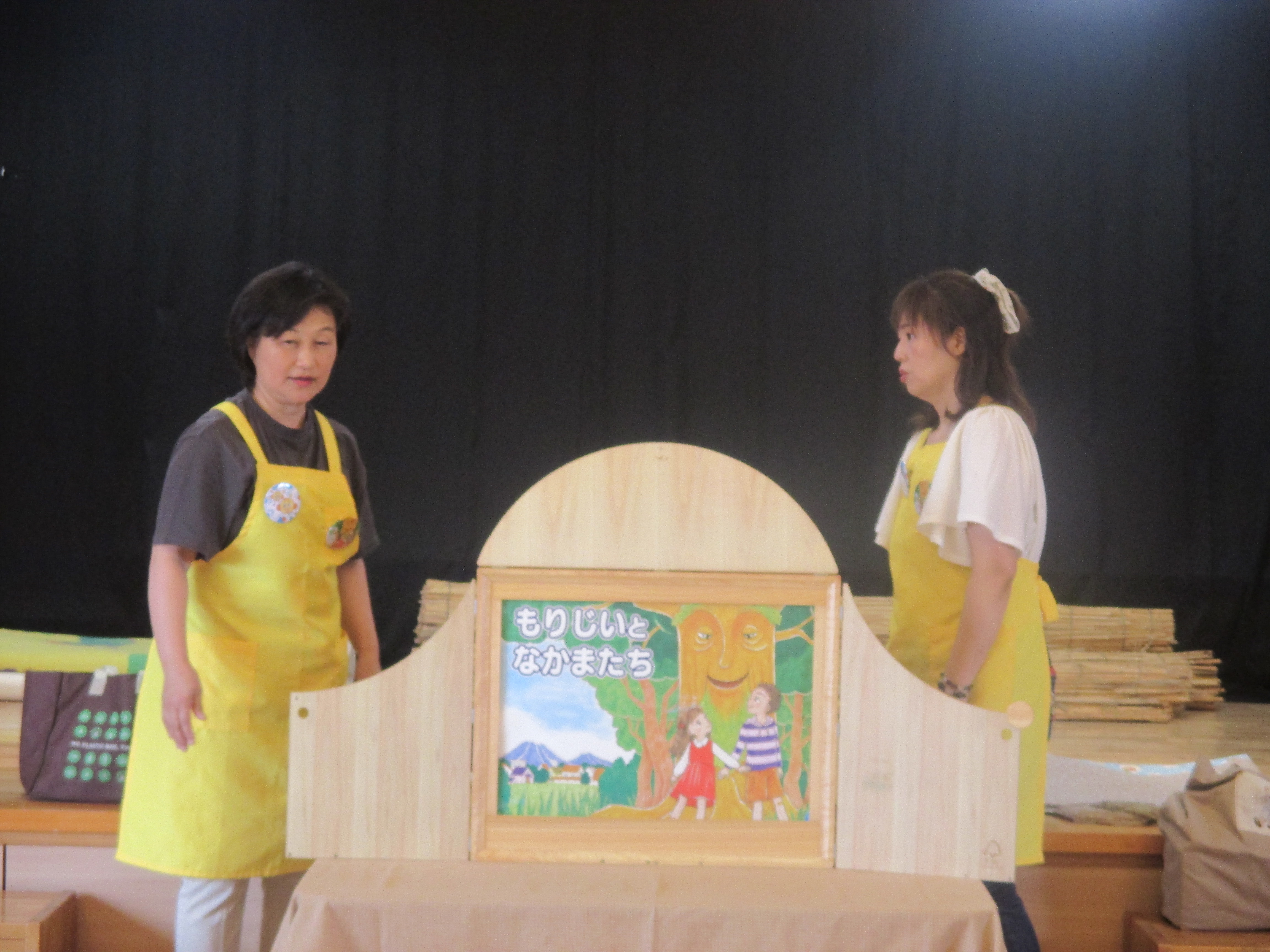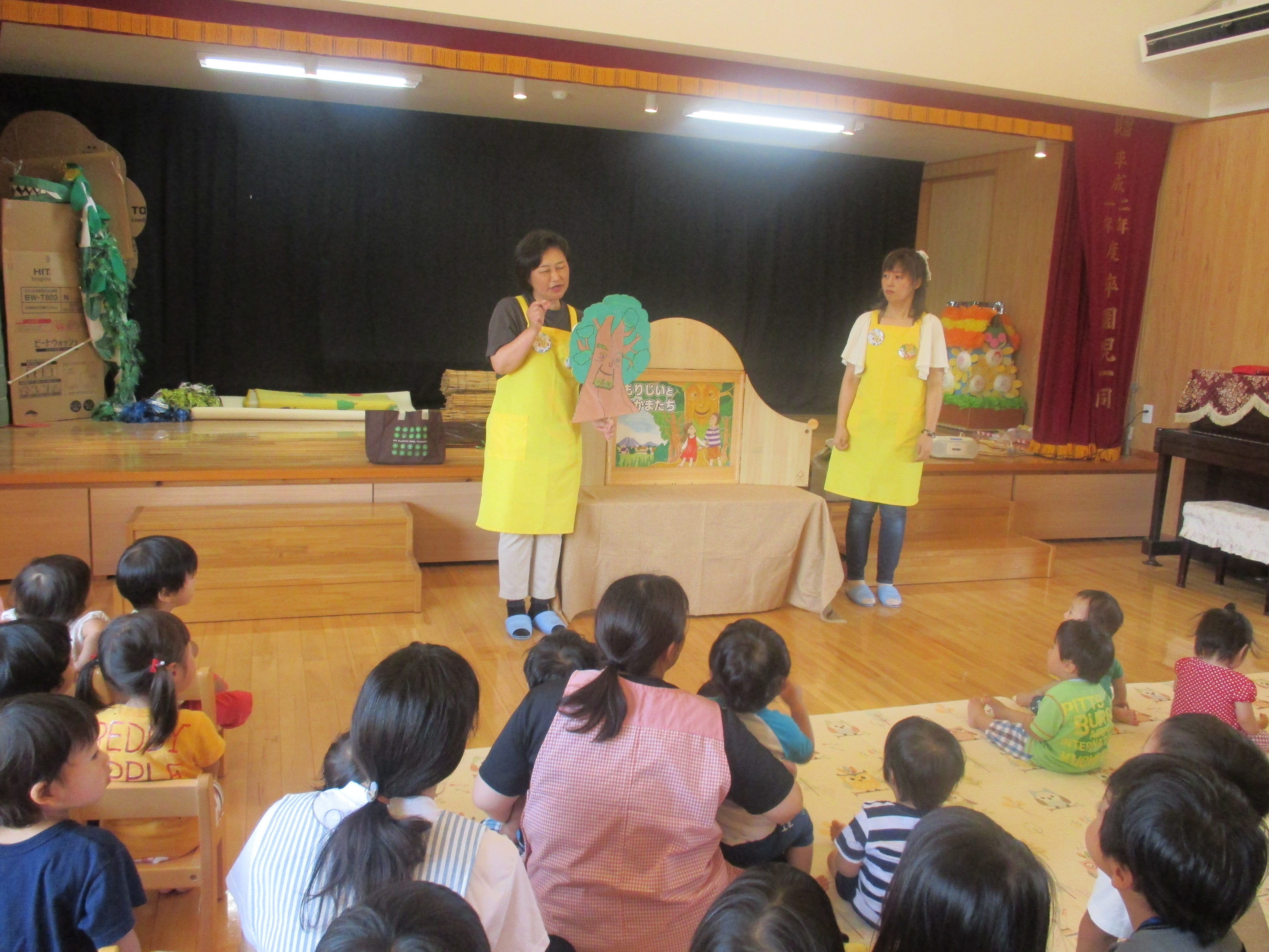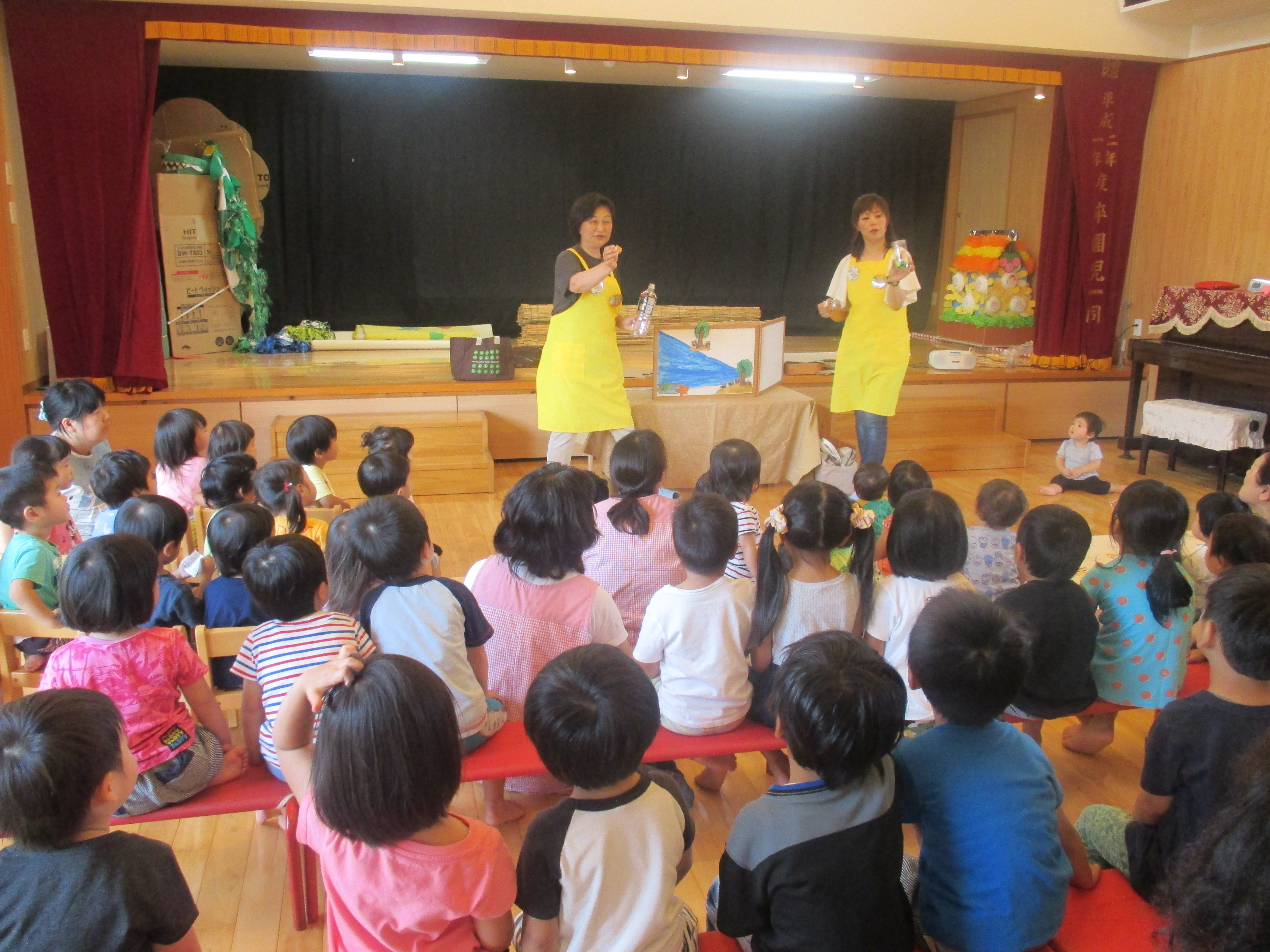 エコ・マザー 6月27日(水) エコ・マザーに参加しました。 環境紙芝居「森じいと仲間たち」は、地球温暖化や河川汚染など環境問題について環境を守るため、自分たちに何ができるのかを問いかけるお話でした。 子どもたちは、ゴミの分別の仕方やゴミとして出すペットボトルが再利用されるという話を真剣な表情で聞いていました。 保育園でも日頃から「燃えるゴミ」「燃えないゴミ」の話をし、一緒に分別しながら、ゴミを分別して捨てるという習慣を身に付けていきたいです。