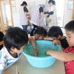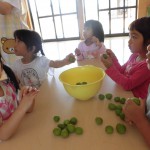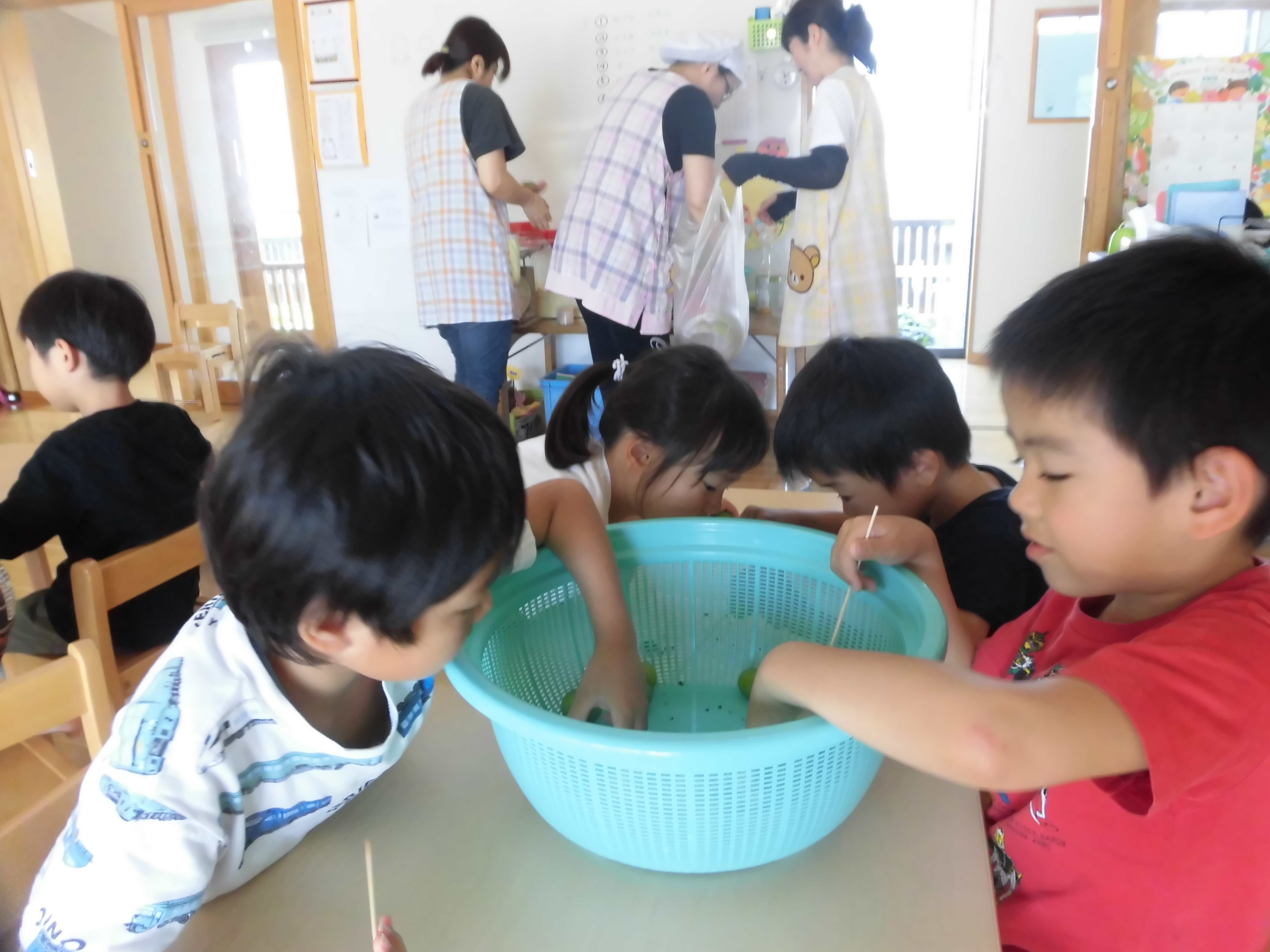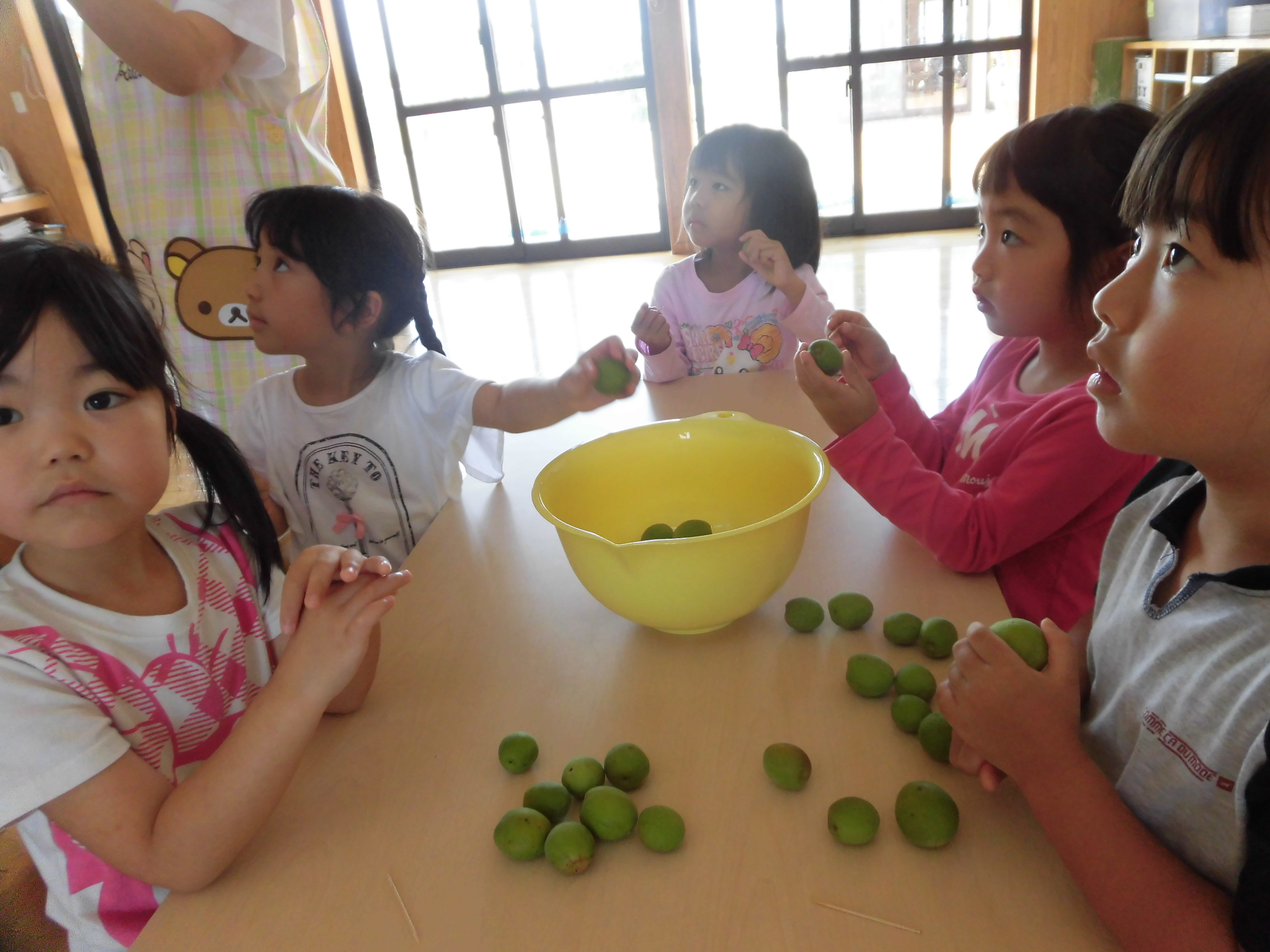 梅ジュース 5月15日(火) 保護者の方から頂いた梅を、氷砂糖と酢で合わせて梅ジュースを作りました。 つまようじで梅に穴をあけ、ガラスの容器に梅と氷砂糖を交互に入れる作業を子どもたちが行いました。 2カ月後には酸味のある美味しい梅ジュースができる予定。楽しみですね。