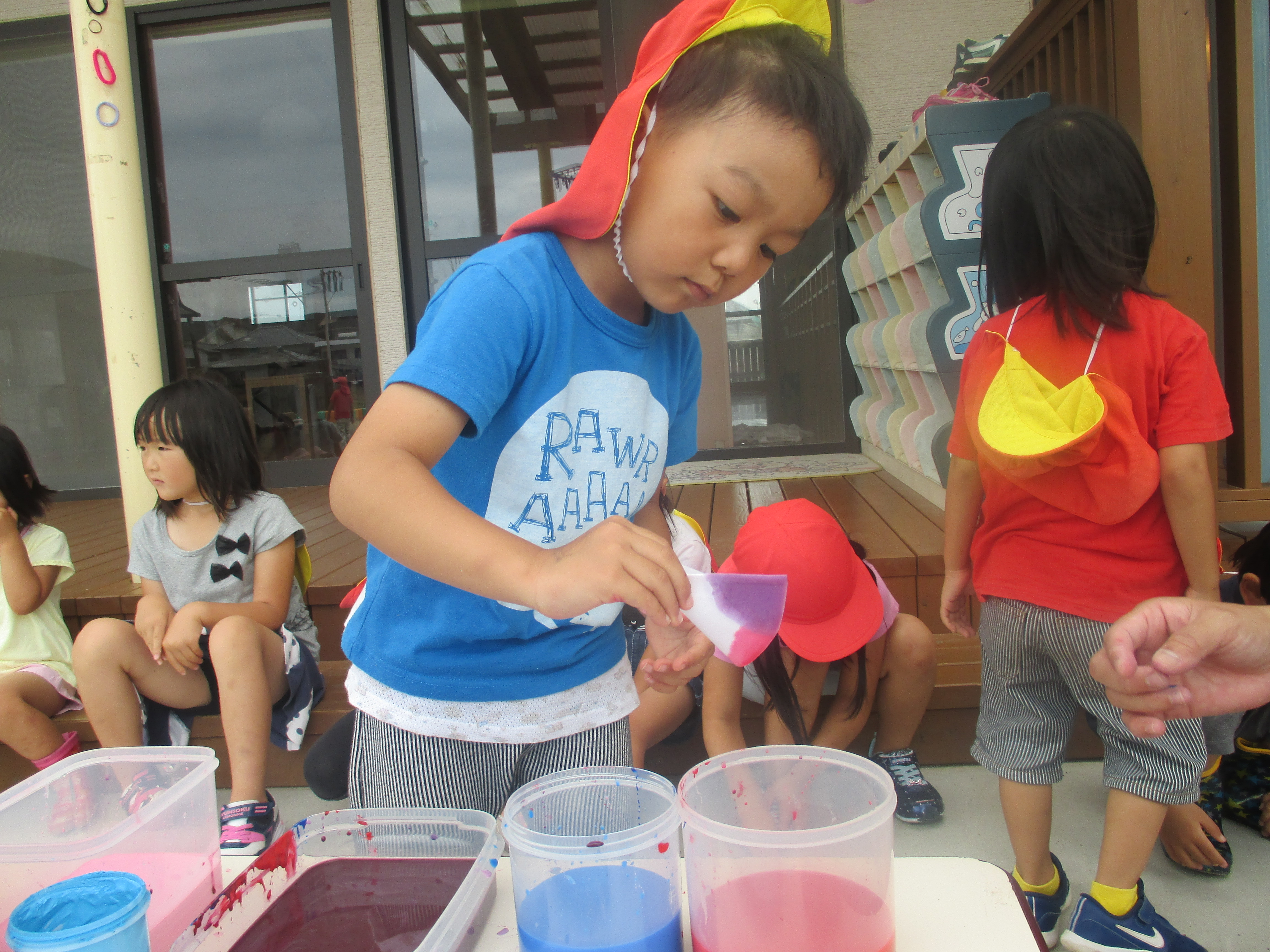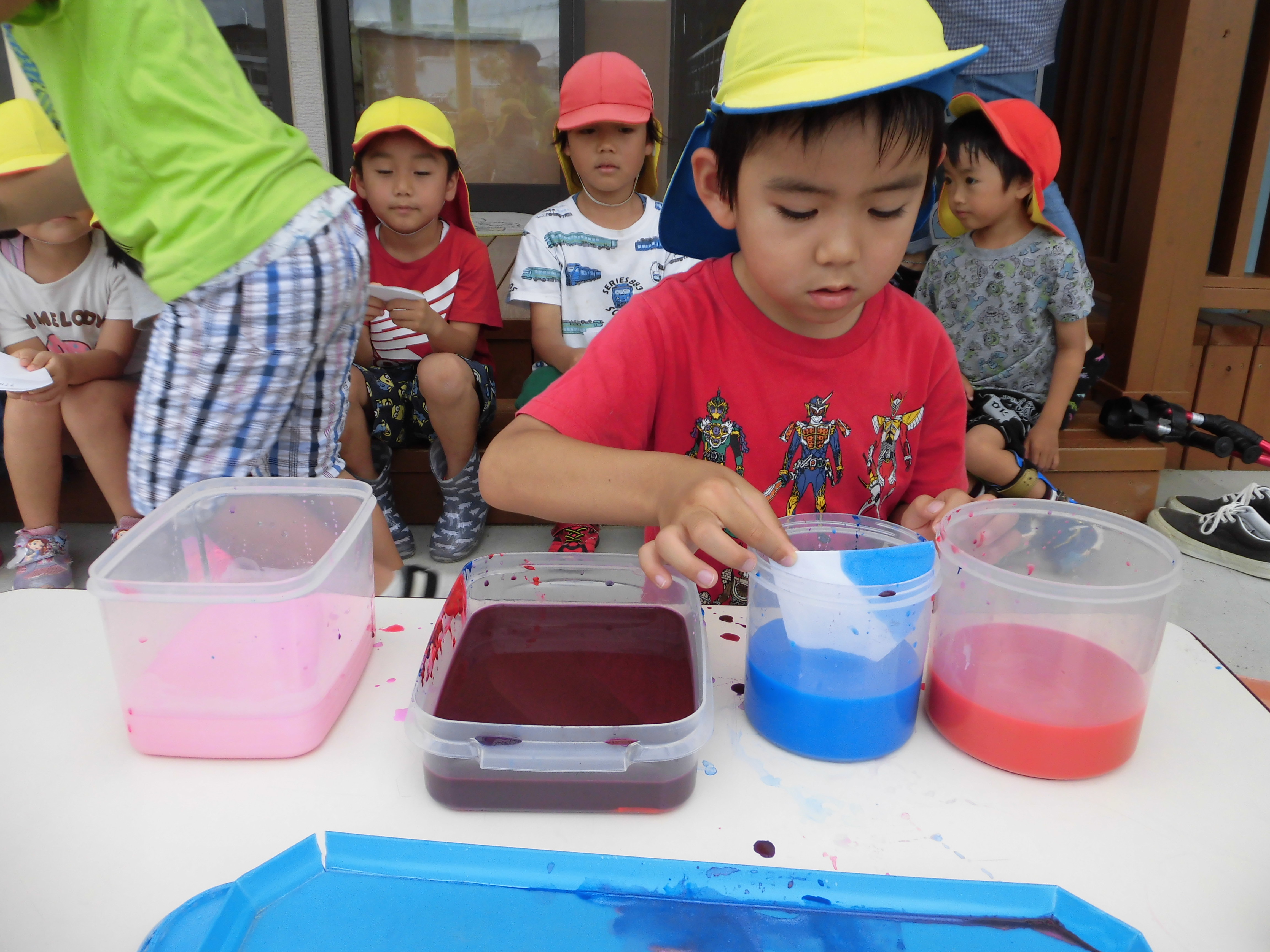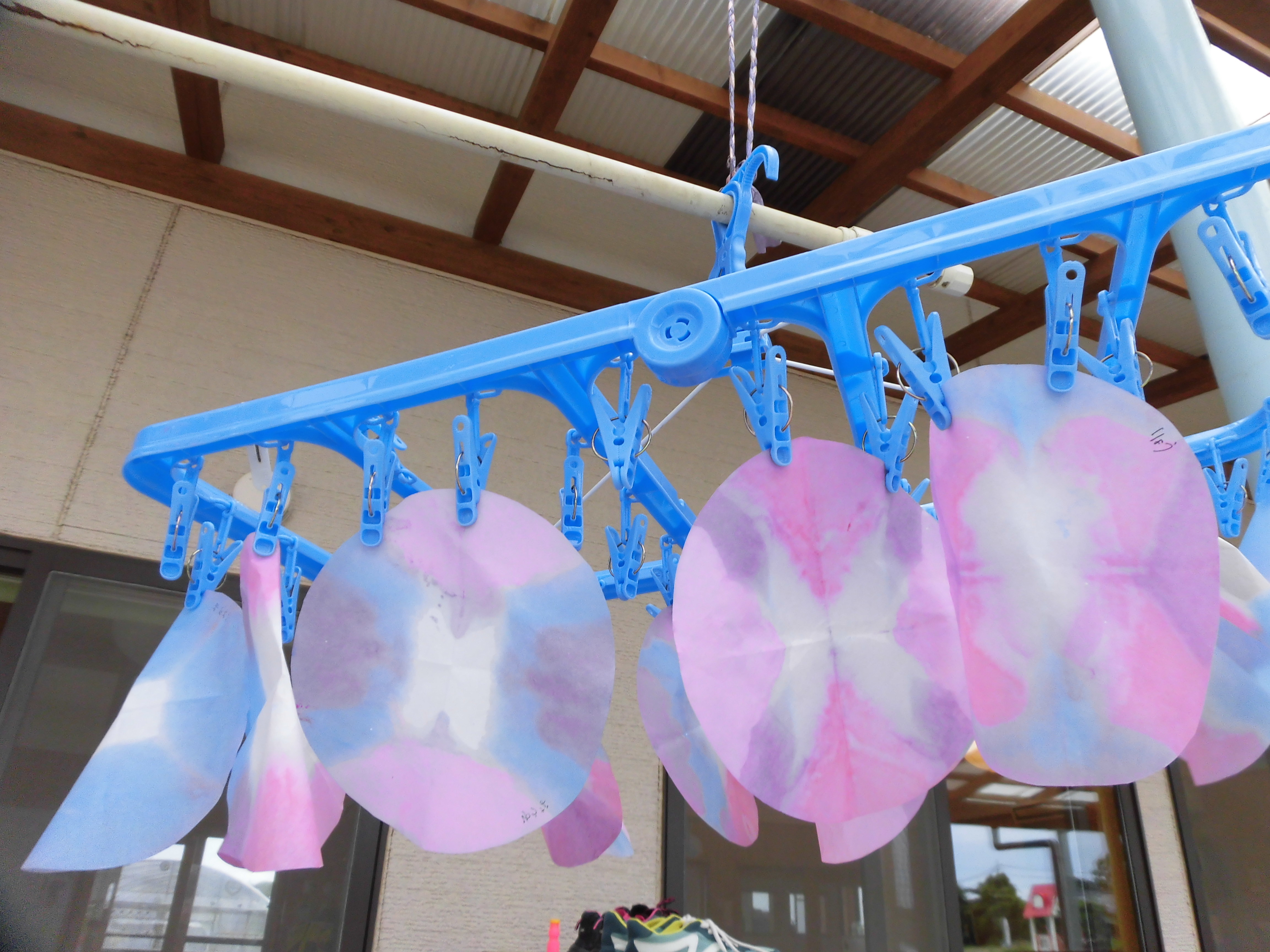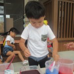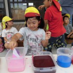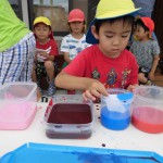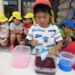 色水あそび 6月6日(水) 和紙に色水をつけて色水あそび。 「赤と青の絵具を混ぜると何色になるか知ってる?」の問いかけに???でしたが、実際に絵具を混ぜて紫色の色水が出来上がると「わあすごい!」と大喜び!! 子どもたちの絵具の付け具合で同じ色を使っても色々な模様が出来上がりました。これを使って、夏祭りの壁面にアジサイの花を飾る予定です。夏祭りが待ちどおしいです。