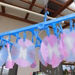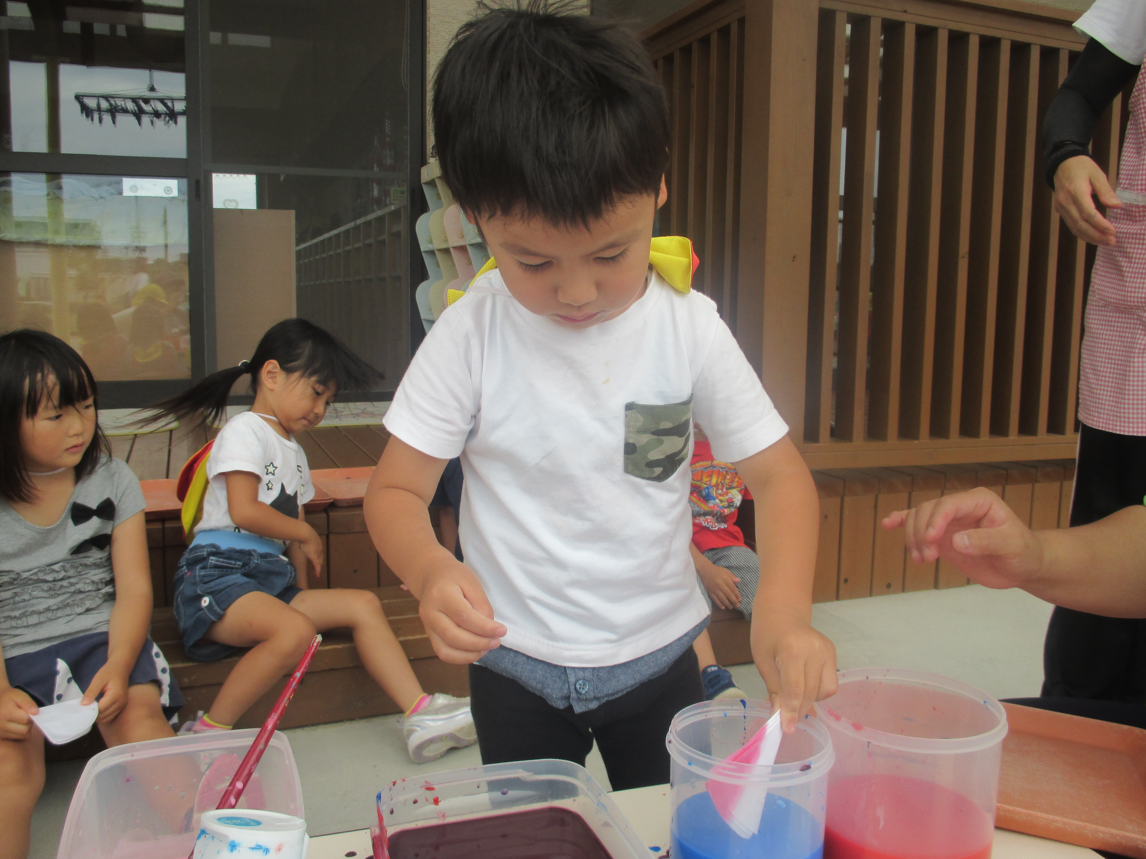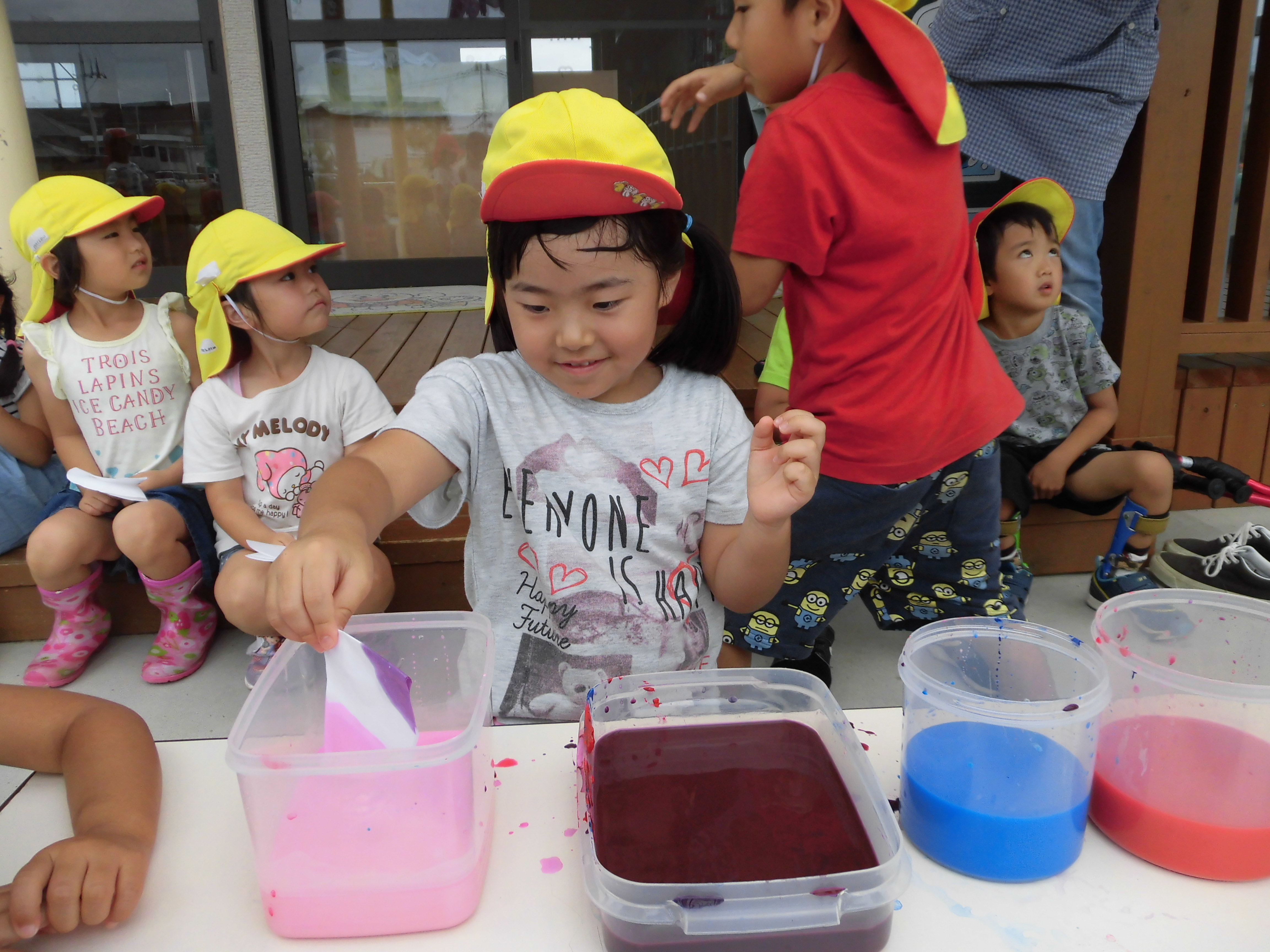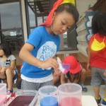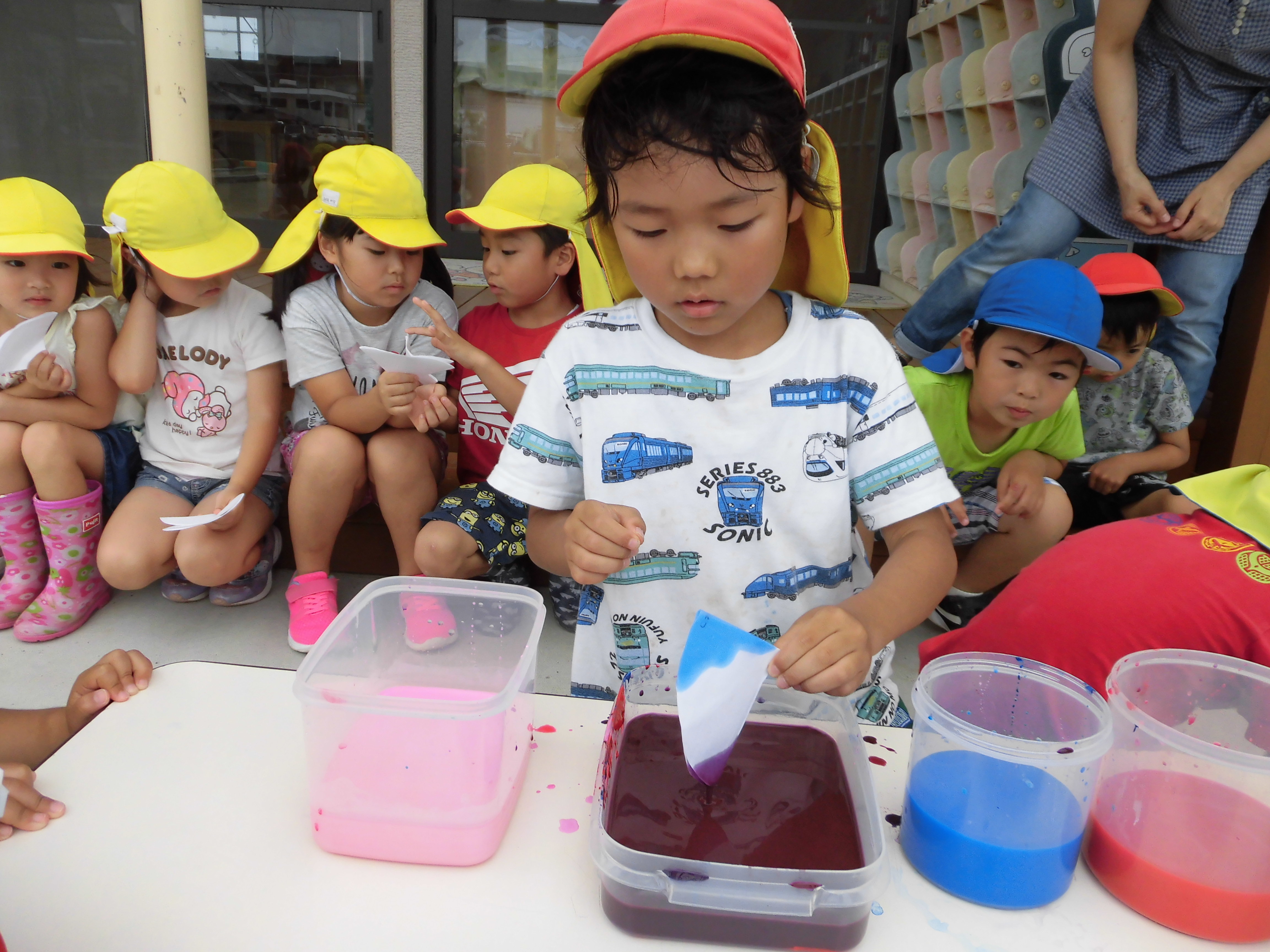 色水あそび 6月6日(水) 和紙に色水をつけて色水あそび。 「赤と青の絵具を混ぜると何色になるか知ってる?」の問いかけに???でしたが、実際に絵具を混ぜて紫色の色水が出来上がると「わあすごい!」と大喜び!! 子どもたちの絵具の付け具合で同じ色を使っても色々な模様が出来上がりました。これを使って、夏祭りの壁面にアジサイの花を飾る予定です。夏祭りが待ちどおしいです。