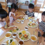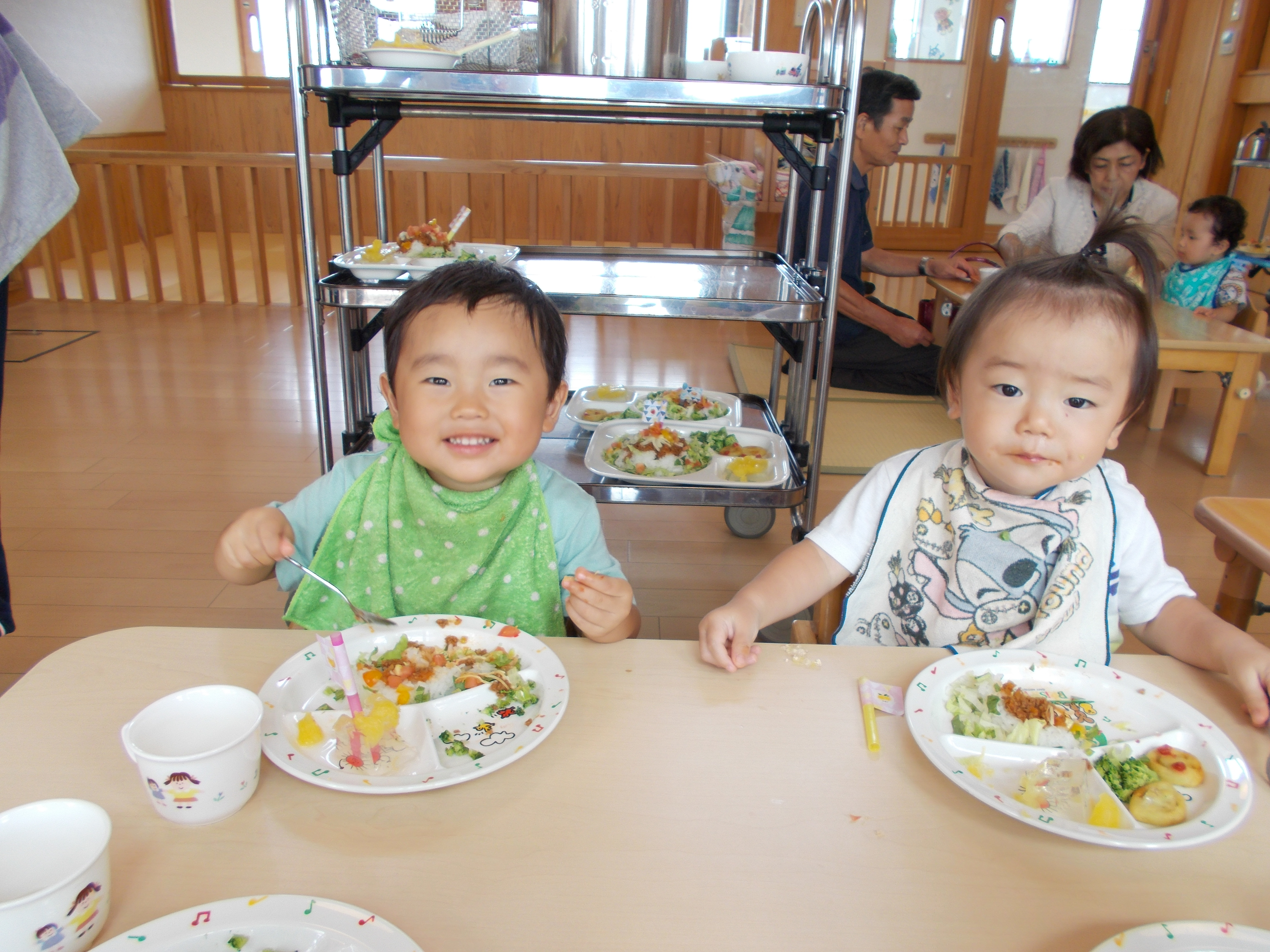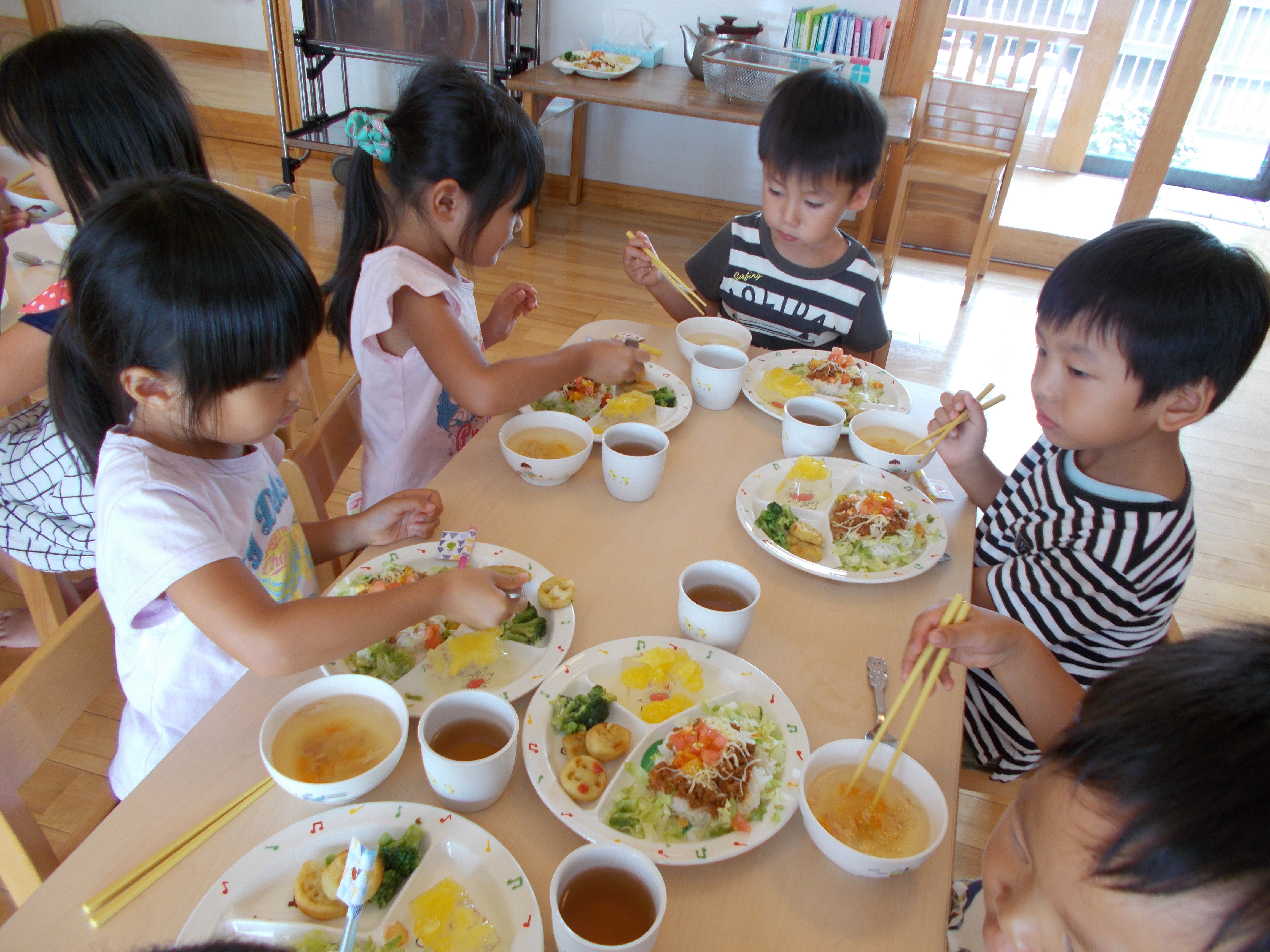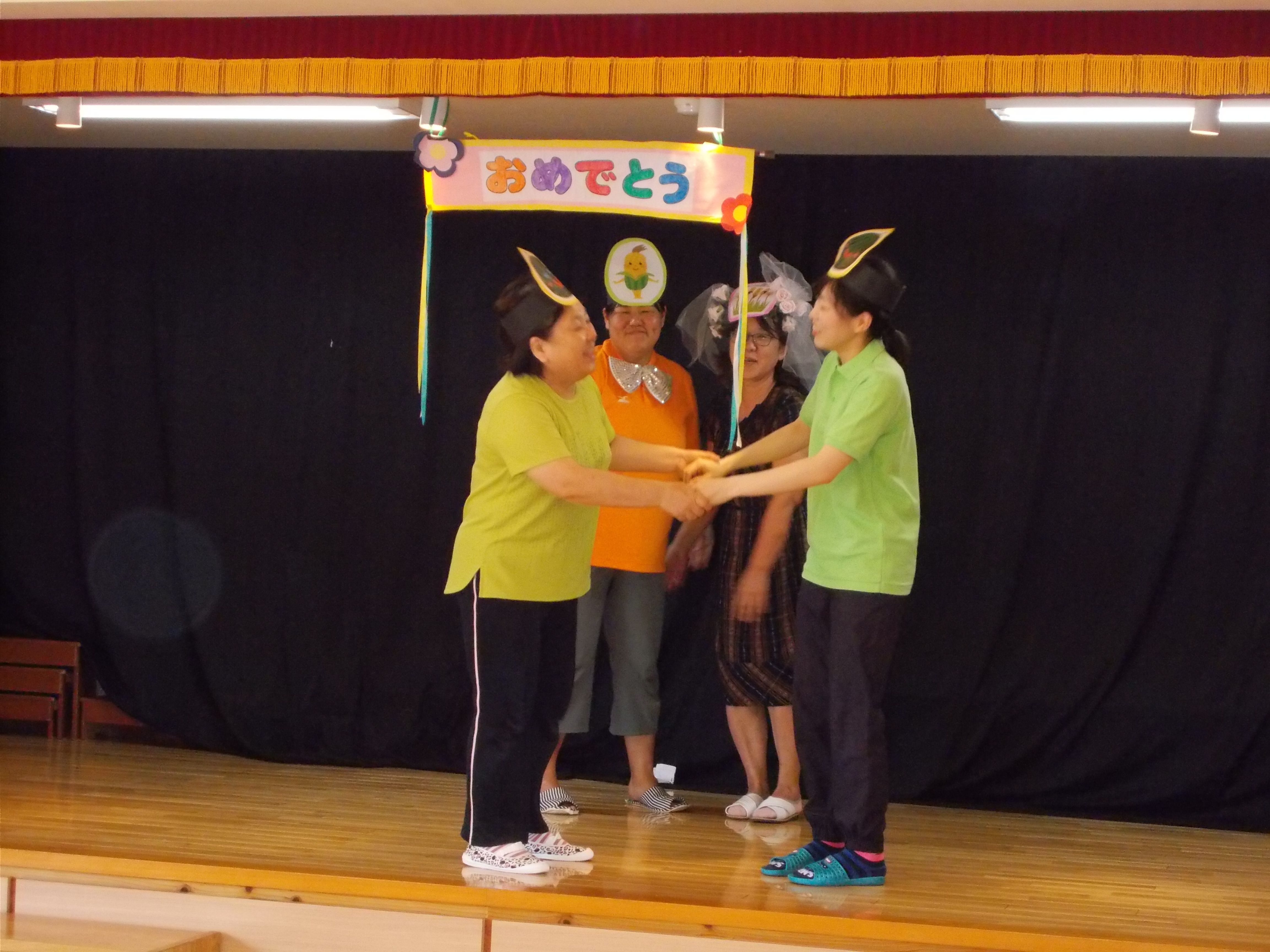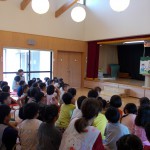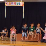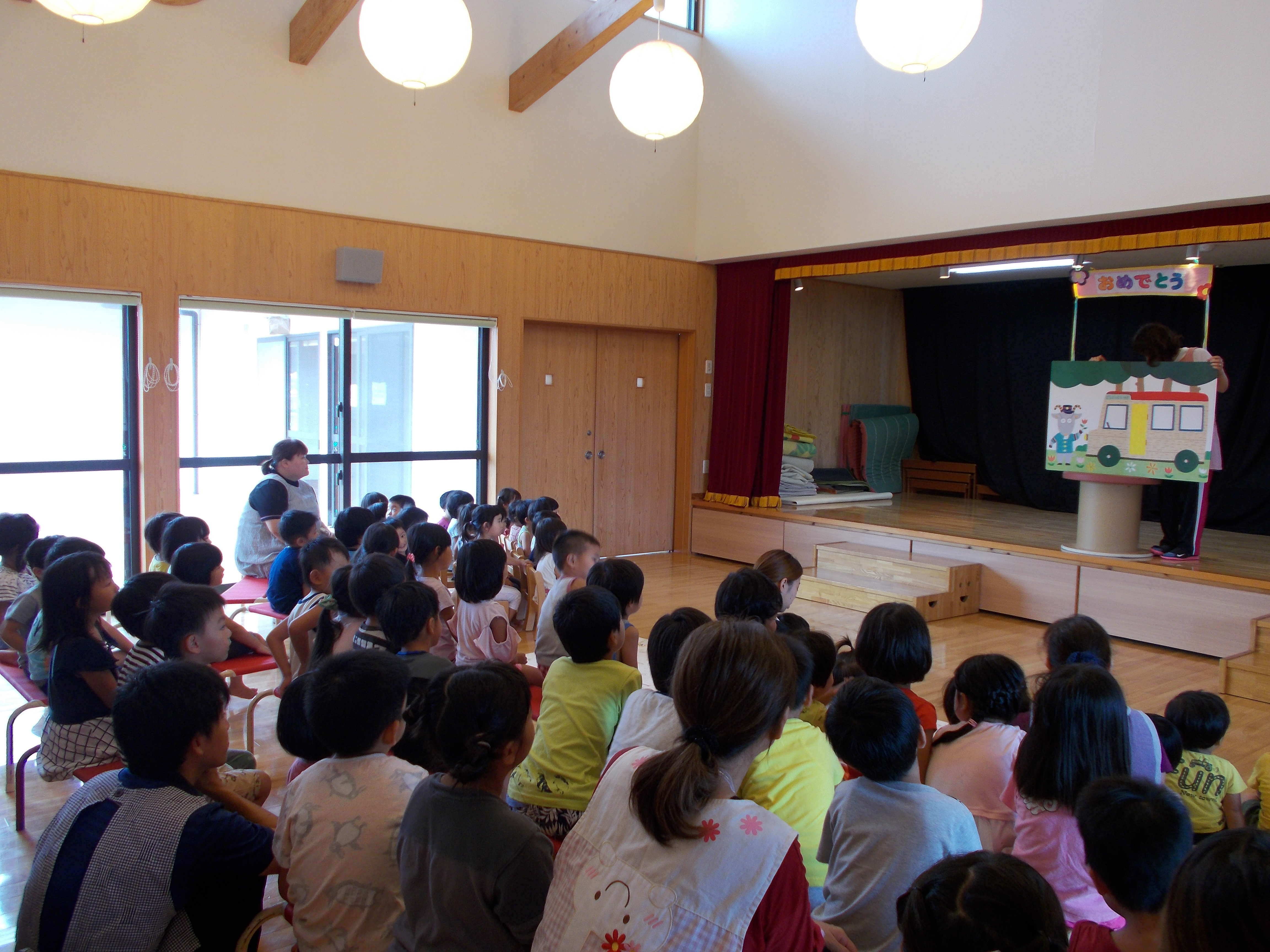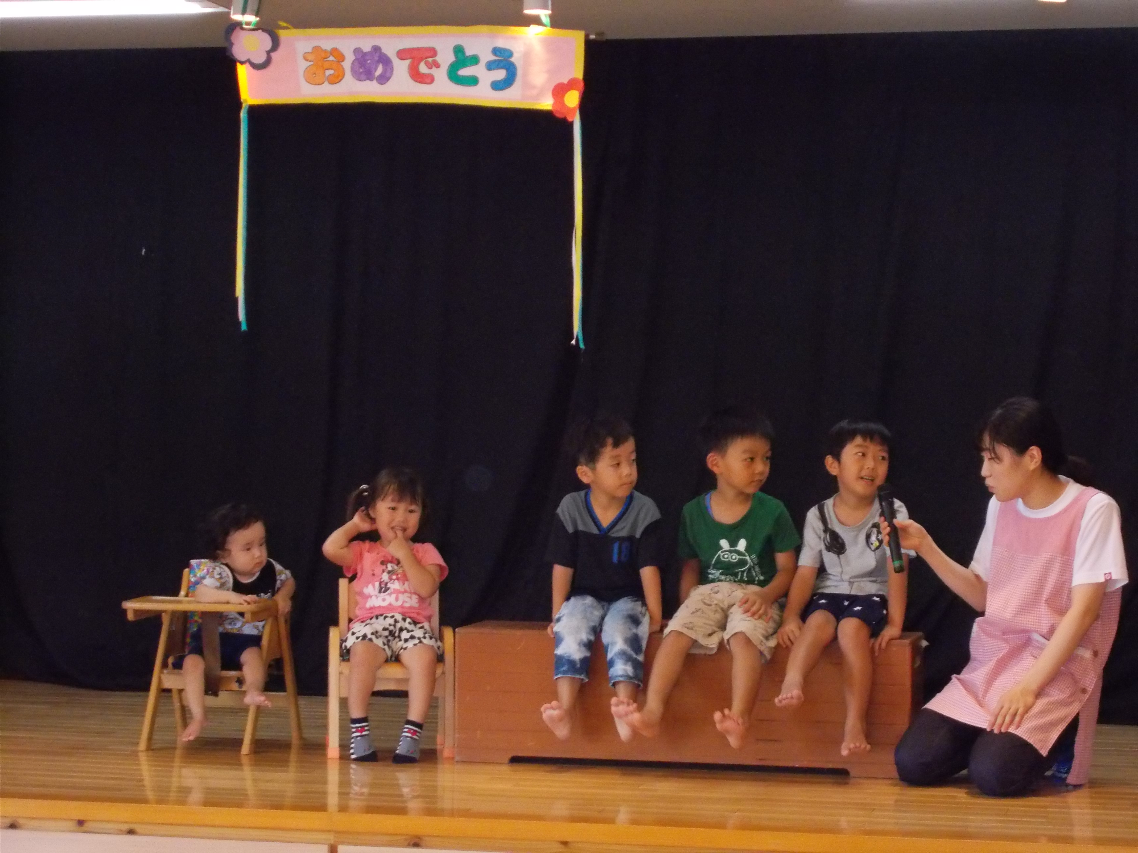 8月の誕生会 8月22日(水) 8月の誕生者は5名でした。 誕生会の歌やインタビューが終わった後、大型絵本を見たり保育士による「すいかの名産地」の歌をアレンジしたオリジナルの劇を楽しみました。 すいかが結婚するという内容で、子どもたちは興味津々。「アッハッハ」と声を出して笑い集中して話を聞くことができました。