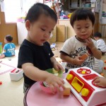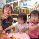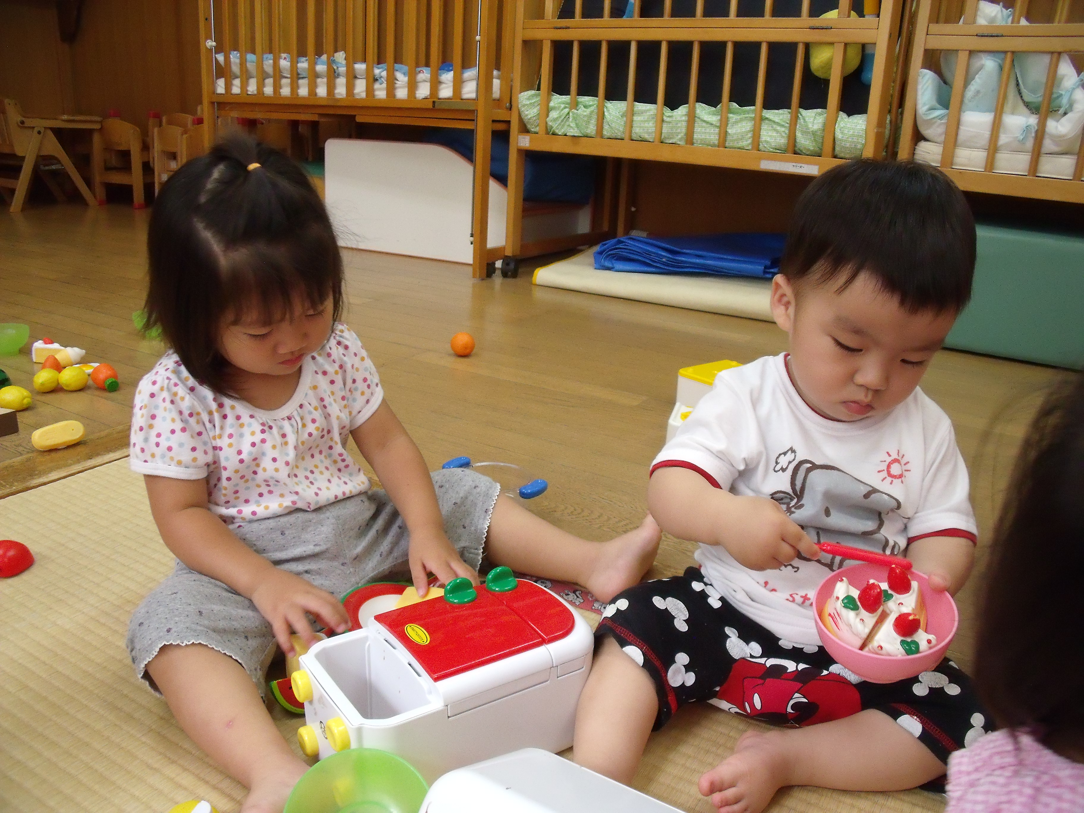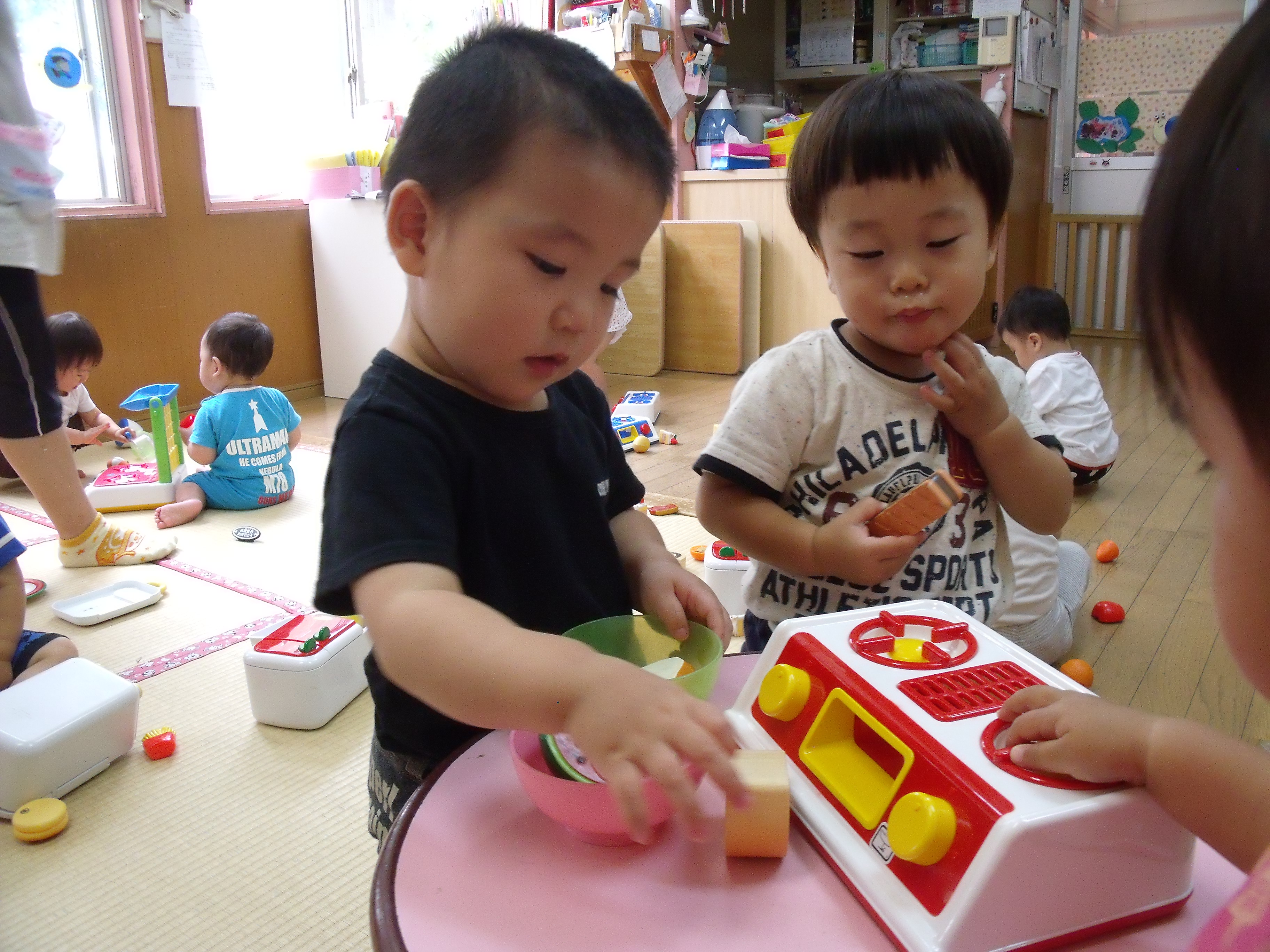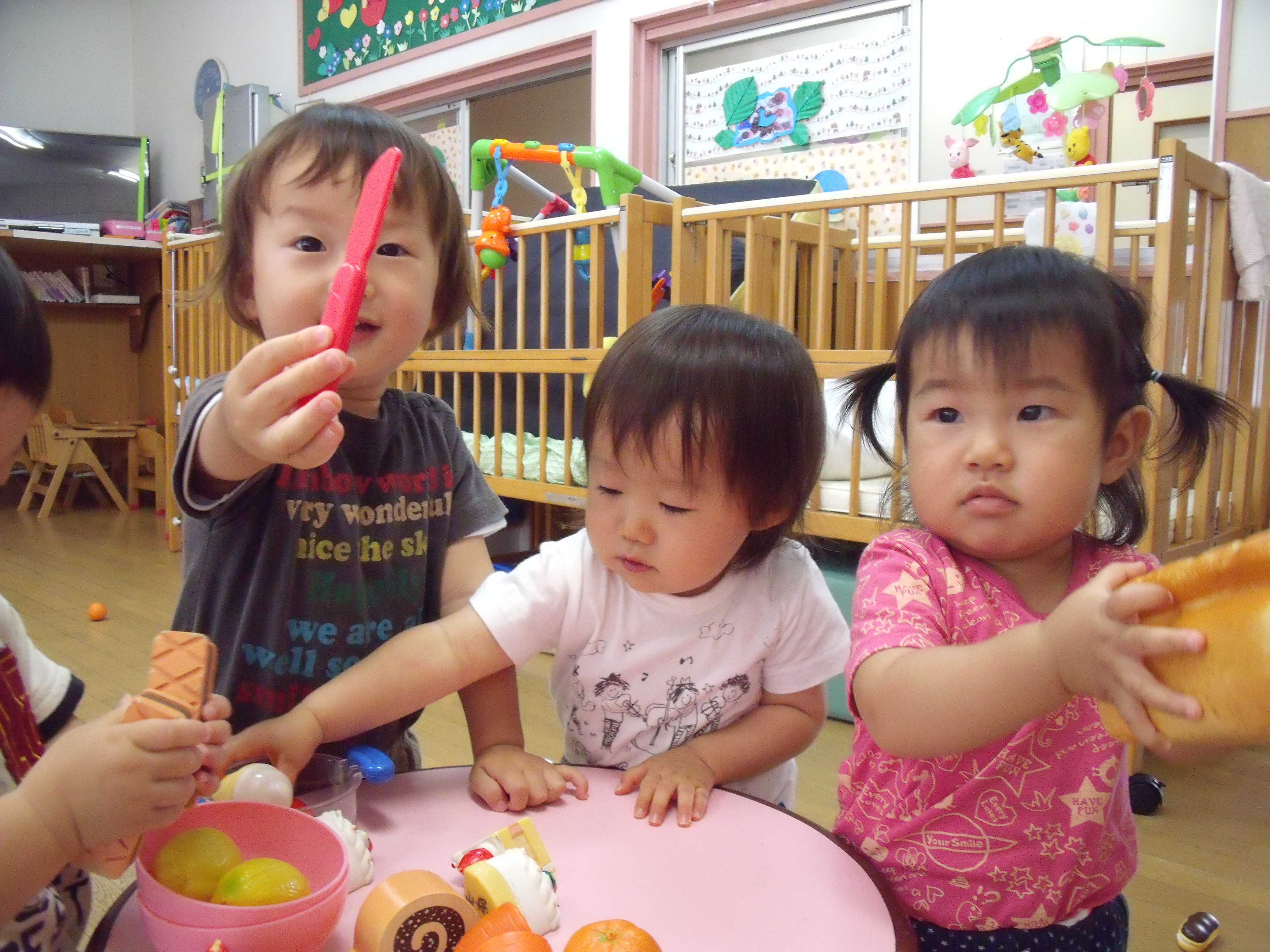 ままごとあそび 5月22日(水) りす組さんが、ままごと遊びを行いました。 『おすすめメニューは、〇〇で~す♪』 『デザートは、ケーキの盛り合わせです』 りす組のシェフ達が、美味しい料理を沢山作ってくれました。