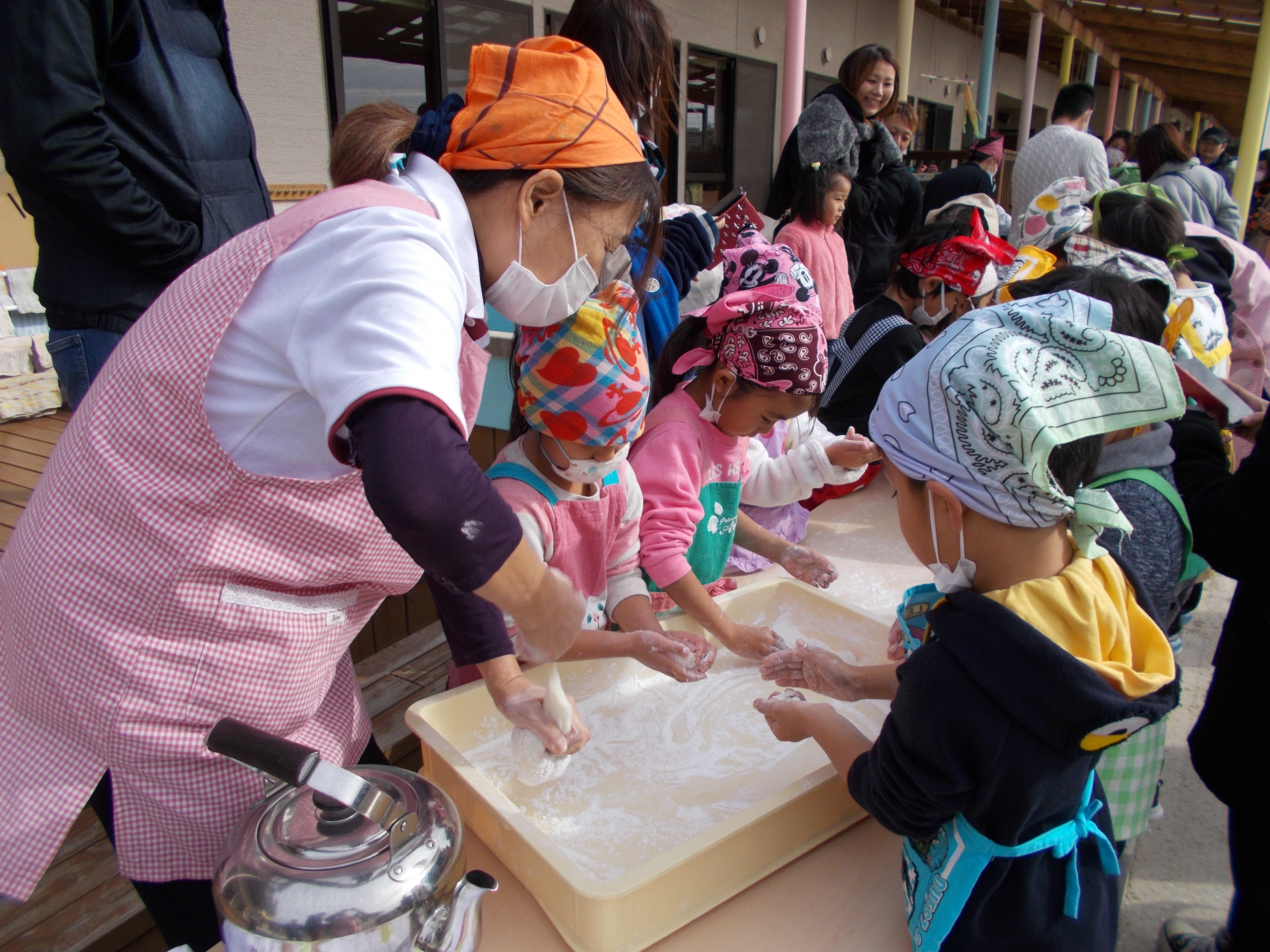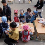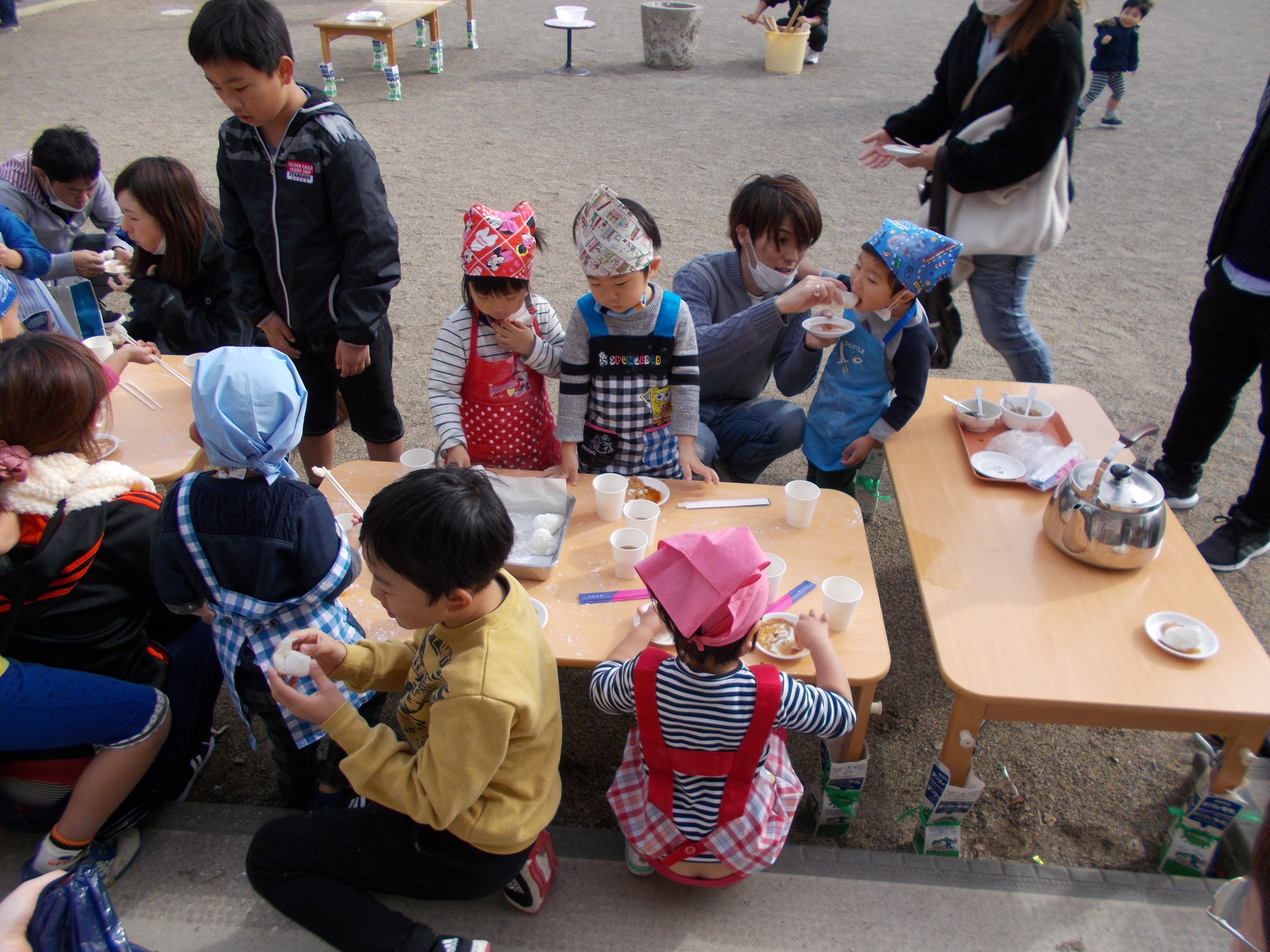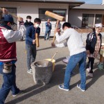 もちつき 12月8日(土) 子どもたちが楽しみにしていたもちつき大会の日。 保護者の方も多数参加していただきました。お父様方がついた後、以上児クラス(3歳から6歳)の子どもたちが順番で、「ペッタンペッタン」ともちつきを楽しみました。 杵が思うように振り上げられなかった子どもたちは、保育士と一緒にもちつきを楽しみました。 もちを丸めて焼き、しょうゆと砂糖をつけるように話をすると、全員嬉しそうにもちをほおばっていました。お正月を迎える前の伝統行事。大切にしていきたいですね。