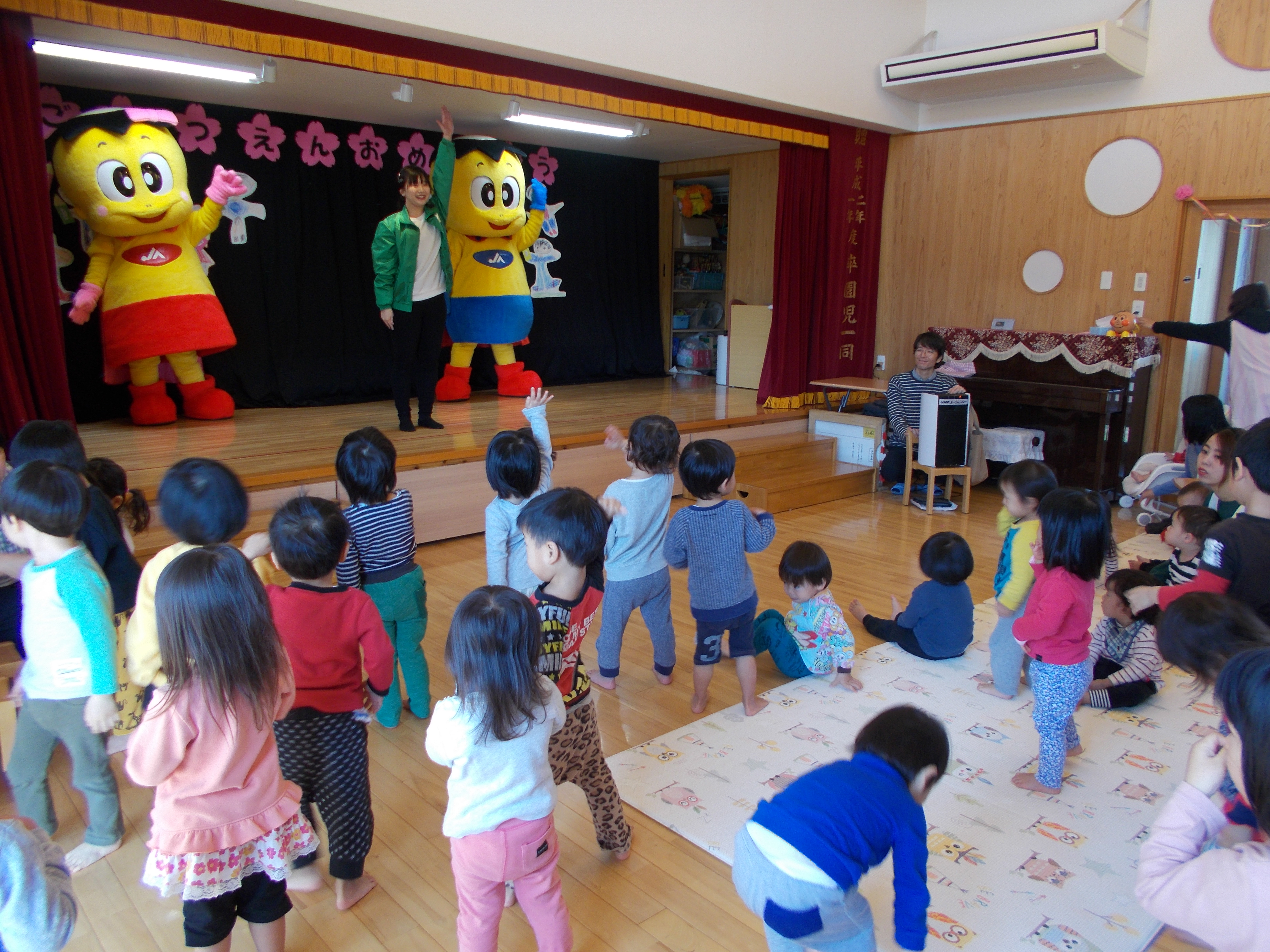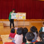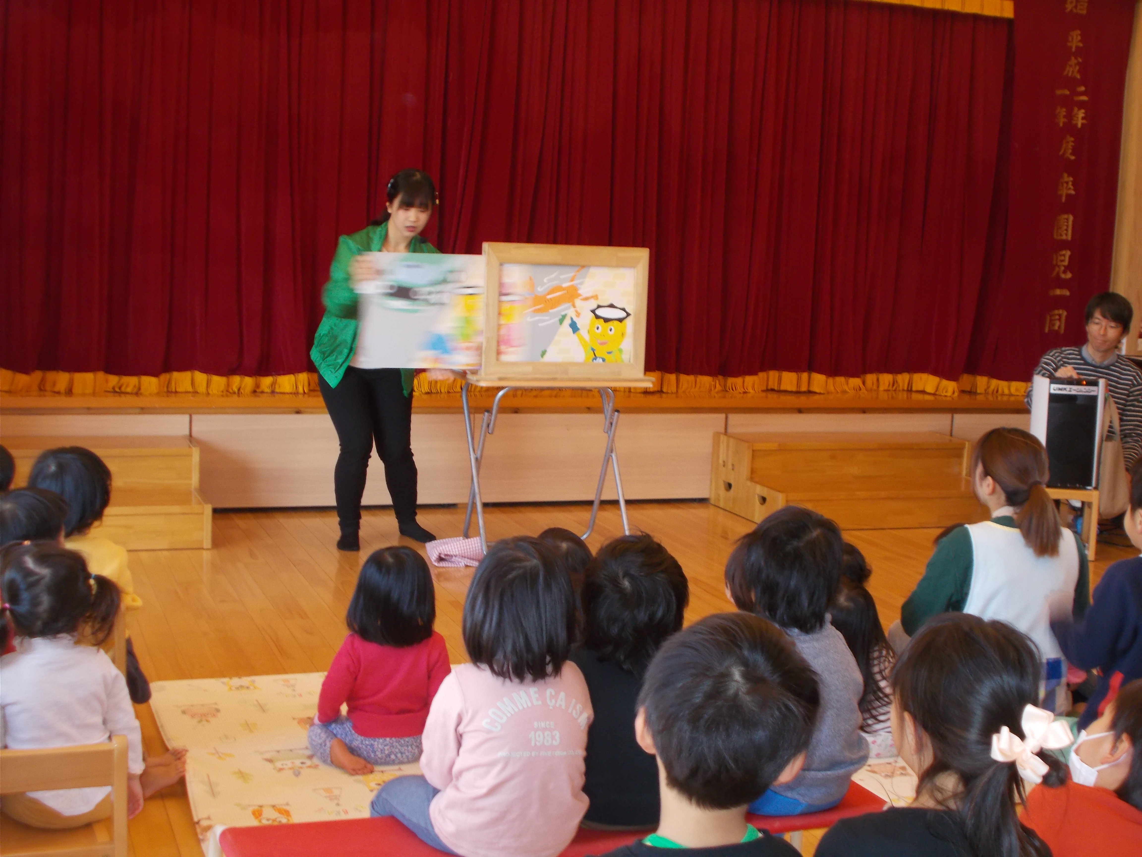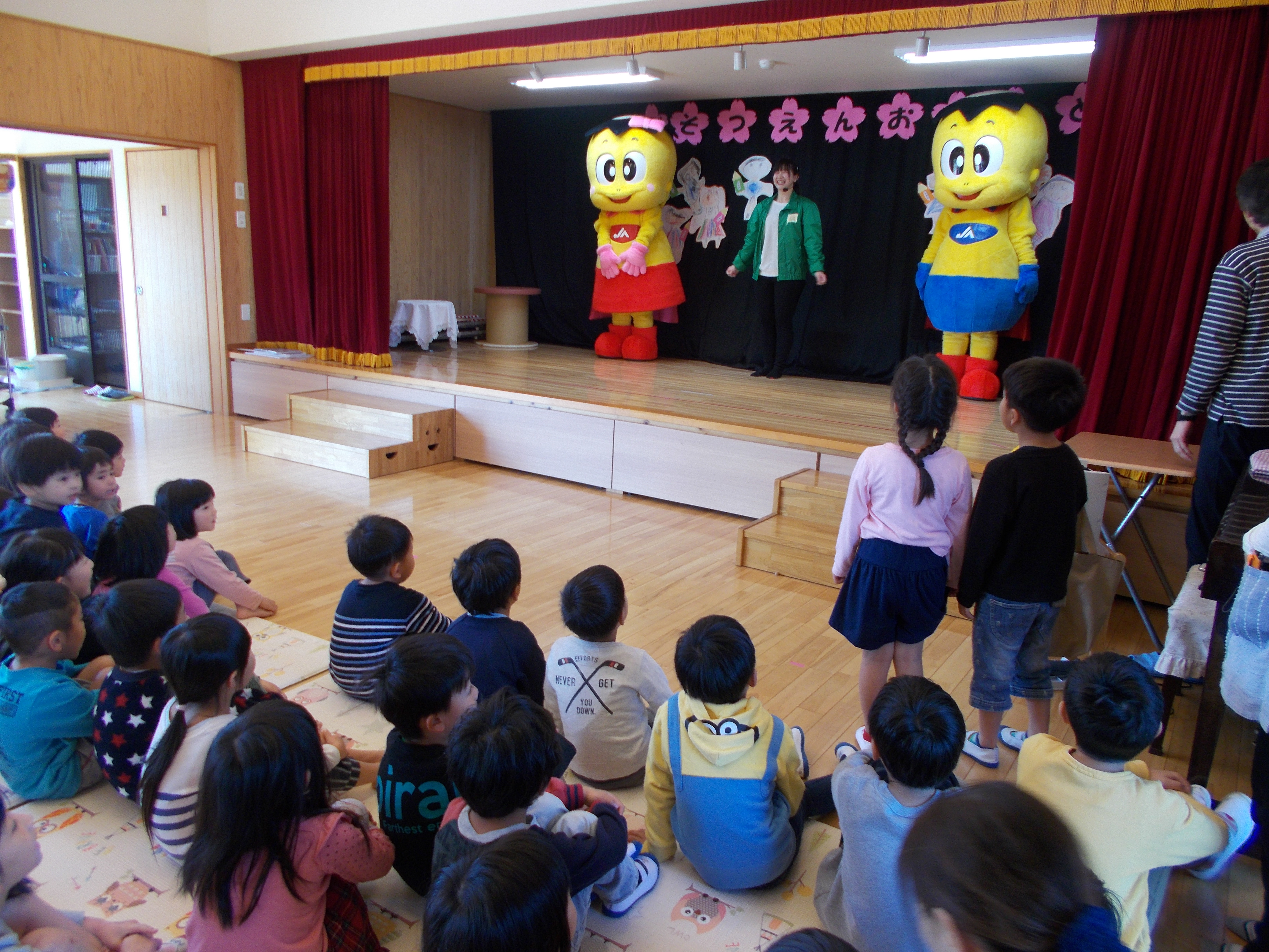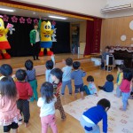 紙芝居「ハピハピ山へえんそく」を見たり、ハッピーくんハピコちゃんと一緒に交通安全体操を楽しみました。