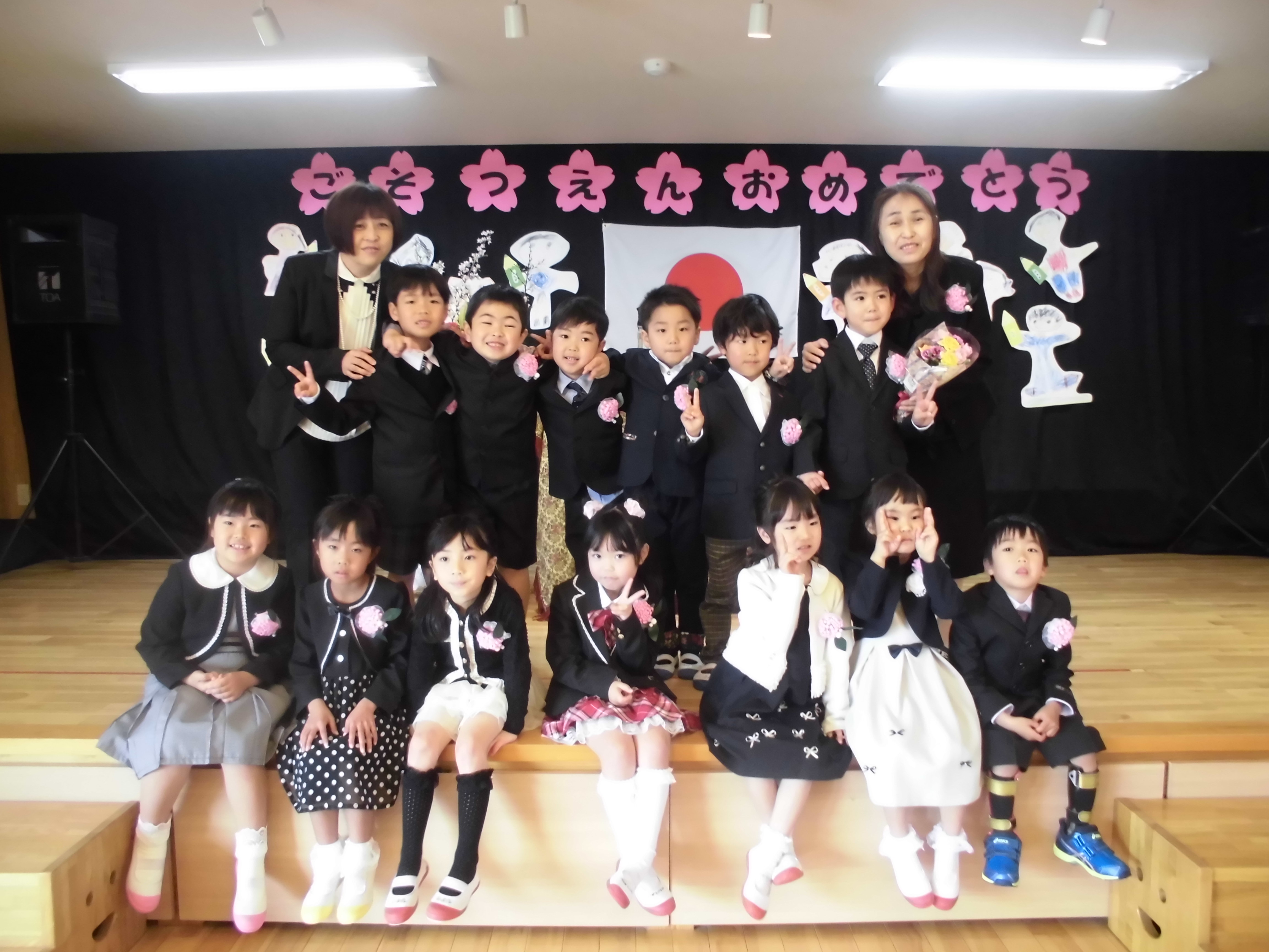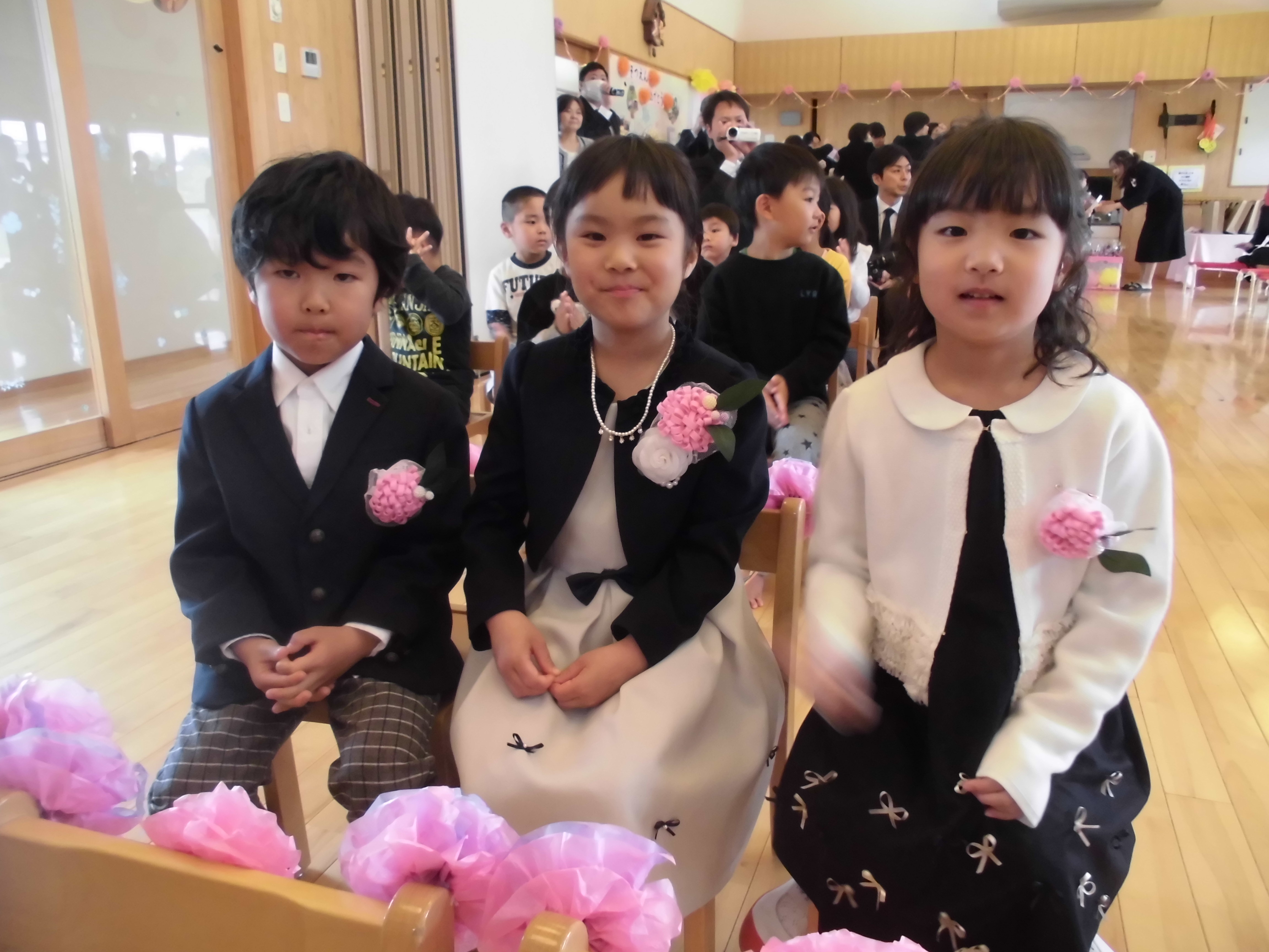 卒園式 、 3月23日(土) 卒園式が行われました。 大きな声で返事をし、卒園証書を受け取る姿やお別れの言葉や歌など、立派に成長した姿を見せてくれました。式が進行していく中、お別れが淋しいのか涙ぐむ子どももいました。 4月からはそれぞれの小学校に入学し1年生になります。たくさん友達を作り楽しい学校生活を送ってくださいね。また、保育園にも遊びに来てください。
