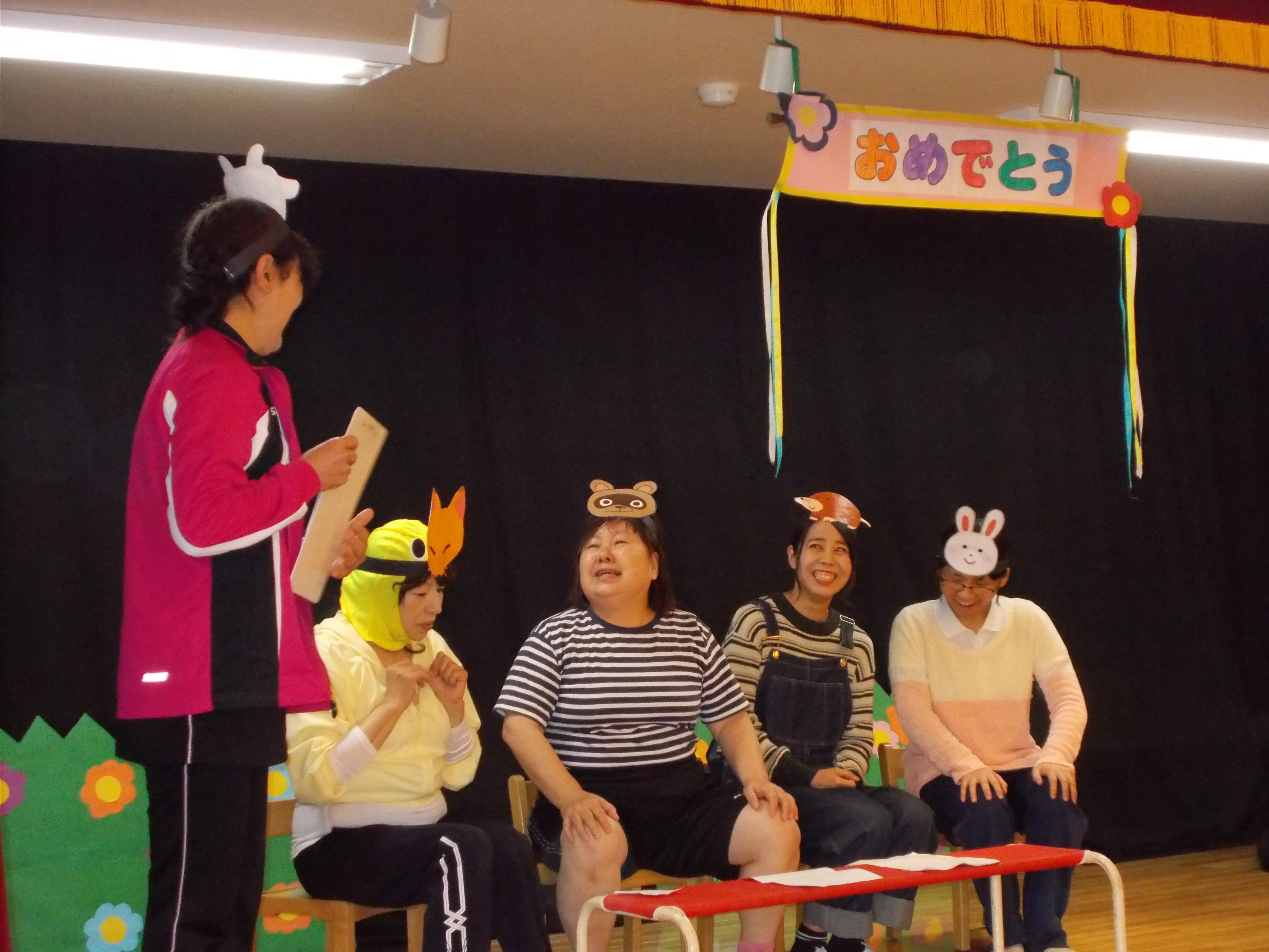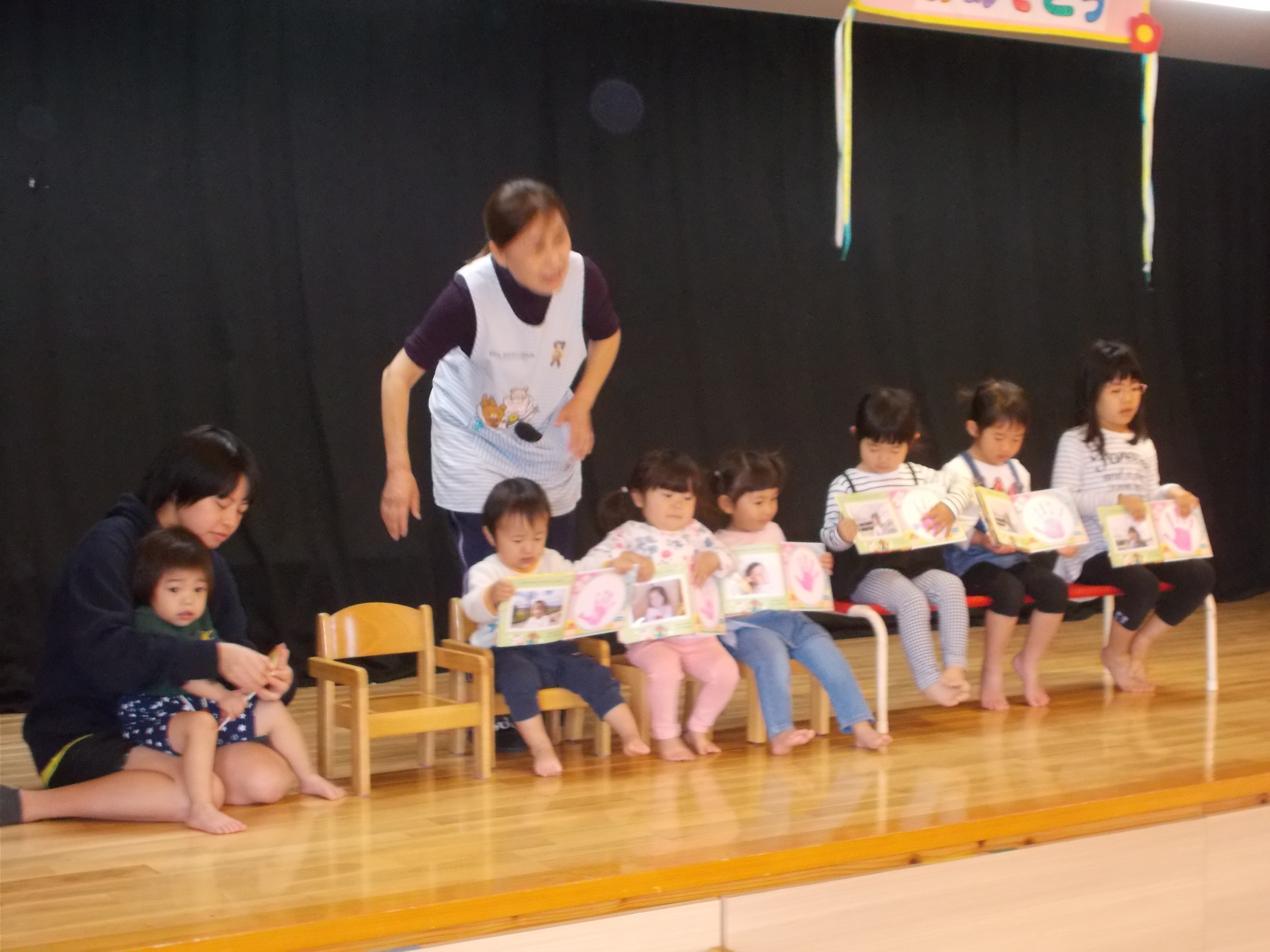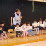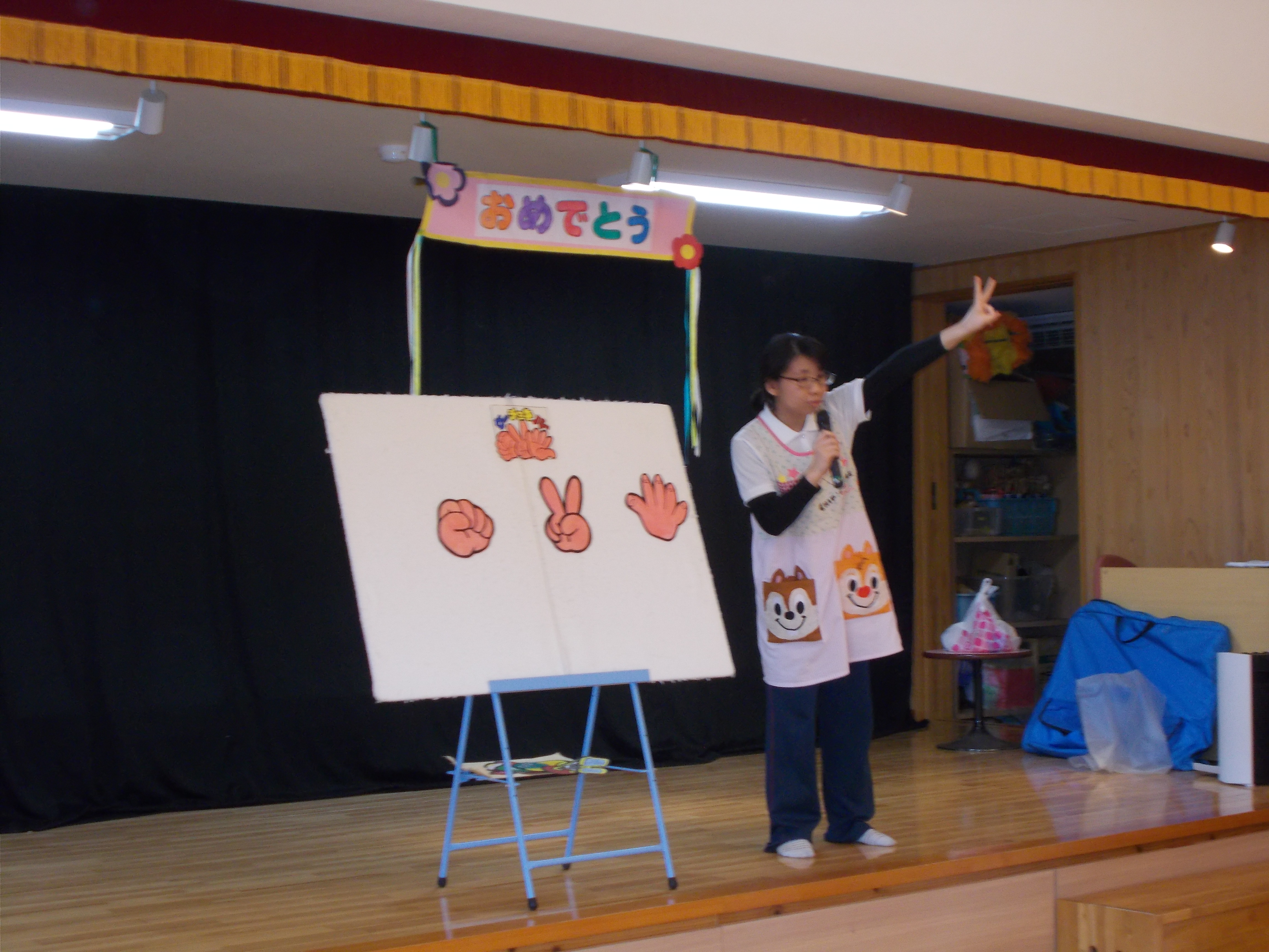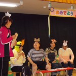 グーチョキパーの手遊びや絵本「しゅくだい」をアレンジした劇を見て楽しみました。かわいい動物に変身した保育士を見て子どもたちは大喜び!!