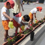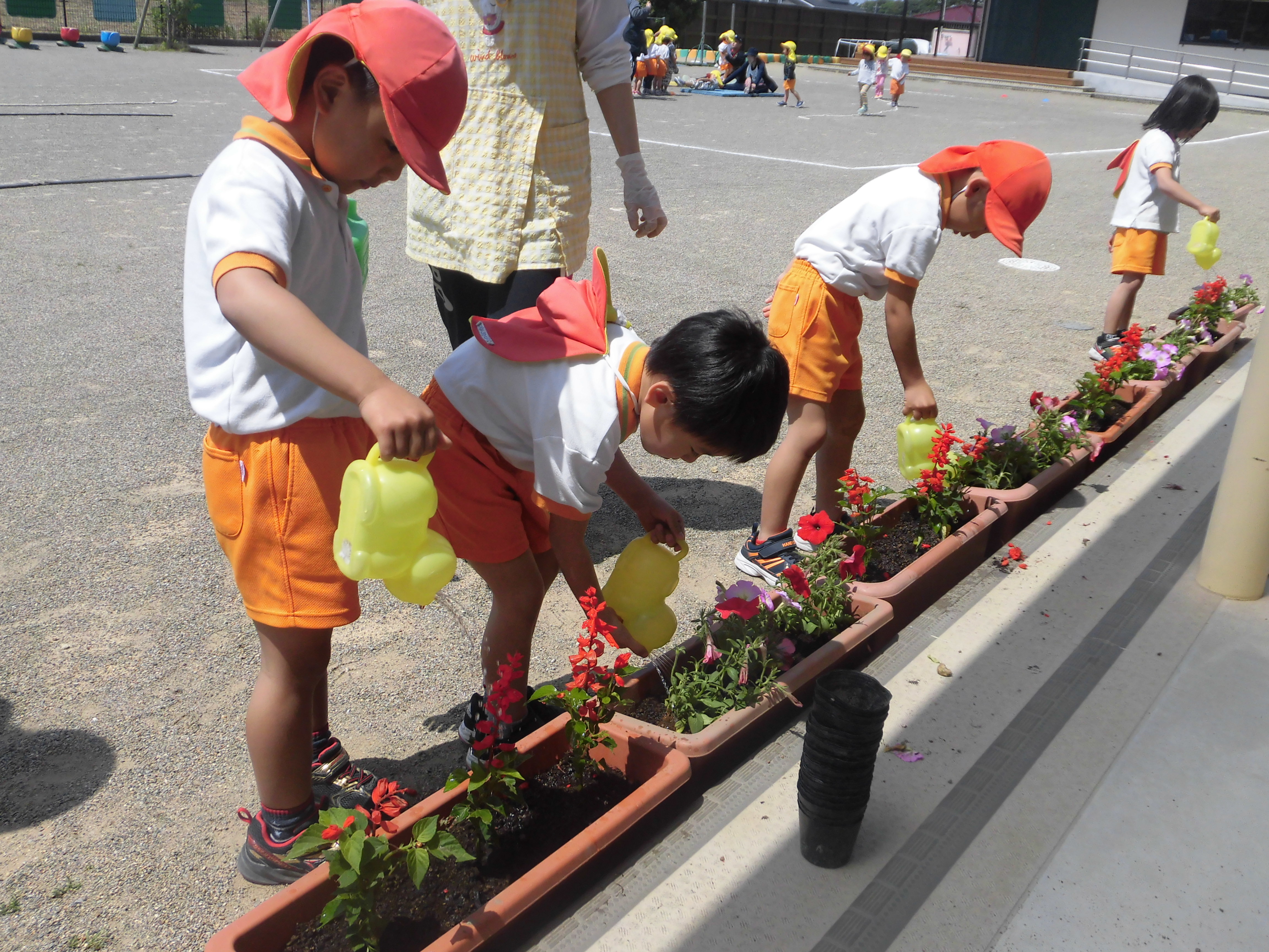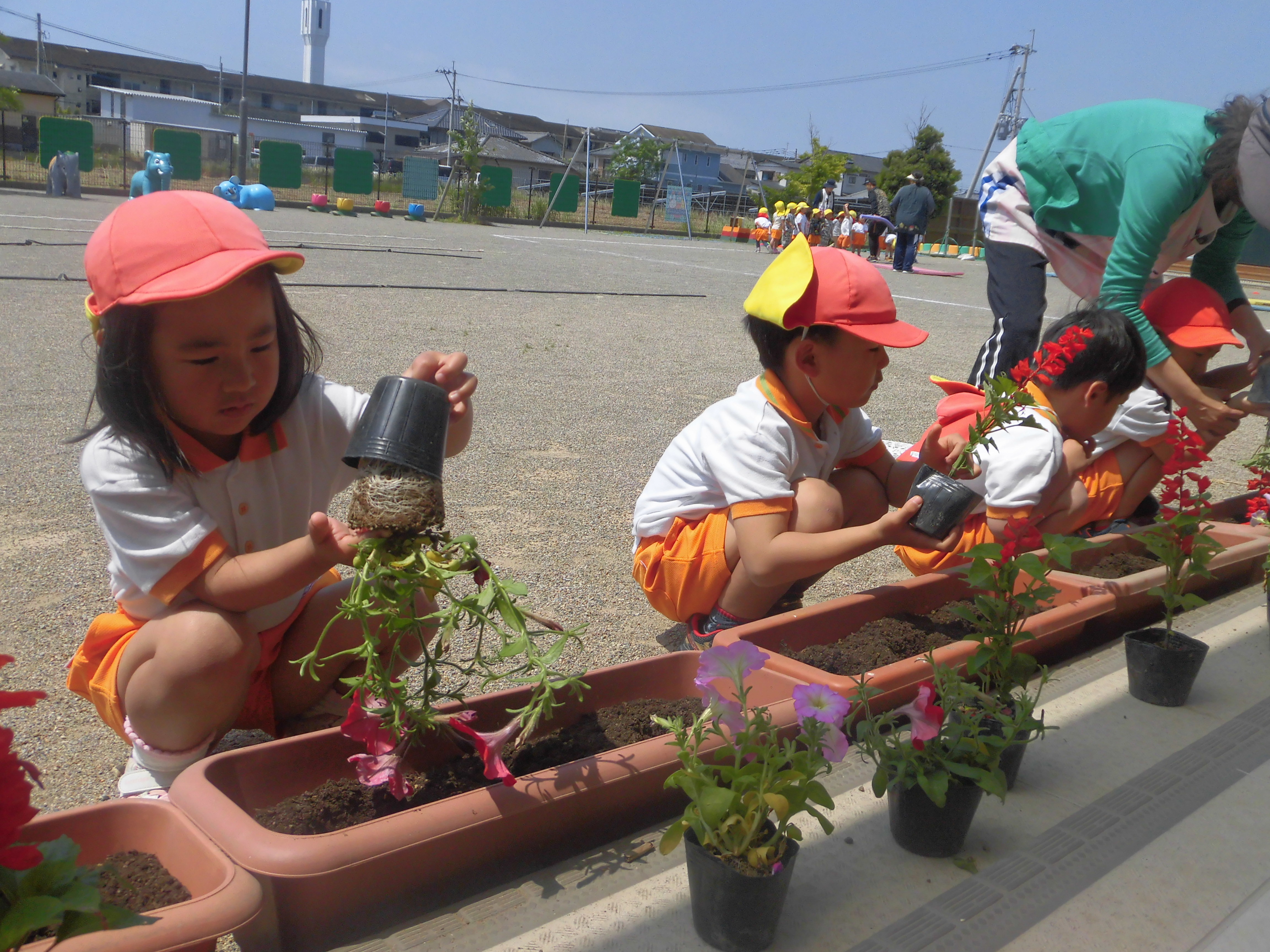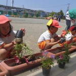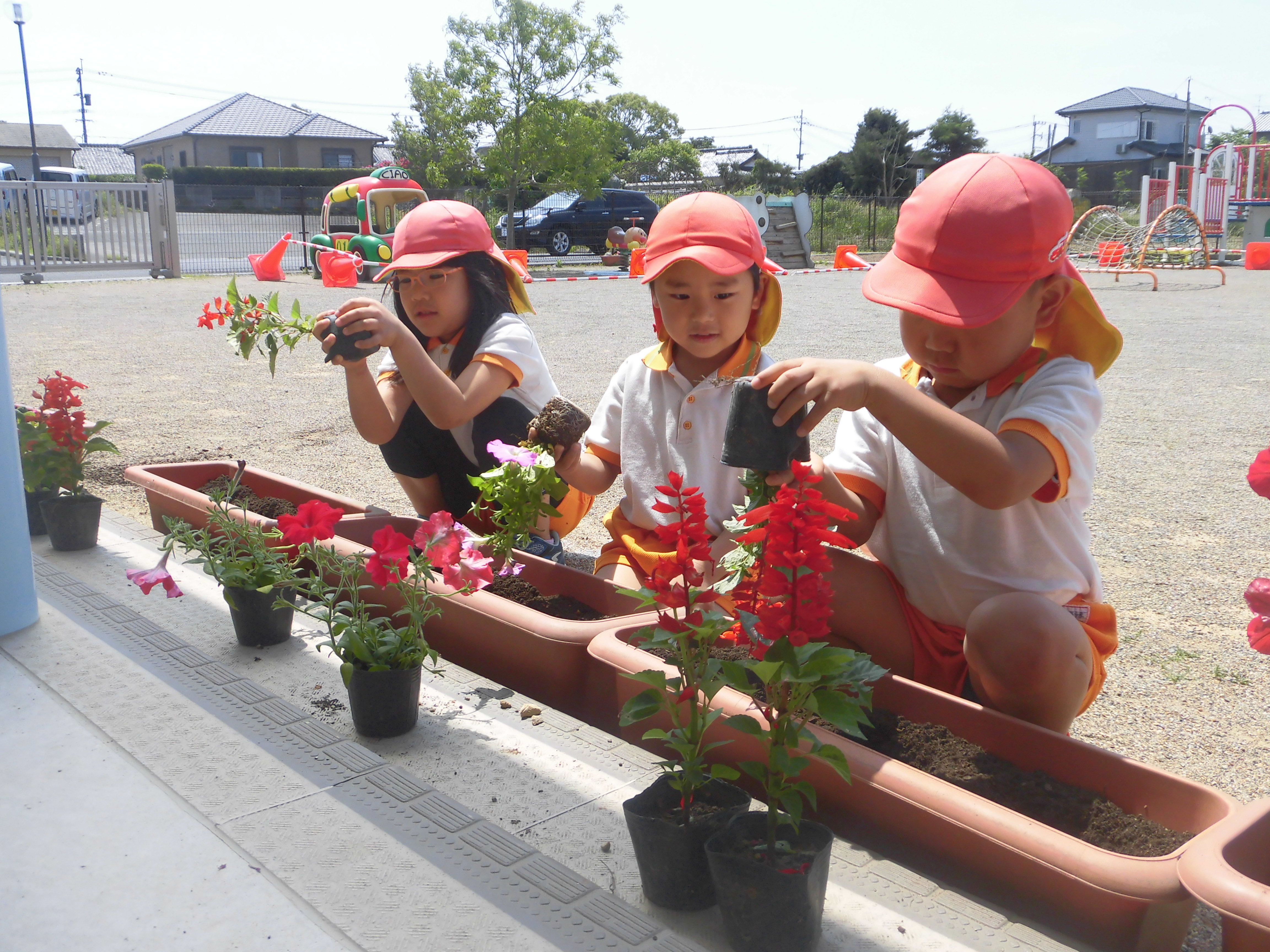 花の苗植え 5月7日(火) サルビアとペチュニアの花の苗植えをしました。 スコップで穴を掘りフラワーポットからゆっくりと苗を出し植えました。「赤い花かわいいね。」「お水たくさんかけるね。」と言いながら嬉しそうに如雨露で水まきをしました。 園庭がぱっと明るくなりました。