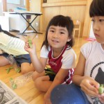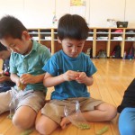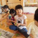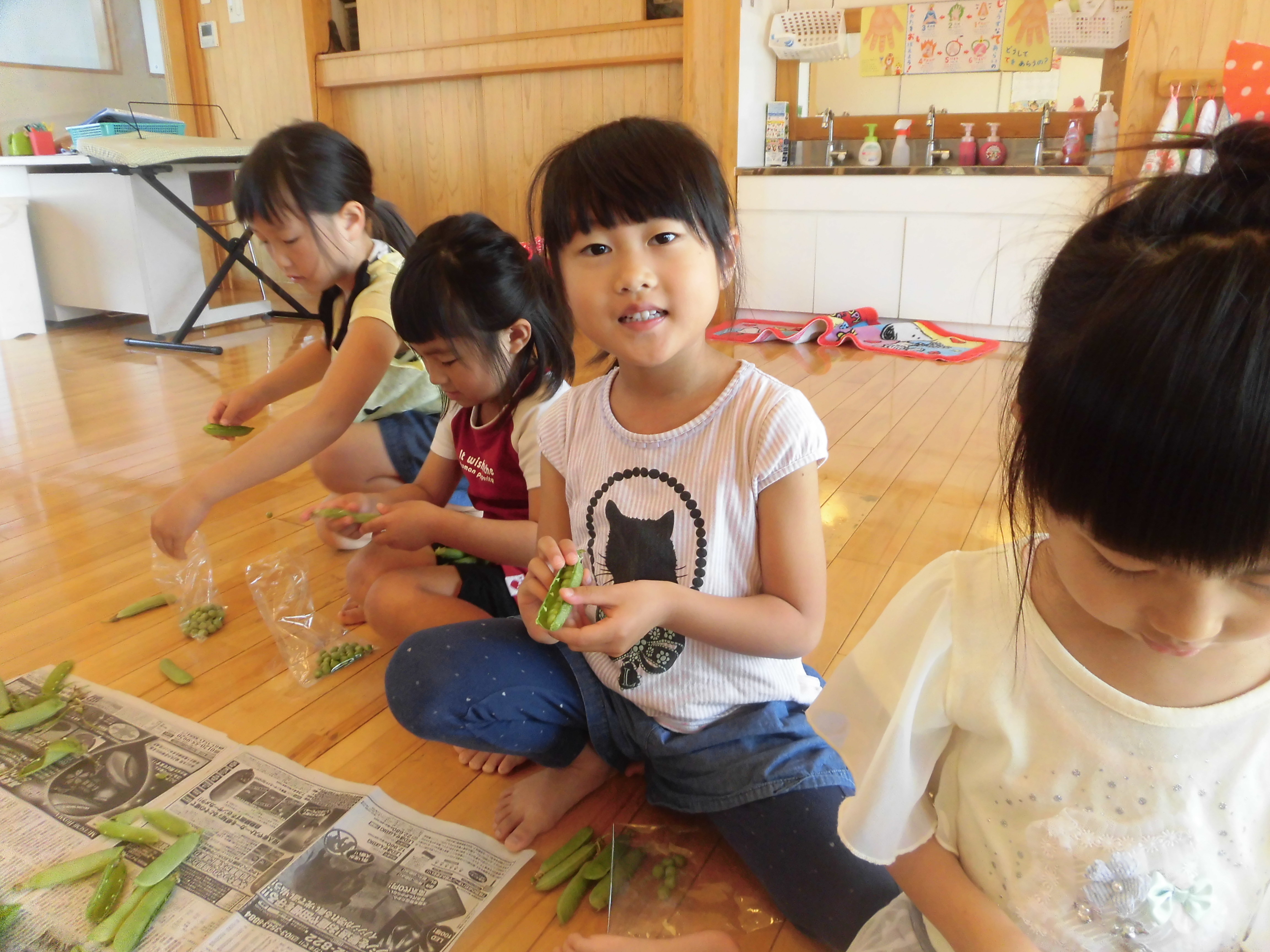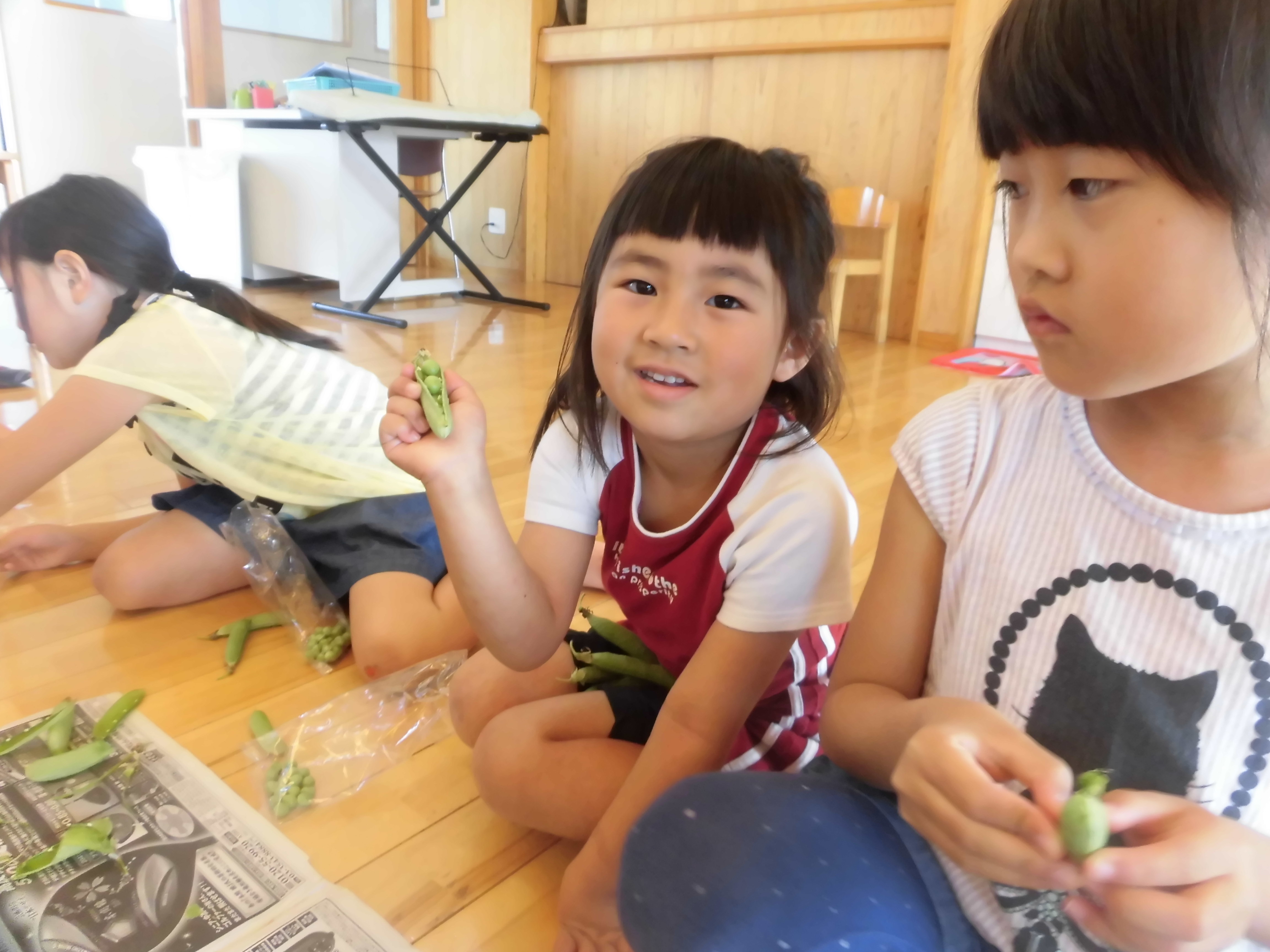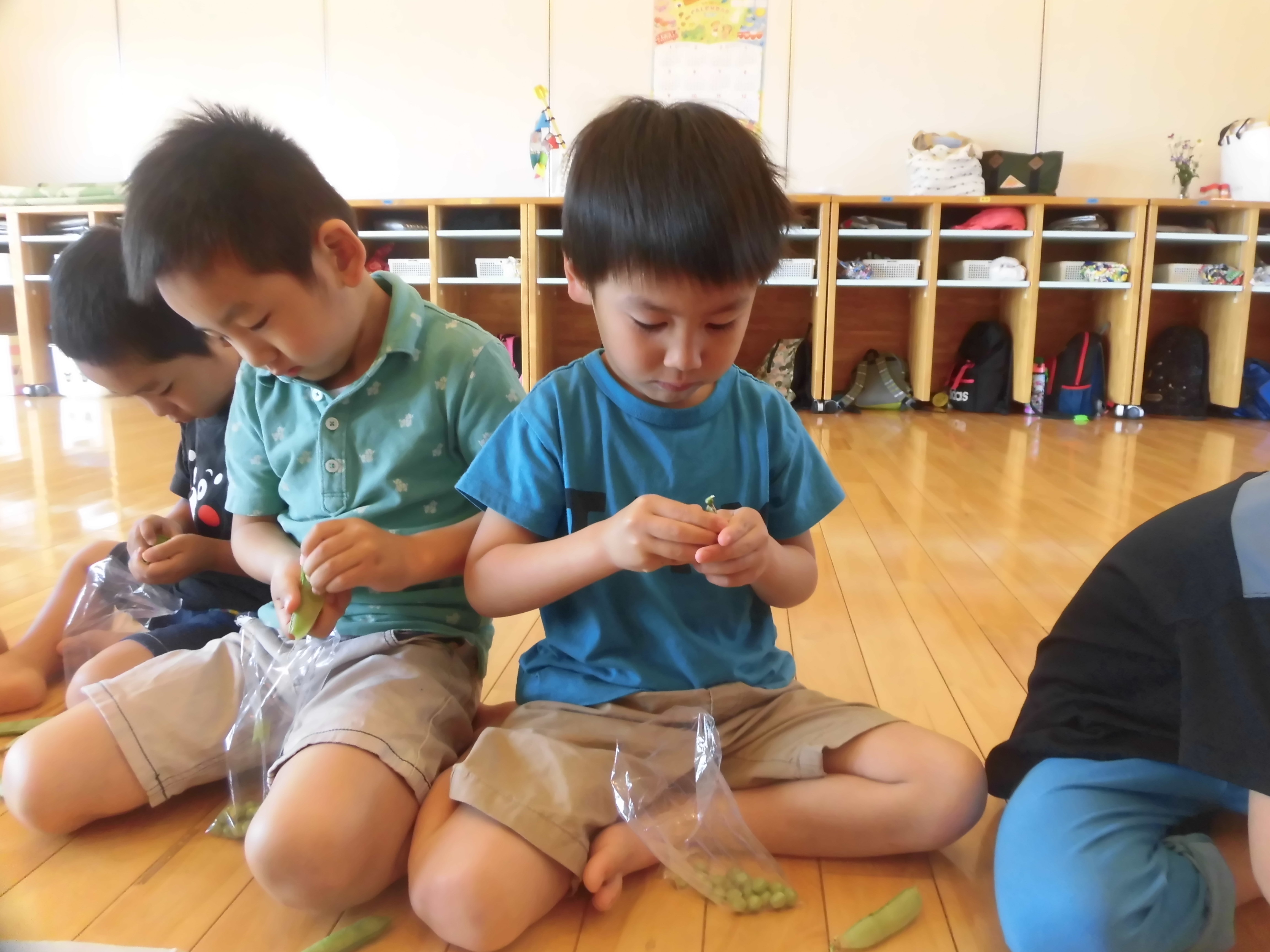 えんどう豆の皮むき 5月8日(水) えんどう豆の皮むきをしました。皮をむくとコロコロ転がるので、ゆっくりゆっくりと皮をむきました。 「赤ちゃん豆が入っているよ。」「おいしそう。」等と子どもたちは大喜び!! お家に持って帰り、美味しくいただきました。